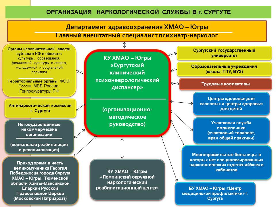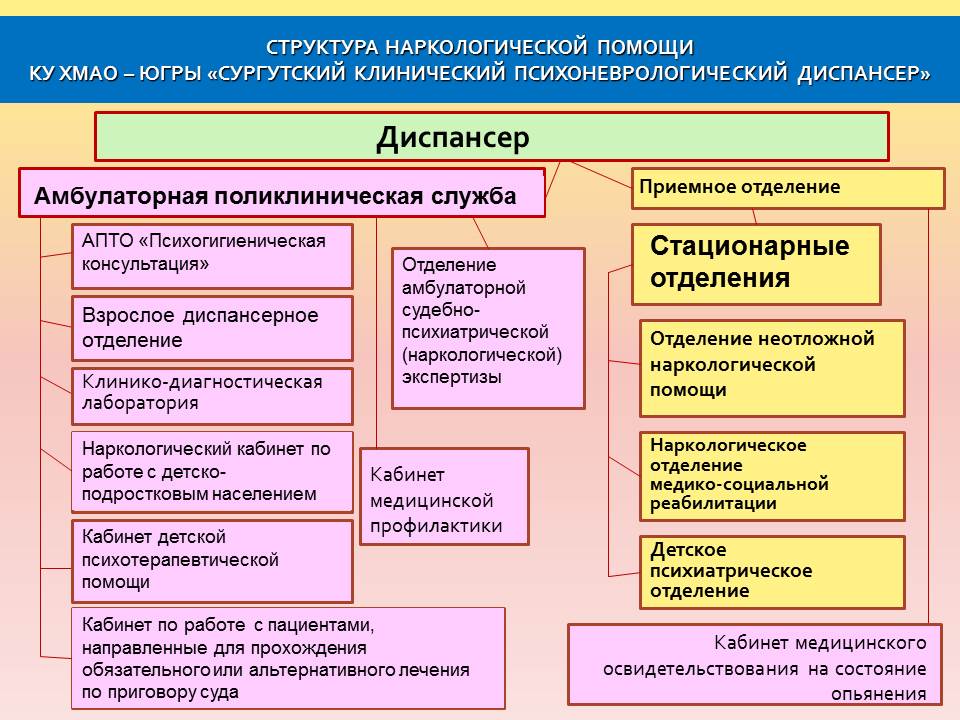 В течение 2014 года наркологическая помощь населению города Сургута активно приводилась в соответствие с Порядком оказания медицинской помощи по профилю «наркология», утвержденным приказом Минздрава РФ от 15.11.2012 № 929н. На сегодняшний день КУ ХМАО – Югры «Сургутский клинический психоневрологический диспансер» имеет в своем составе следующие профильные подразделения: