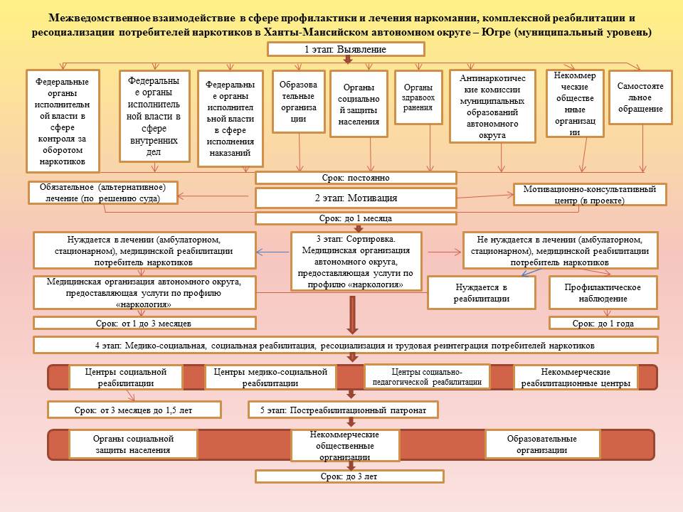 Ведение пациентов с наркотической зависимостью, направленных для прохождения обязательного и альтернативного лечения, в нашем учреждении осуществляется в соответствии: с методическими рекомендациями «Организация лечения и медико-социальной реабилитации больных наркоманией, совершивших преступление небольшой тяжести и получивших отсрочку отбывания наказания», подготовленные ФГБУ «Государственный научный центр социальной и судебной психиатрии имени В. П. Сербского» Минздрава России и ФГБУ «Национальный научный центр наркологии» Минздрава России и Приказом Департамента здравоохранения ХМАО – Югры № 1245 от 10.12.2014 «Об организации лечения и медико-социальной реабилитации больных наркоманией, совершивших нетяжелое преступление и получивших отсрочку отбывания наказания». Так, в 2014 году в нашем учреждении организован отдельный кабинет для наблюдения и лечения пациентов, которым по решению суда назначено обязательное или альтернативное лечение по поводу наркотической зависимости. За 2014 год по г. Сургуту обратилось 59 таких граждан. Из них 25 человек благополучно прошли курс лечения, 8 – продолжают терапию, остальные прервали лечение по разным причинам.