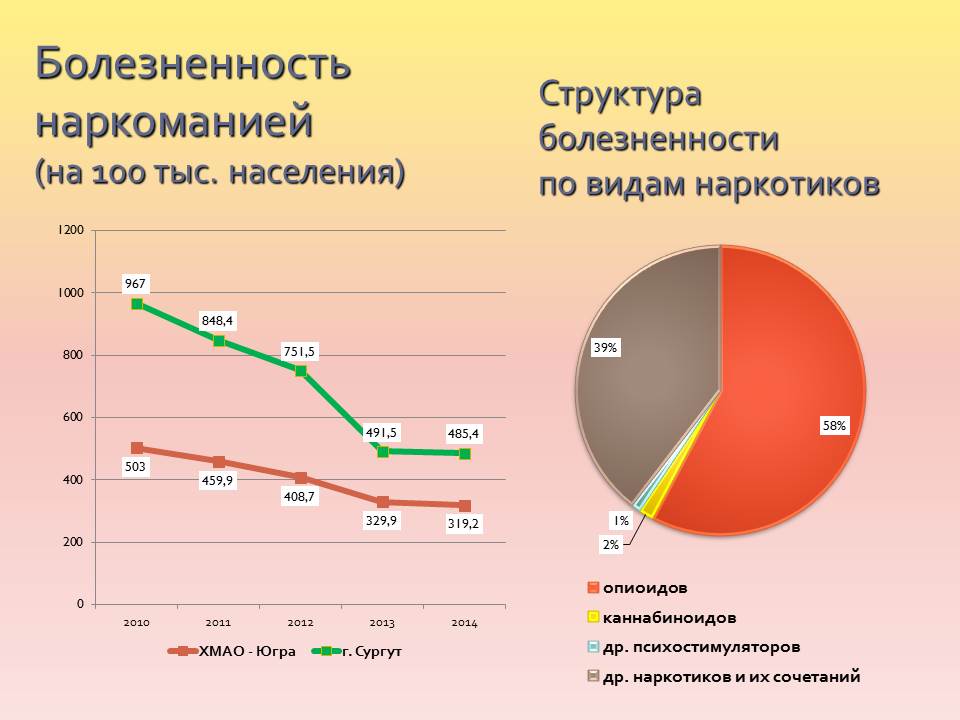 В течение 2014 года по г. Сургуту впервые зарегистрировано 76 наркозависимых. Из них 69 человекам диагноз выставлен вследствие потребления «других наркотиков и их сочетаний» (90,8 %); других психостимуляторов – 4 человека, каннабиноидов – 2 человека, опиоидов – 1 чел. Первичная заболеваемость наркоманией в 2014 году составила 23,1 на 100 тыс. населения, что на 18,5% выше уровня 2013 года (19,5 на 100 тыс. населения). Этот показатель также превышает средний по РФ за 2013 год (13,9%), но ниже показателя Уральского Федерального округа (24,4 на 100 тыс. населения). Таким образом, прирост состоящих на учете наркозависимых в 2014 по сравнению с предыдущим составил 18,8 %. Рост произошел, главным образом, за счет потребителей и распространения синтетических наркотических средств.