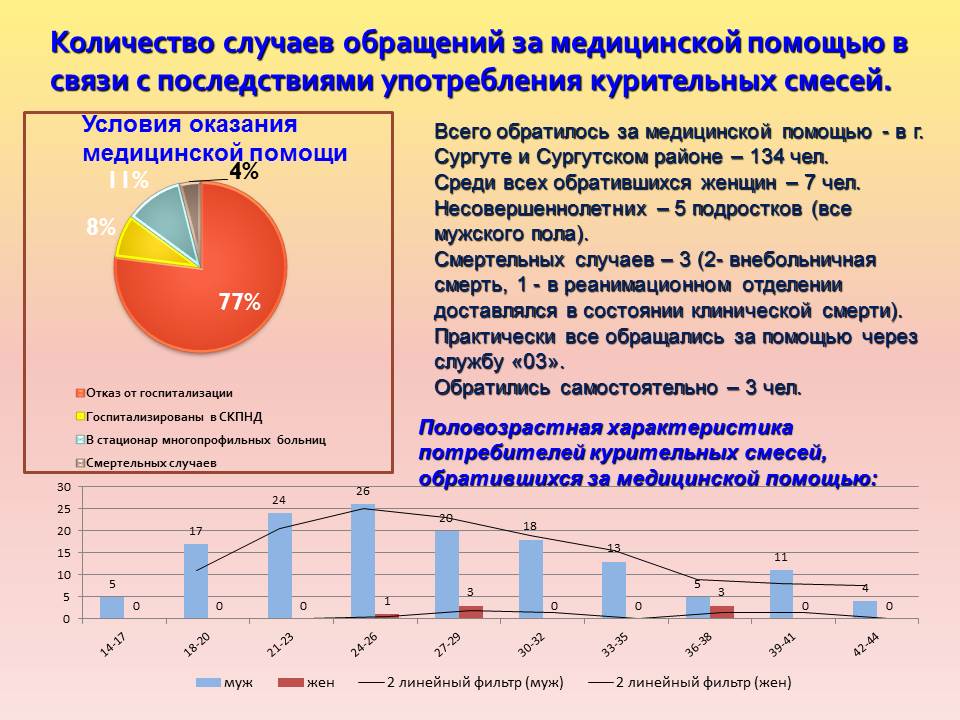 В 77 % случаев отказывались от получения медицинской помощи и без осмотра покидали приемные покои медицинских организации, либо на месте отказывались от дальнейших услуг сотрудников скорой медицинской помощи. В 98 % случаях обращения осуществлялись через службу «03». За период наблюдения по г. Сургуту было зафиксировано 3 смертельных случаев от потребления данных веществ (все лица мужского пола). Среди умерших несовершеннолетних нет.