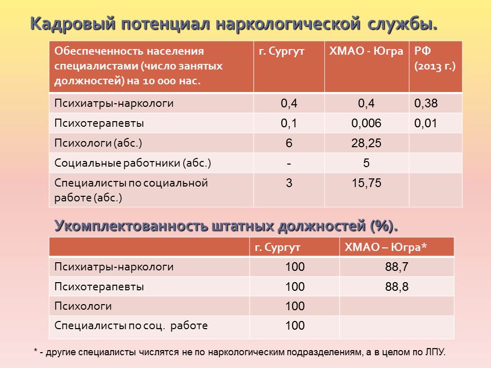 Обеспеченность врачами – психиатрами-наркологами в г.Сургуте составляет 0,41 на 10 тыс. населения, в РФ 0,38. В диспансере наркологическую помощь оказывают: 18 врачей – психиатров-наркологов, из них 11 в амбулаторном звене, 3 клинических психолога, из них 2 в поликлинике, 1 социальный работник. Обеспеченность населения наркологическими койками в Сургуте составляет 3,7 на 10 тыс. населения, что выше, чем в среднем по РФ (1,7).