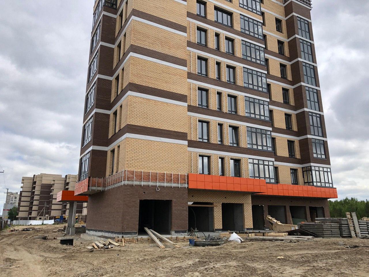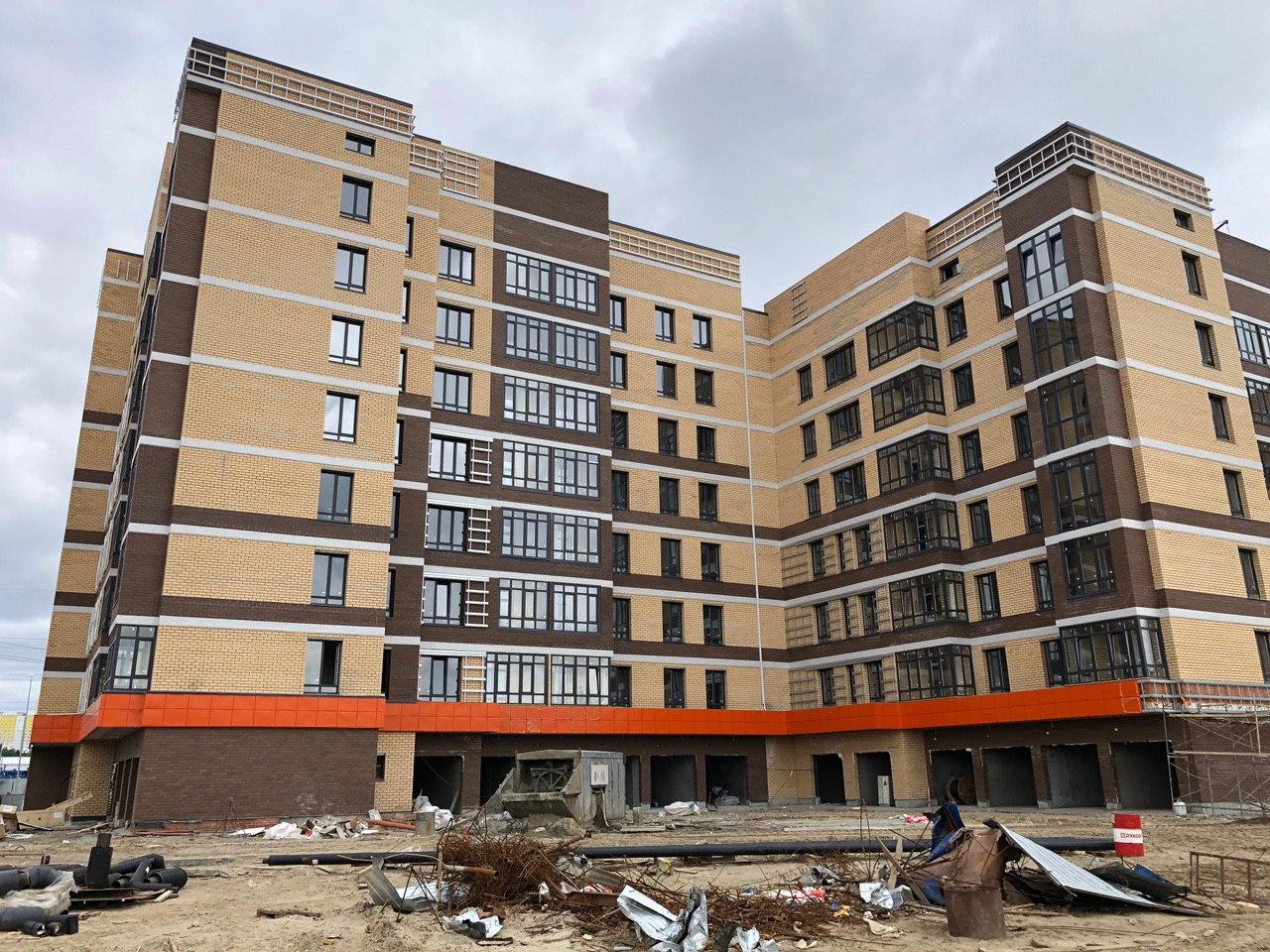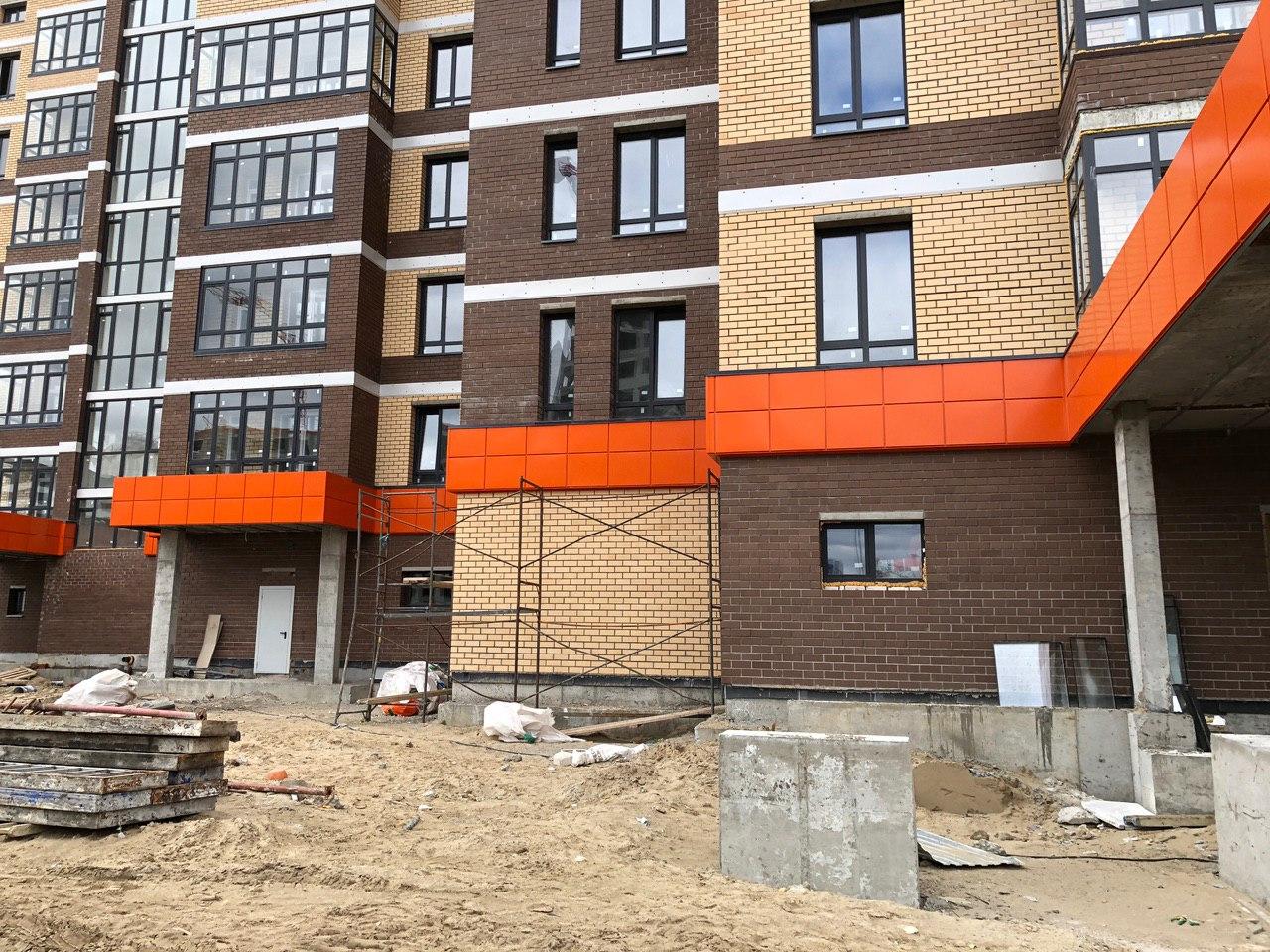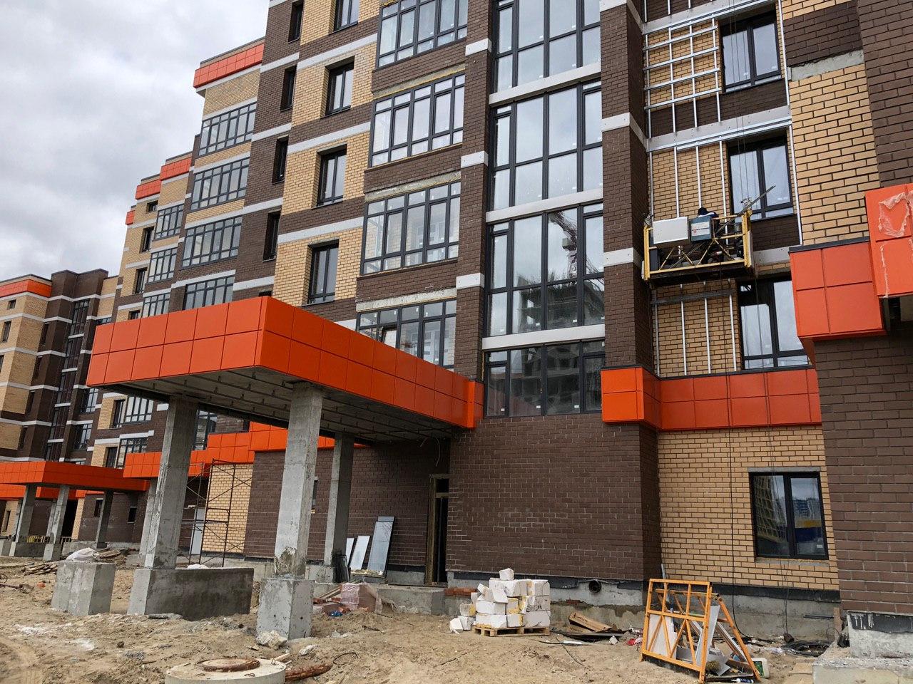 Внутри помещений возведены перегородки, ведется работа по оштукатуриванию стен мест общего пользования, укладка плитки на пол в МОП первой, второй, третьей секции, установка дверей, покраска МОП первой, второй, третьей секции подготовка к благоустройству территории, монтаж внутреннего электроснабжения, монтаж внутреннего отопления. Завершаются работы по остеклению фасада. Ведутся работы по монтажу фасада.