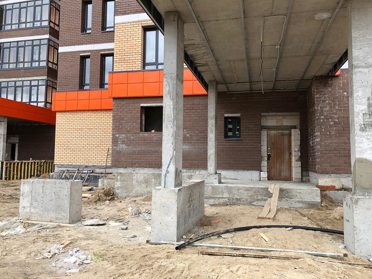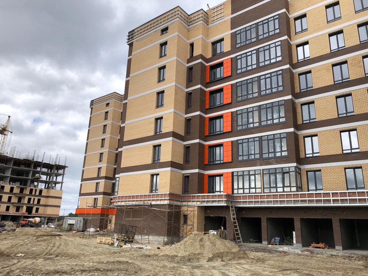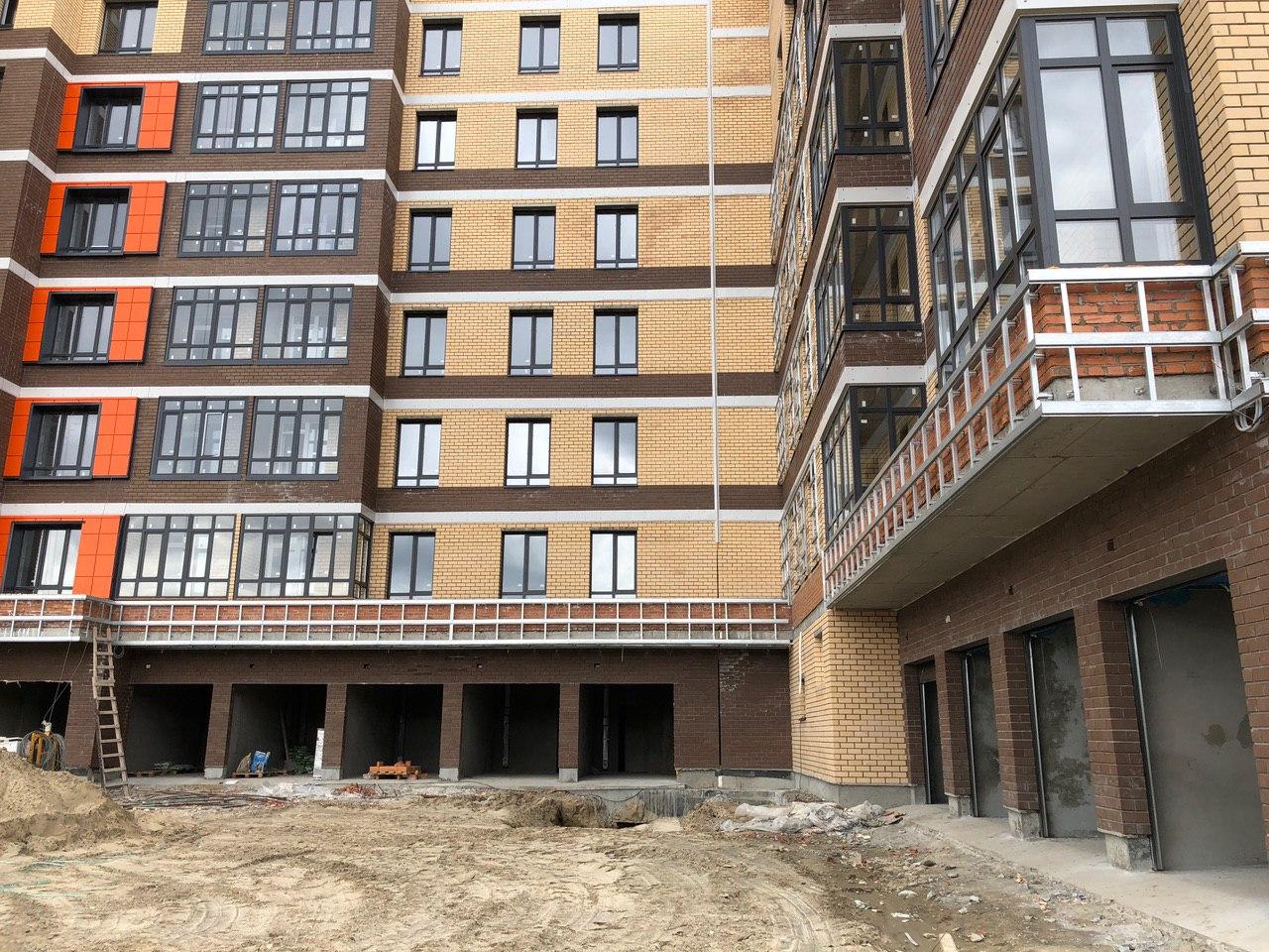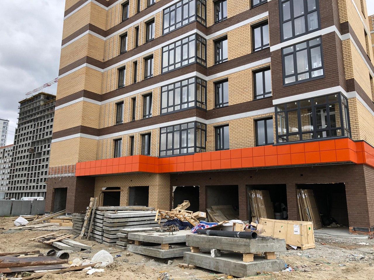 Внутри помещений возведены перегородки, ведется работа по оштукатуриванию стен мест общего пользования, укладка плитки на пол в МОП первой, второй, третьей секции, установка дверей, покраска МОП первой, второй, третьей секции подготовка к благоустройству территории, монтаж внутреннего электроснабжения, монтаж внутреннего отопления. Завершаются работы по остеклению фасада. Ведутся работы по монтажу фасада.