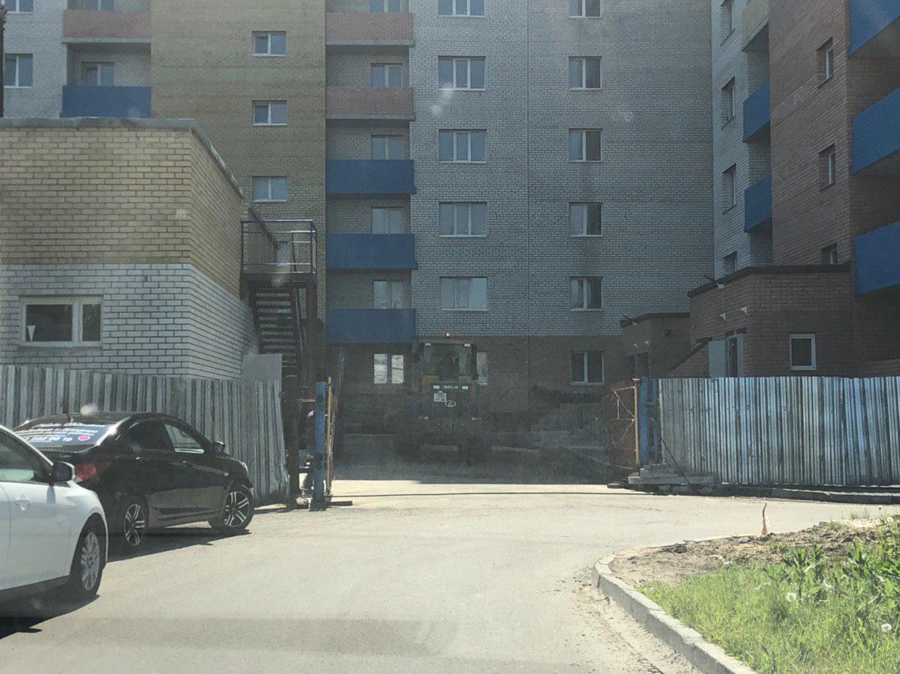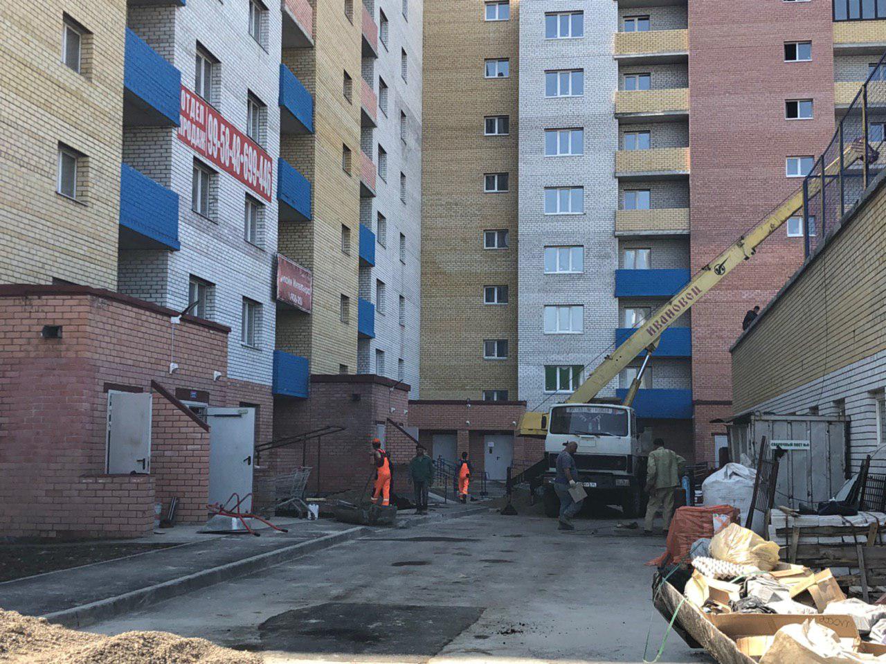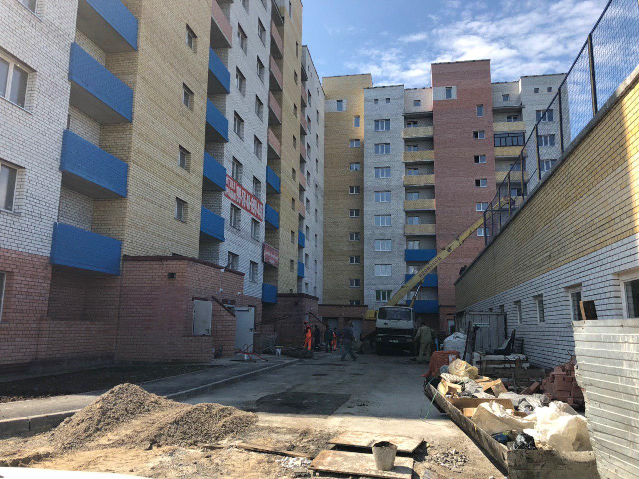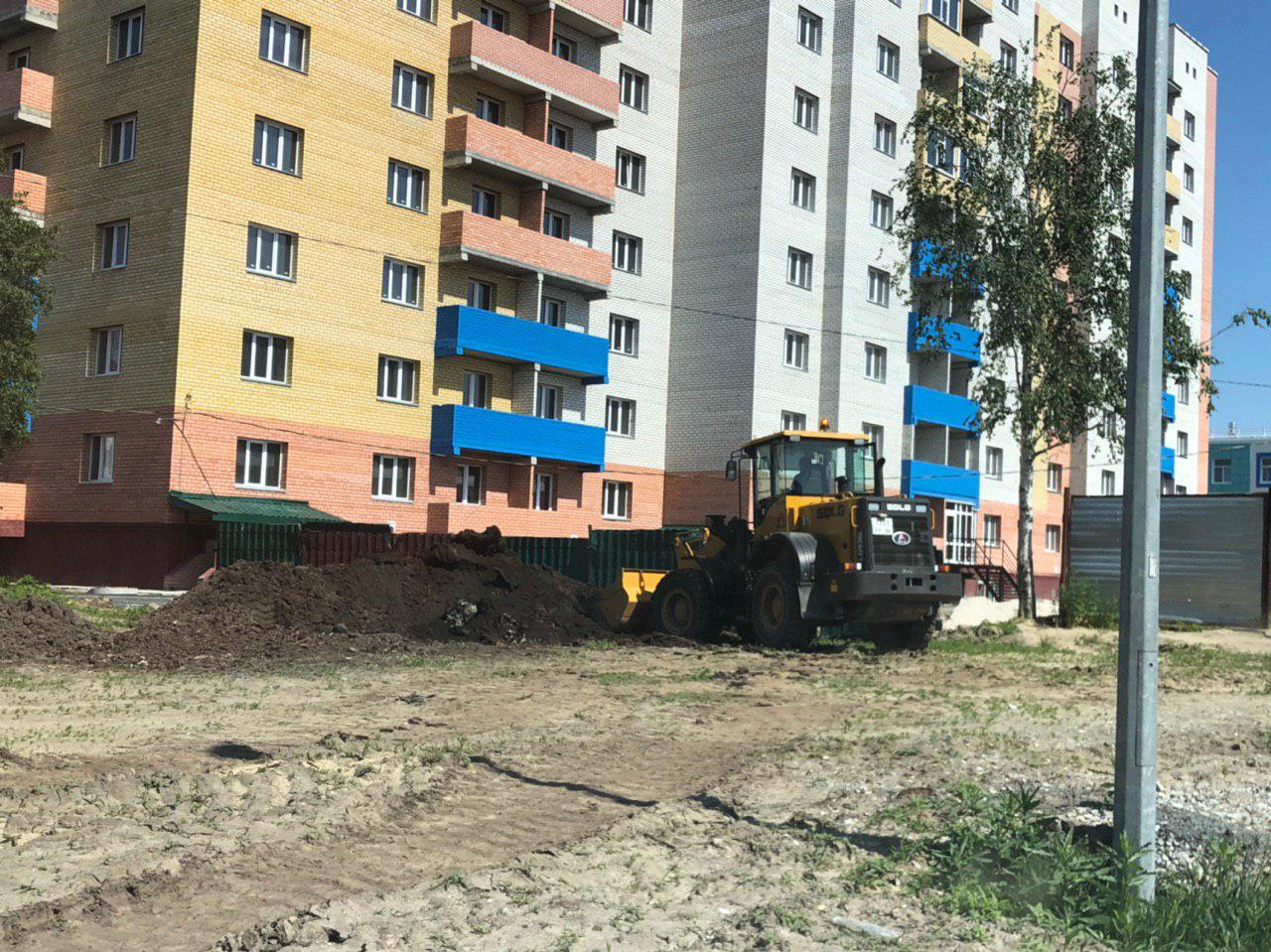 Рабочие в количестве 4-6 человек ведут благоустройство территории. Укладка тротуарных дорожек (благоустройство придомовой территории). Ведется монтаж детской площадки на крыши здания паркинга