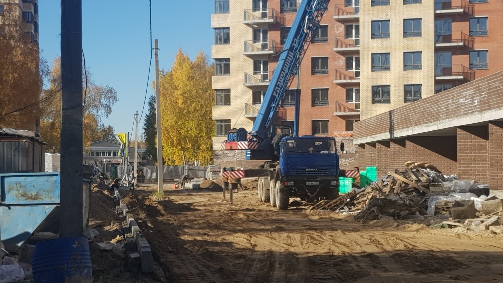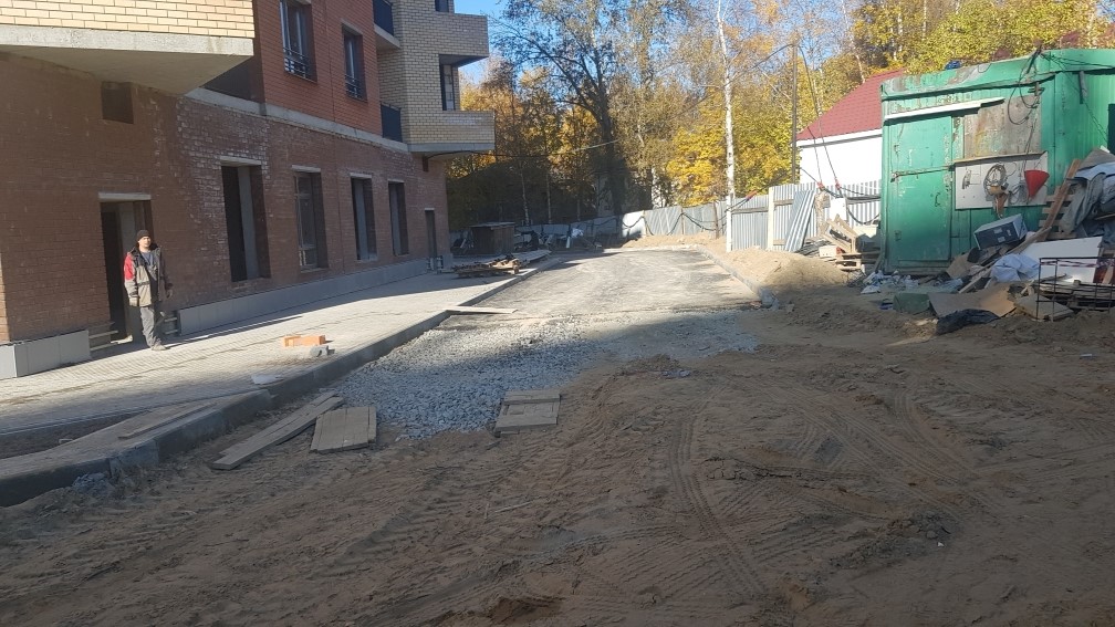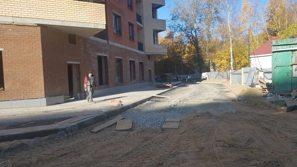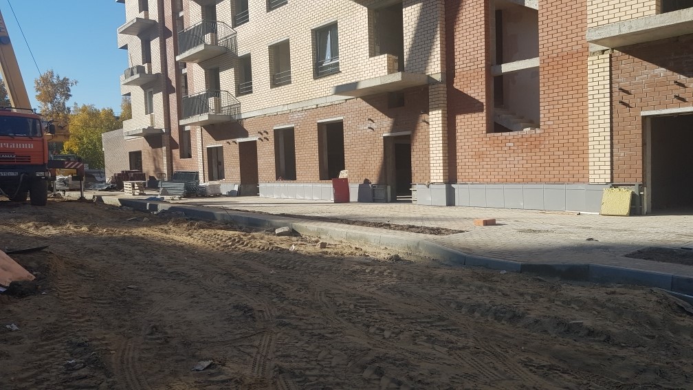 Выполняются работы по благоустройству территории, кладка тротуарной плитки, установки бордюров и поребриков подготовка под асфальтирование проездов.