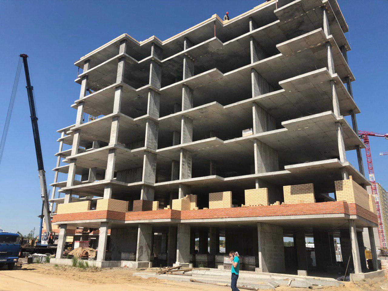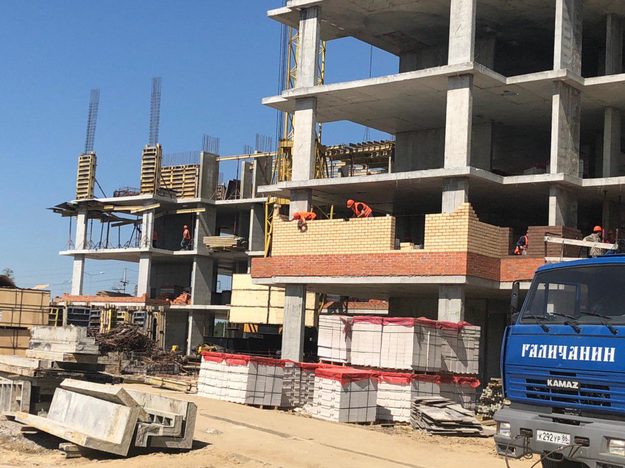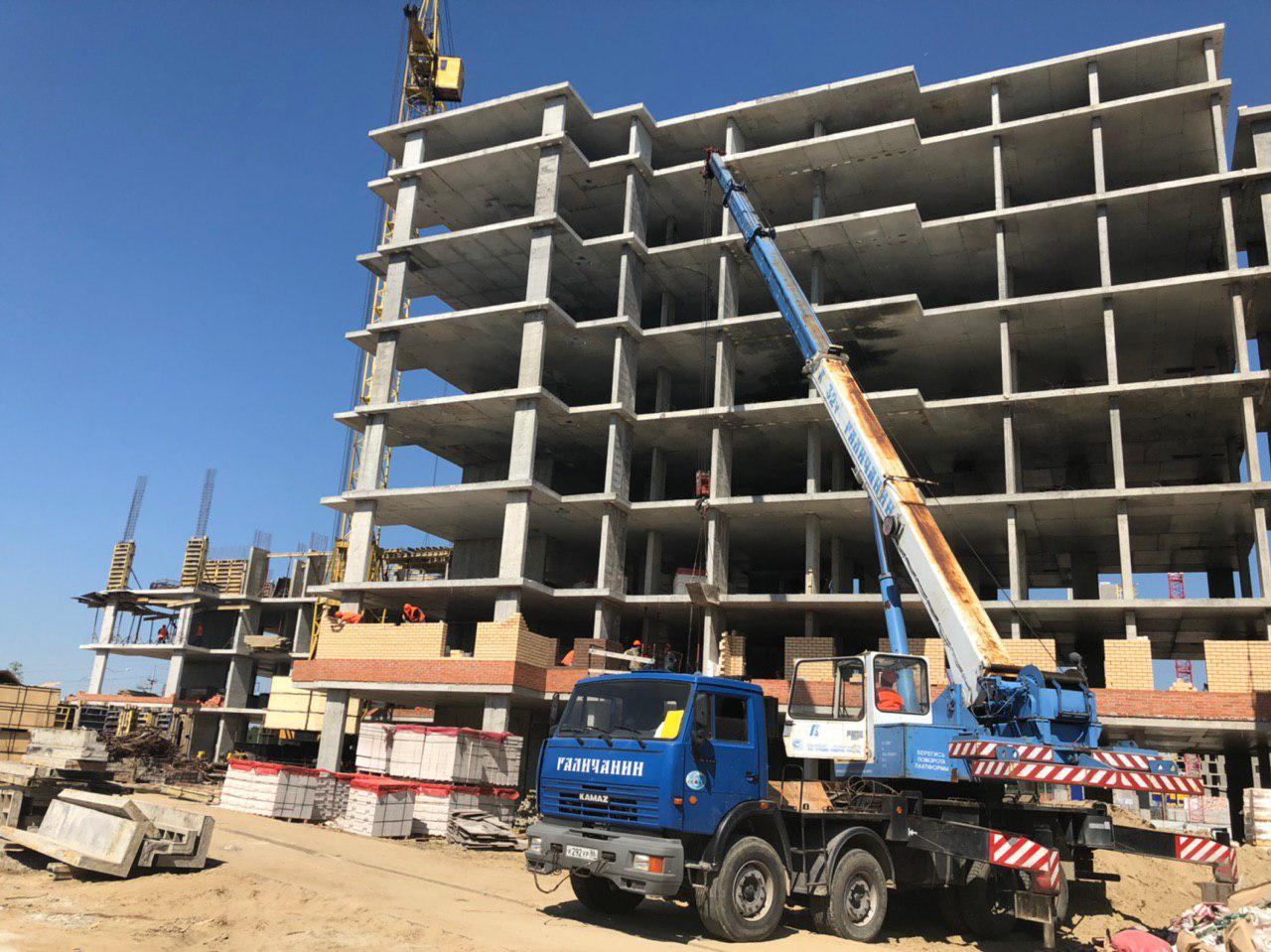 Каменщики в количестве 5-7 человек ведут кладку ограждающей конструкции 2 этажа из кирпича. Работает кран и автокран. Завозятся строительные материалы. Ведется подъем строительного материала.