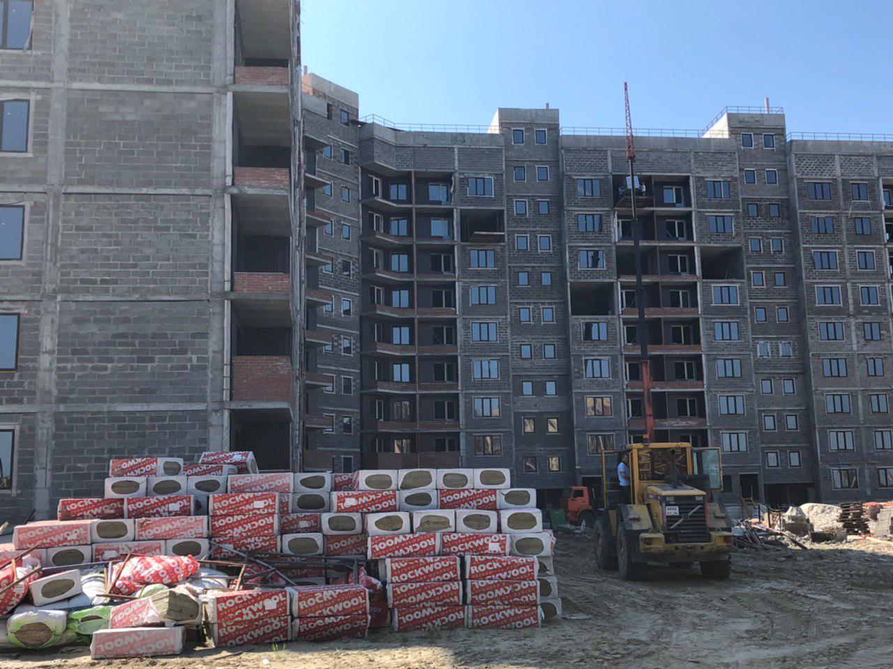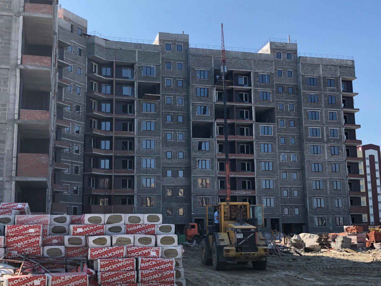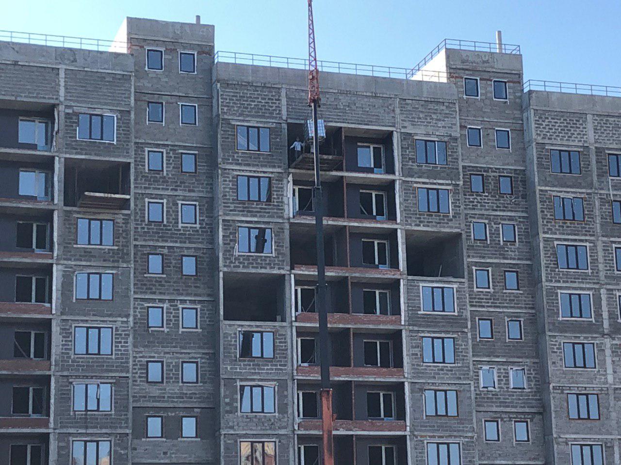 Проводится укладка кровли силами 2 человек. Ведутся внутренние ремонтные работы, подъем строительного материала на 9 этаж. Со стороны переднего фасада (ближе к дороги) работает сваебой.