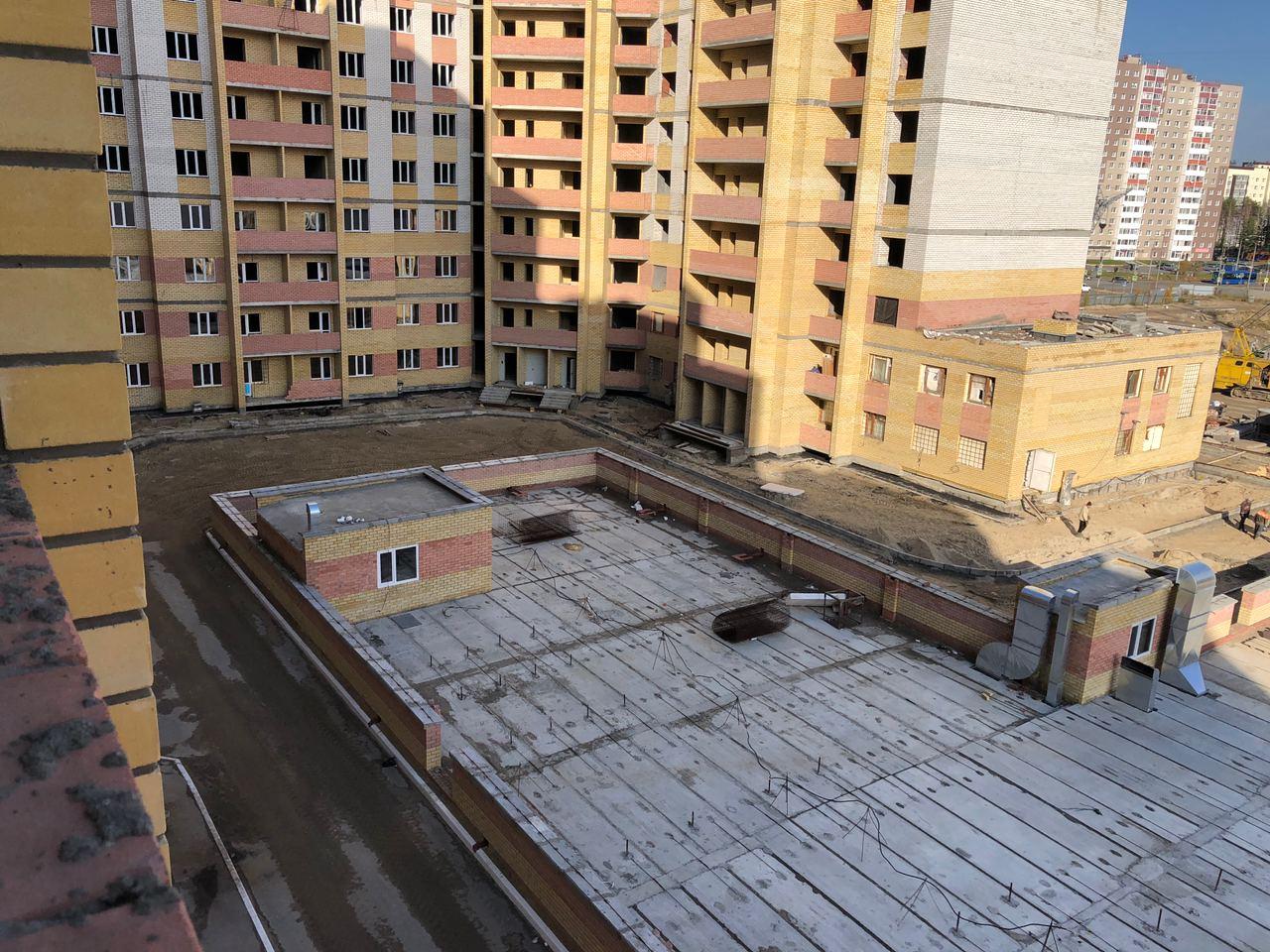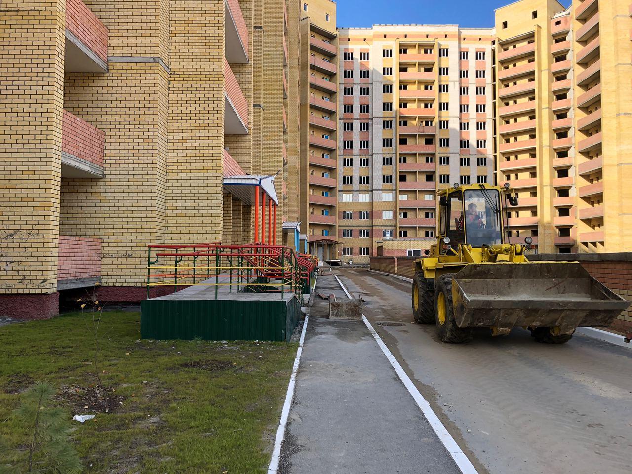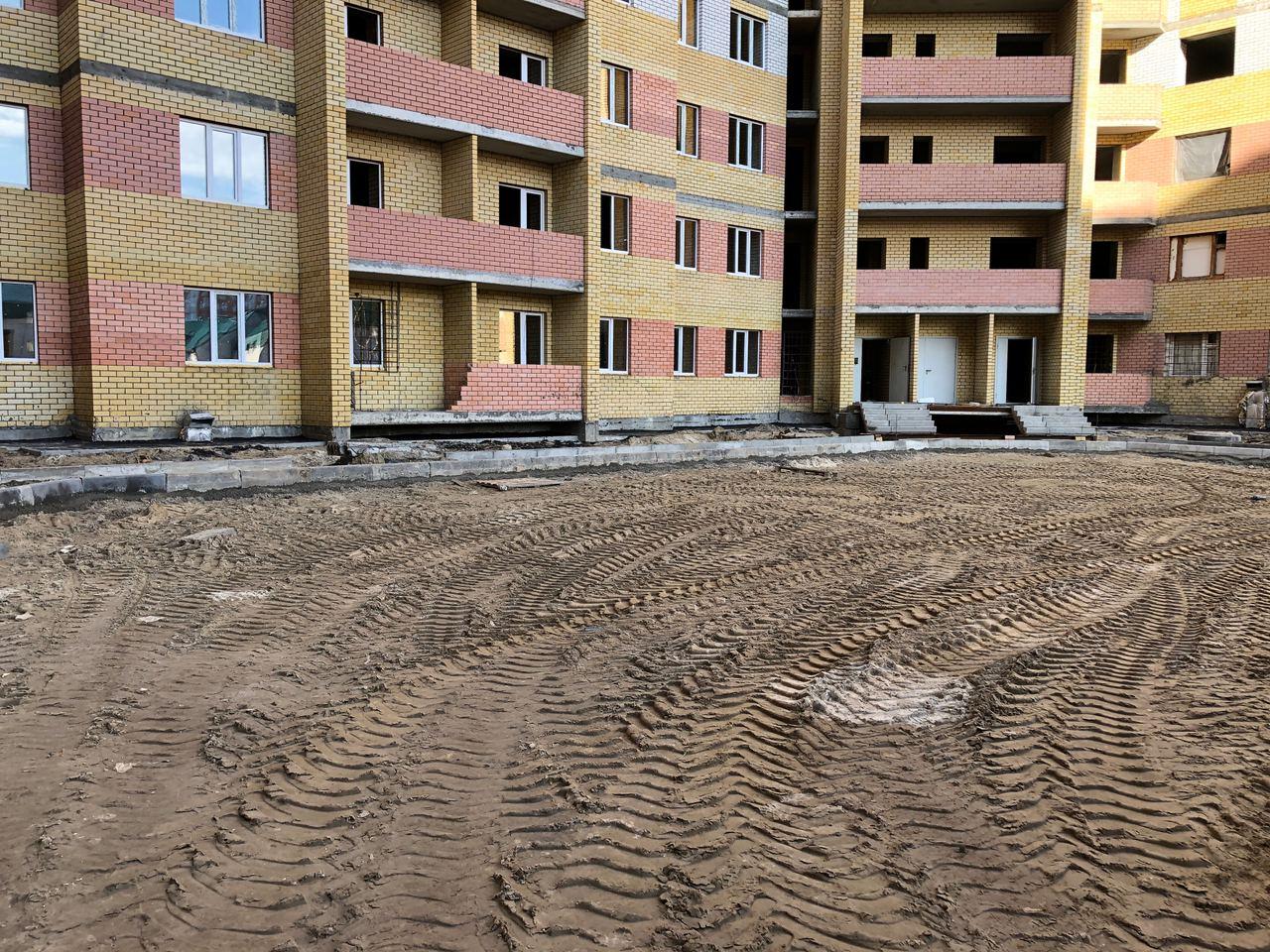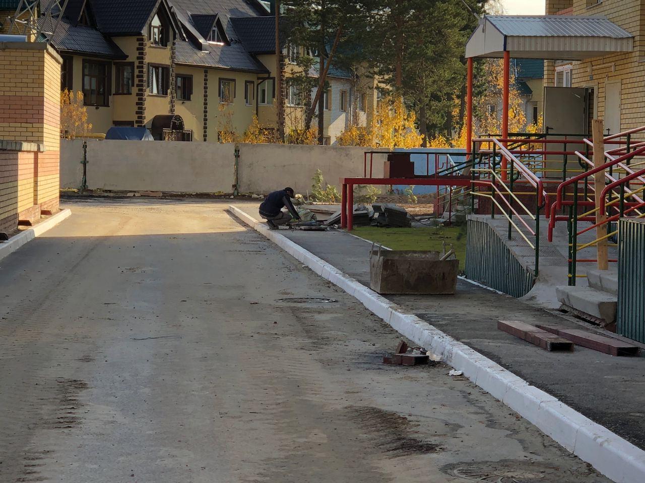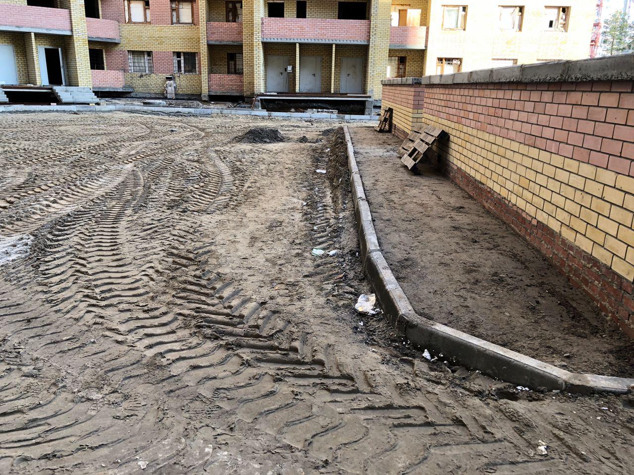 На строительной площадке первых четырех подъездов находятся ориентировочно 7-10 рабочих, ведутся работы по благоустройству территории (установка бордюров, подготовка под асфальтирование проезда).