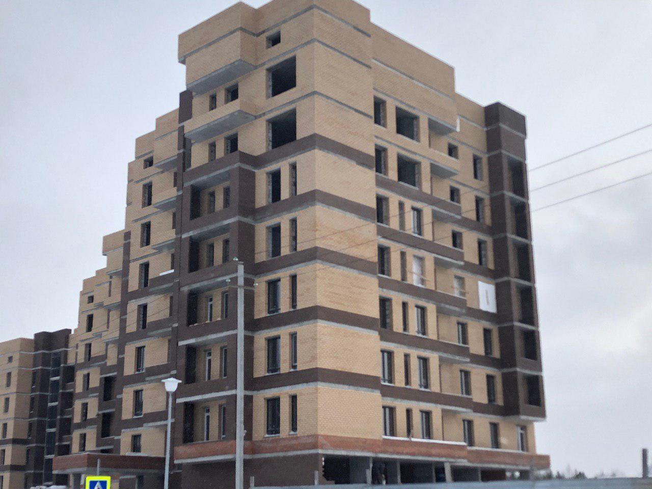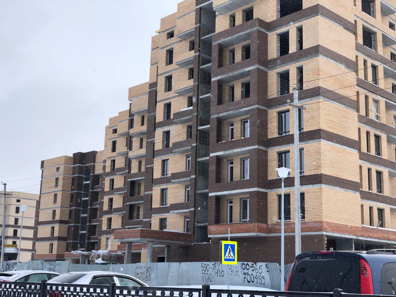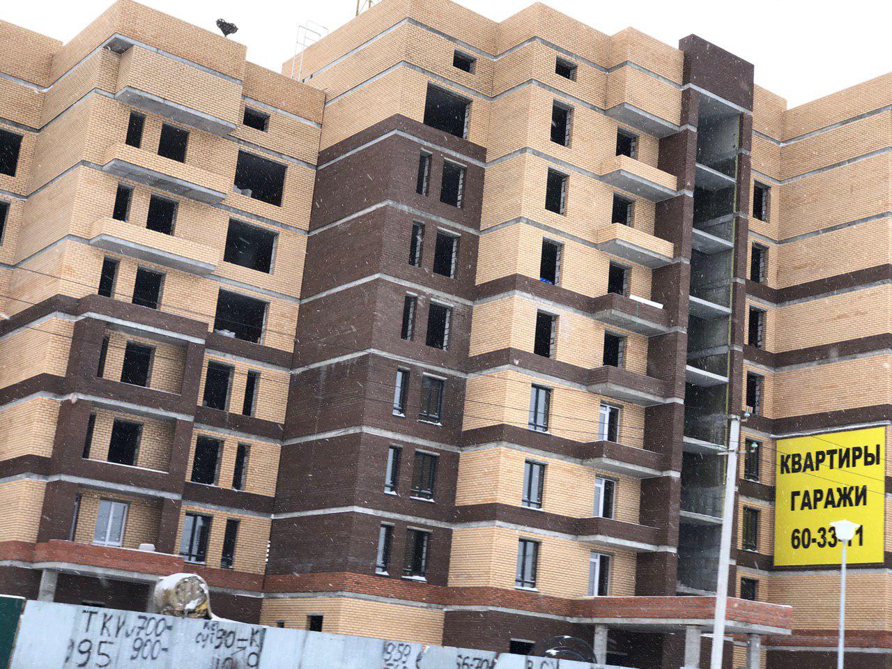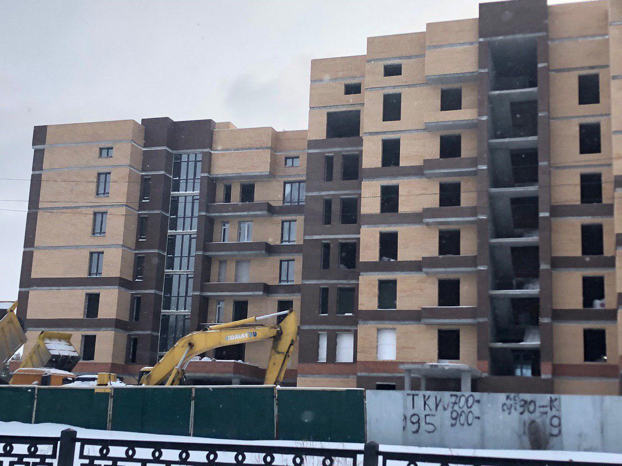 Работает кран, автокран, производится завоз и подъем строительного материала. Проводятся работы по остеклению оконных проемов.