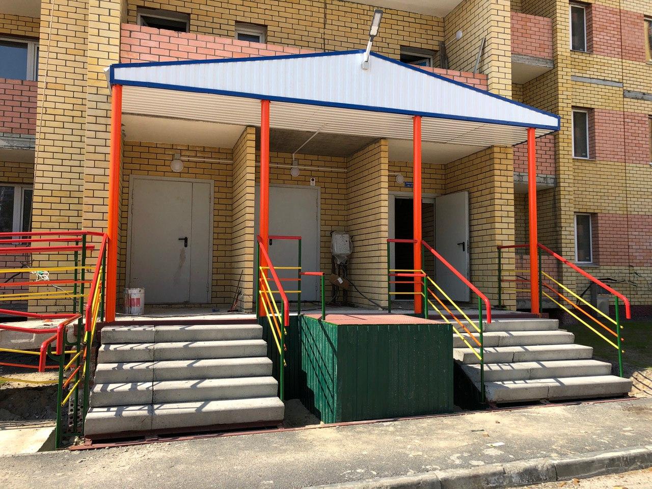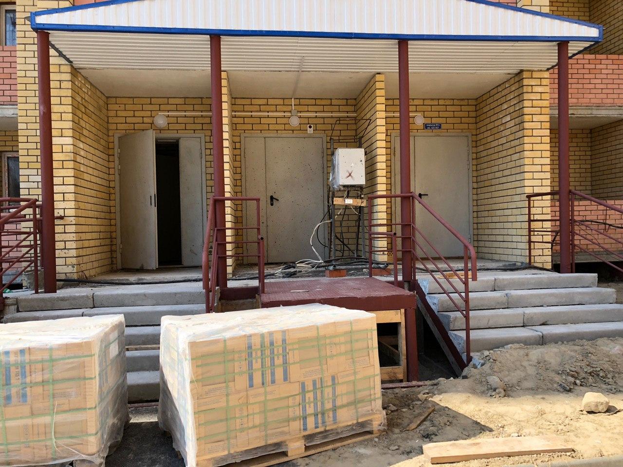 Во втором подъезде работы не ведутся, дверь открыта. Произведена часть облицовки крыльца профлистом.