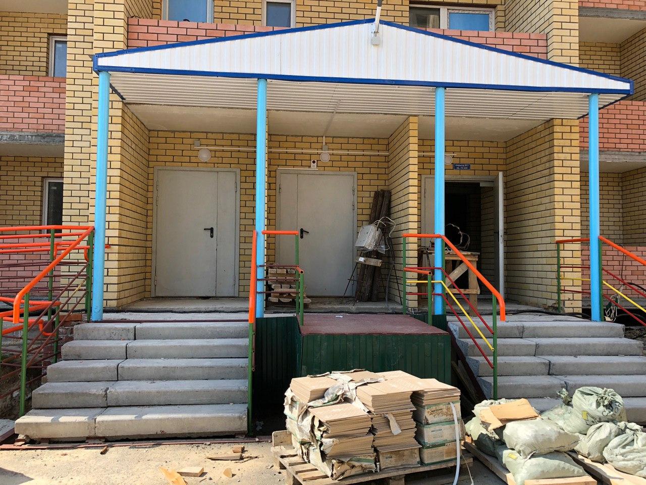 В третьем подъезде работы не ведутся, дверь открыта. Произведена часть облицовки крыльца профлистом.