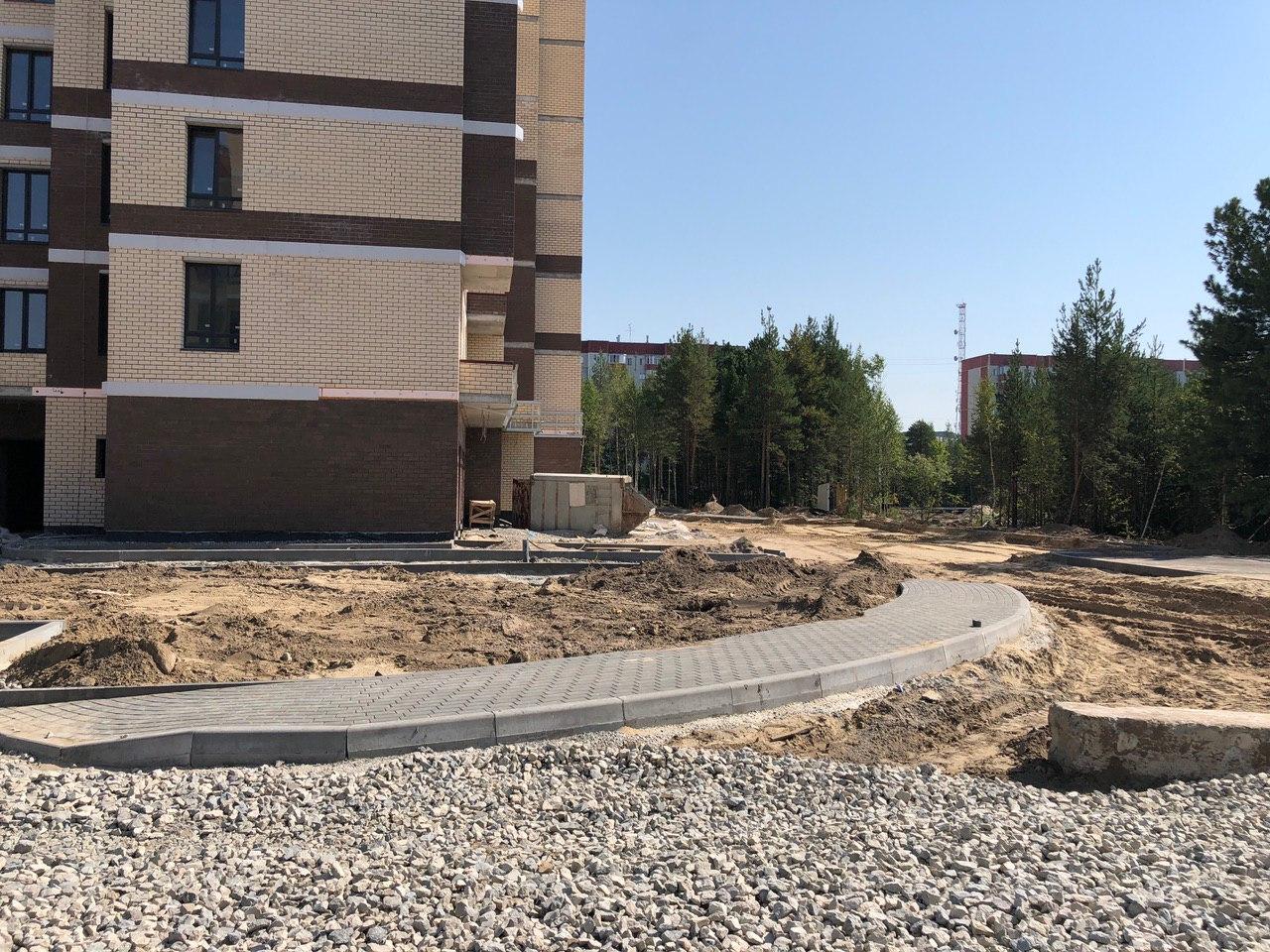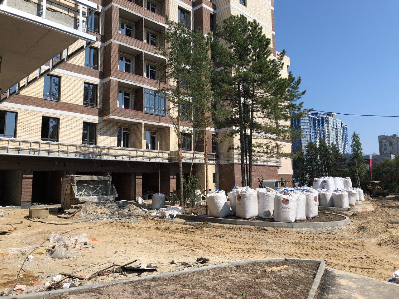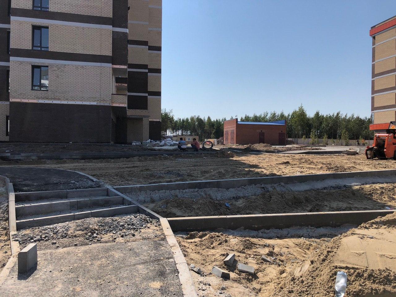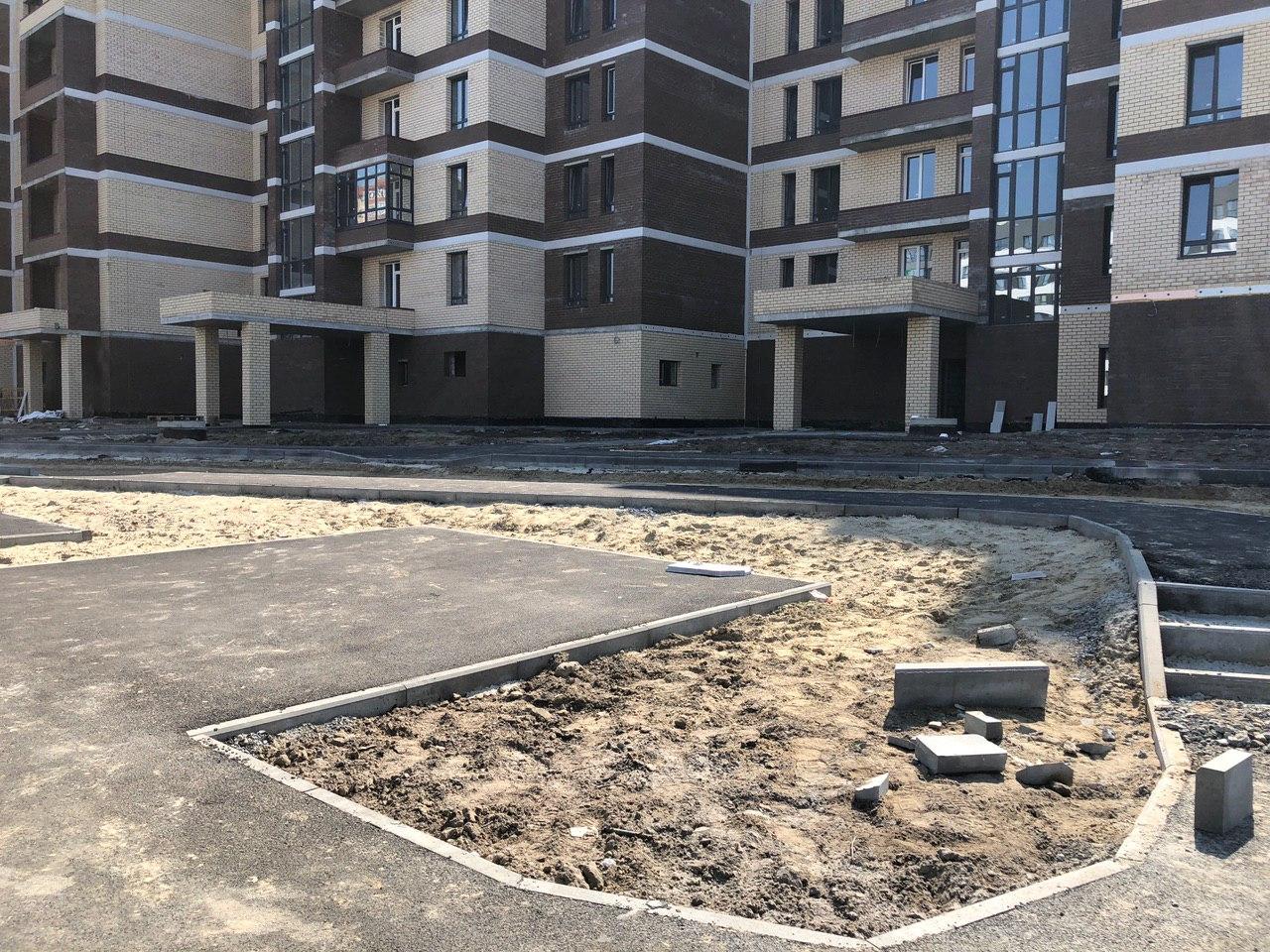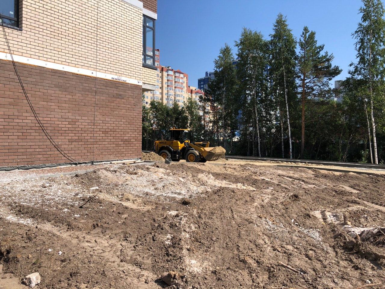 Производятся работы по работы по монтажу фасада, благоустройству территории.