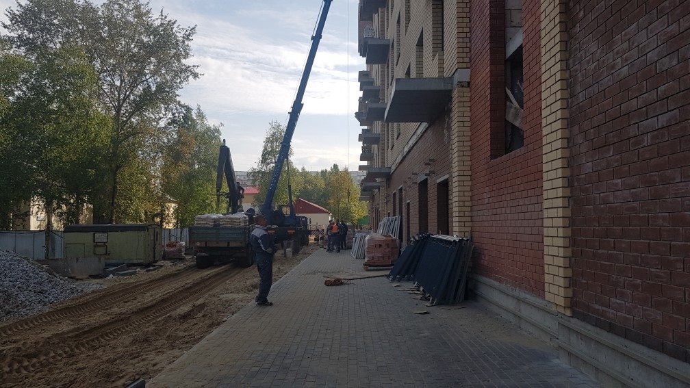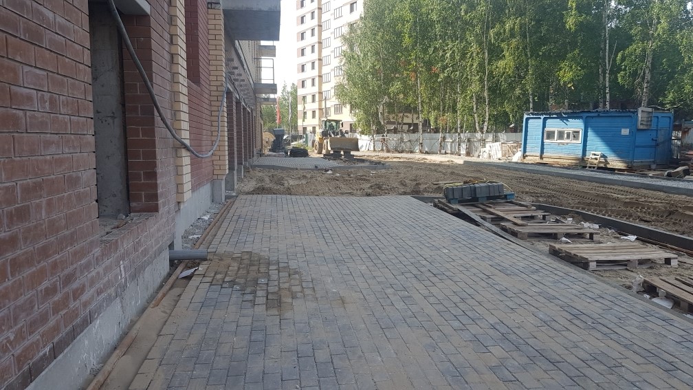 Выполняются работы по благоустройству территории, кладка тротуарной плитки.