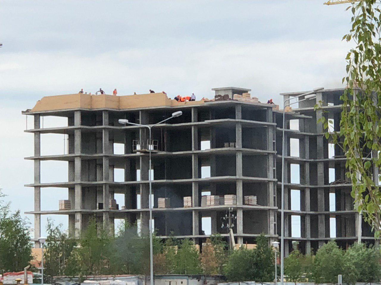 На кровле средней секции ведутся работы по укладки ограждающей конструкции из кирпича силами 4 человек.