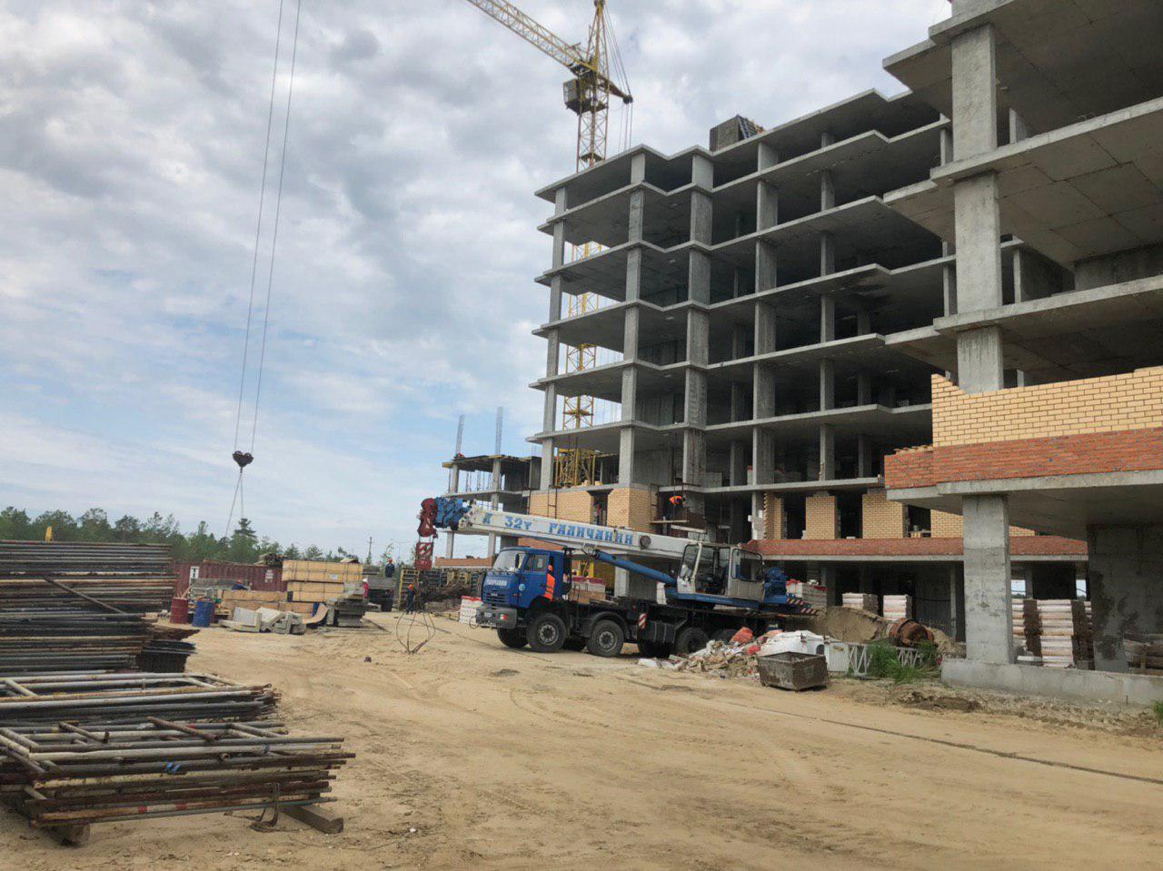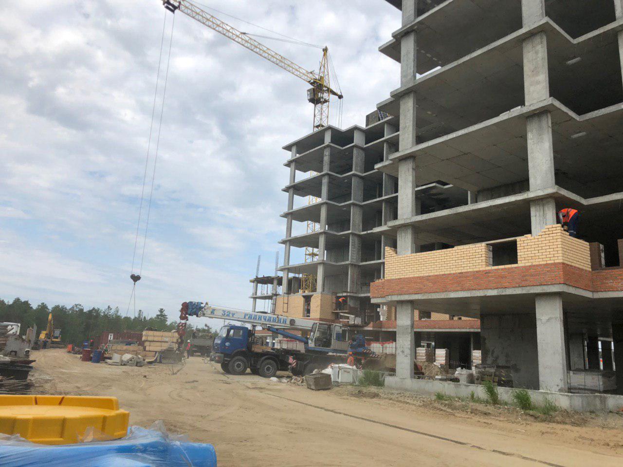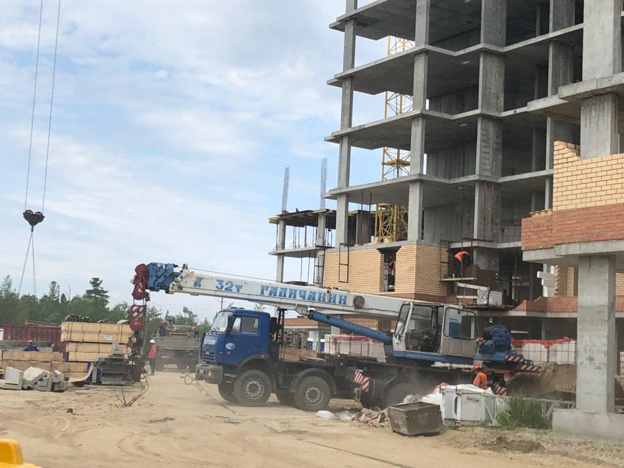 Каменщики в количестве 5-7 человек ведут кладку ограждающей конструкции 2 этажа из кирпича. Работает кран и автокран. Завозятся строительные материалы. Ведется подъем строительного материала.