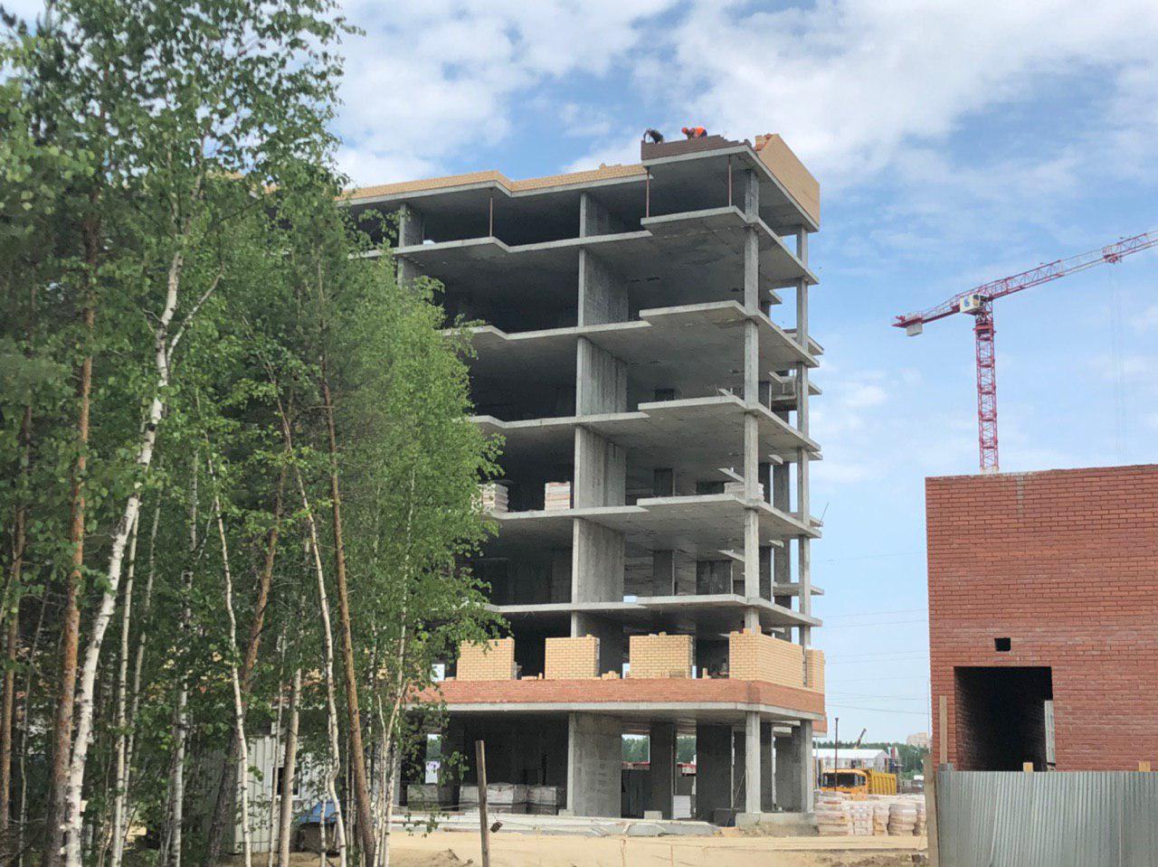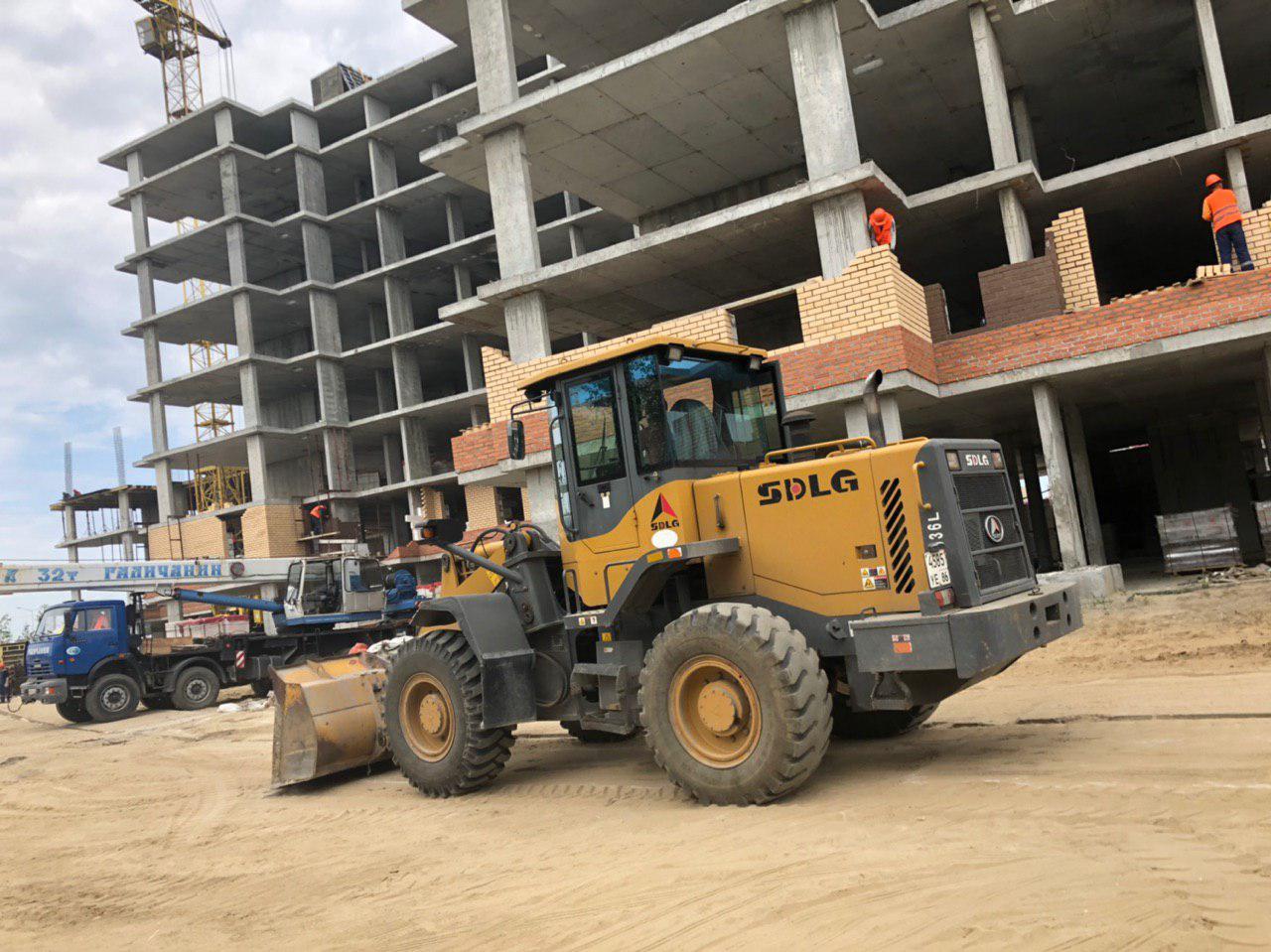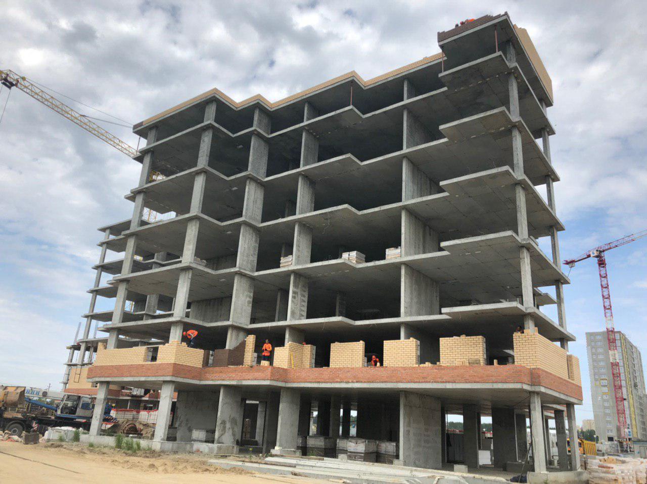 Каменщики в количестве 5-7 человек ведут кладку ограждающей конструкции 2 этажа из кирпича. Работает кран и автокран. Завозятся строительные материалы. Ведется подъем строительного материала.