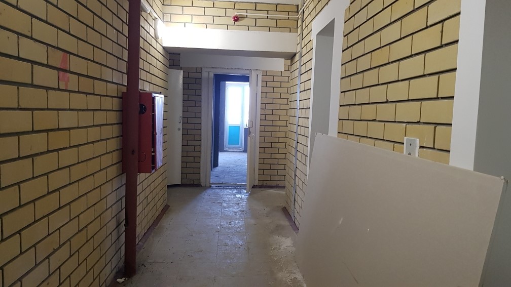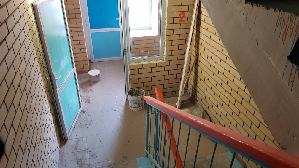 В 1-4 подъездах проводятся работы по очистке стен в лифтовых шахтах. В 2-4 подъездах в местах общего пользования проводятся работы по шпаклевке откосов входных групп.