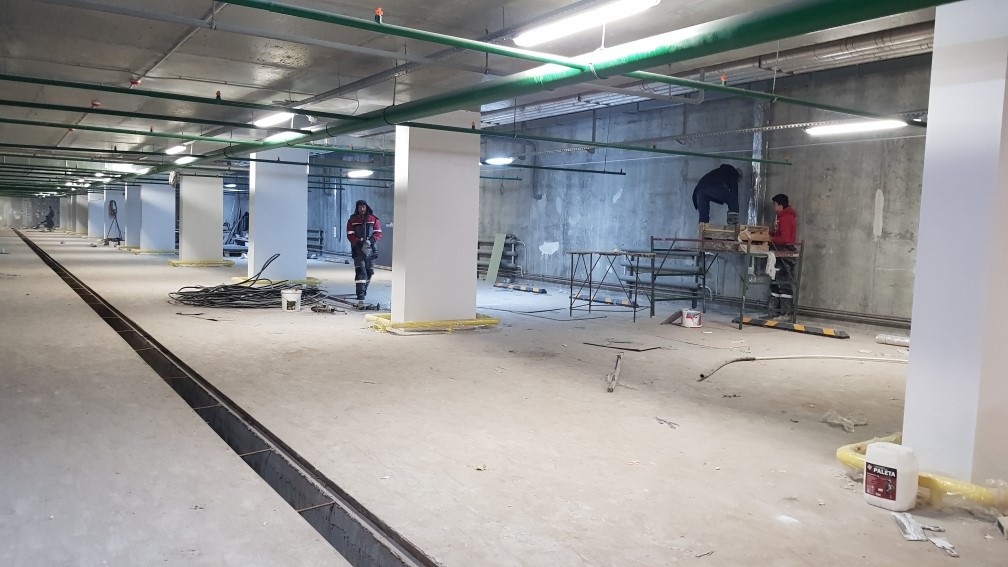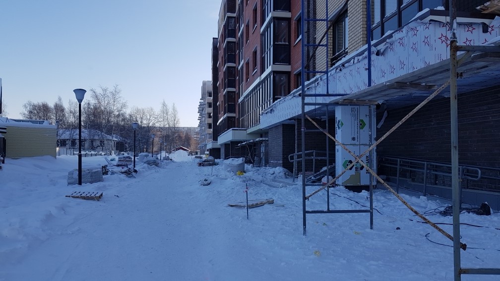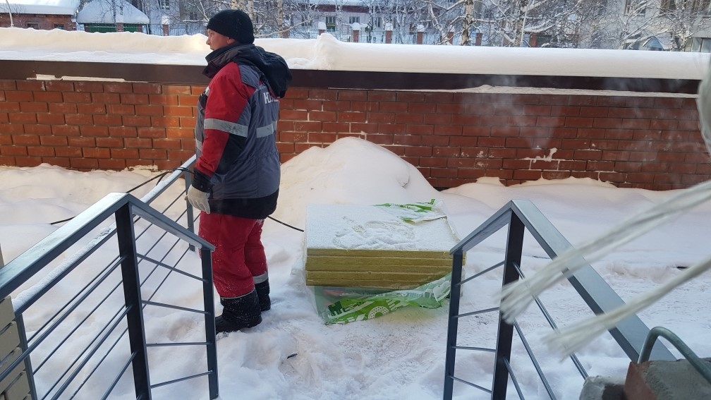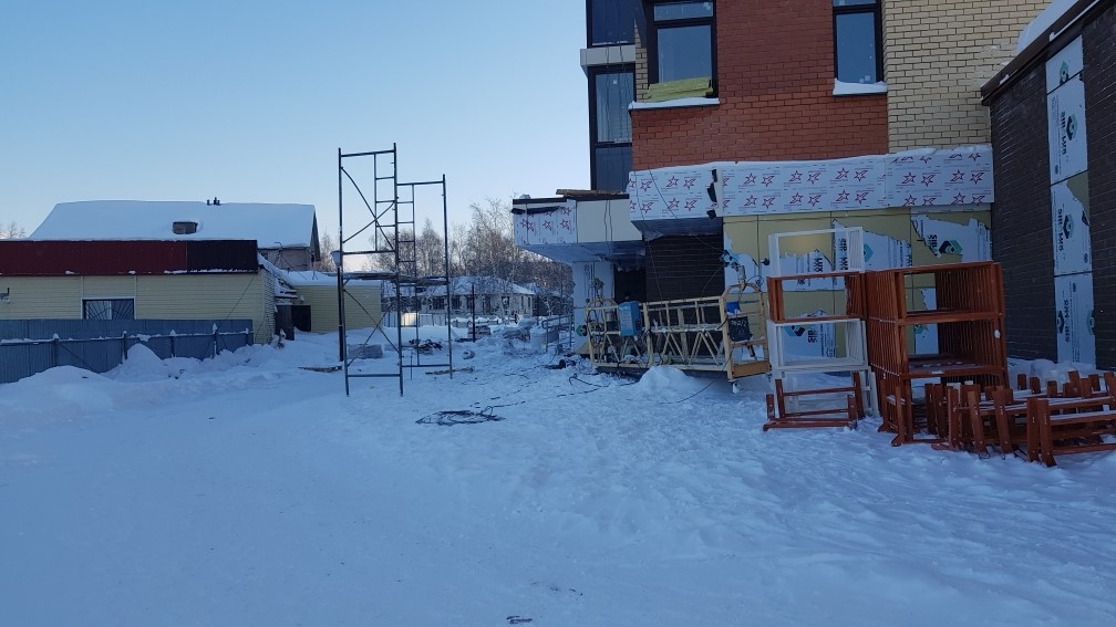 Ведутся работы по облицовке фасадов керамогранитом и композитными панелями, по утеплению фасада парапетами из оцинкованной стали.