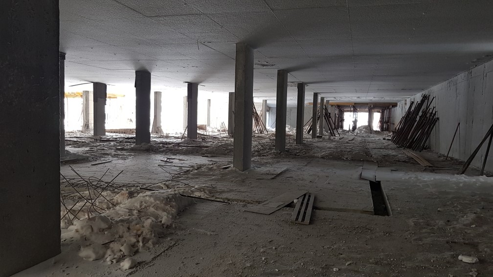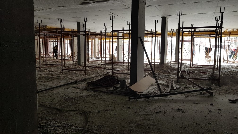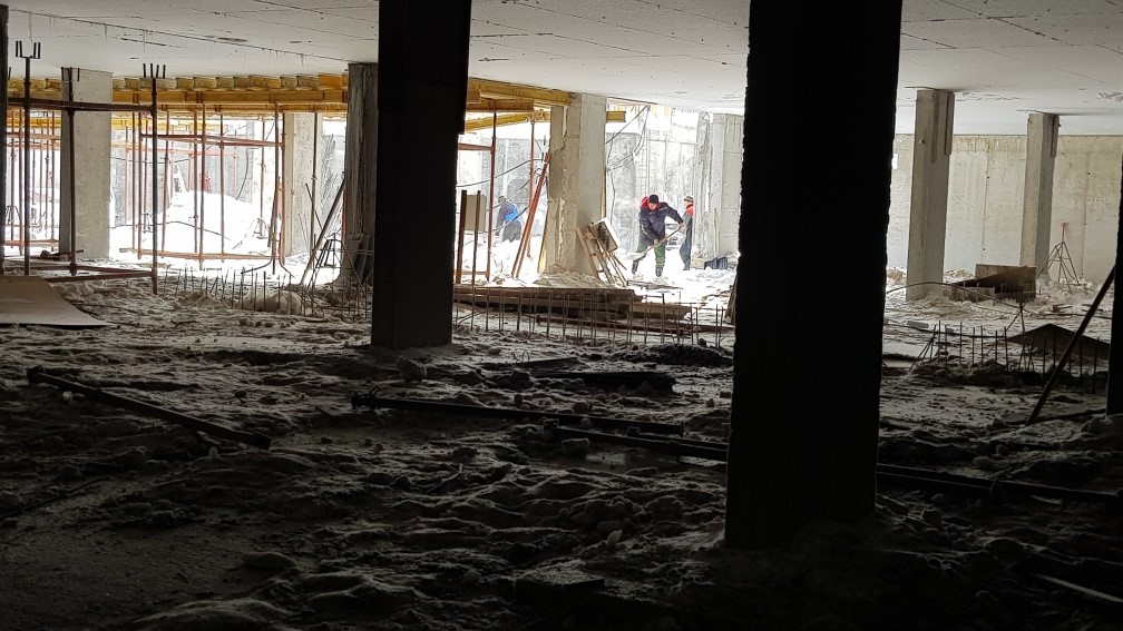 Ведутся работы по устройству монолитной плиты перекрытия паркинга. Подготовка и монтаж арматурных каркасов и опалубки стен помещений паркинга.
