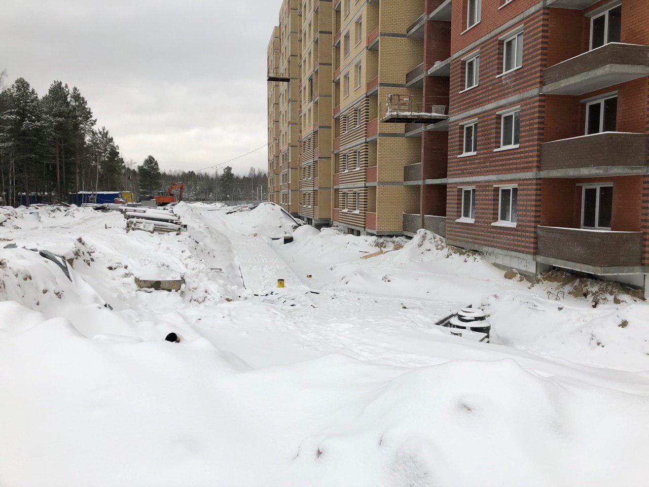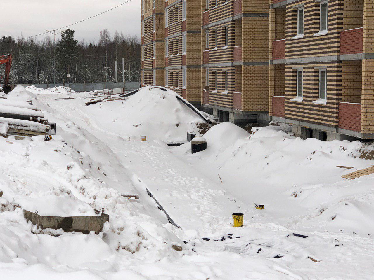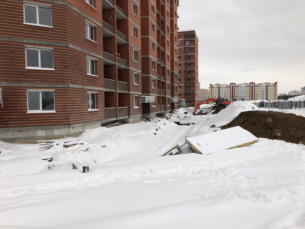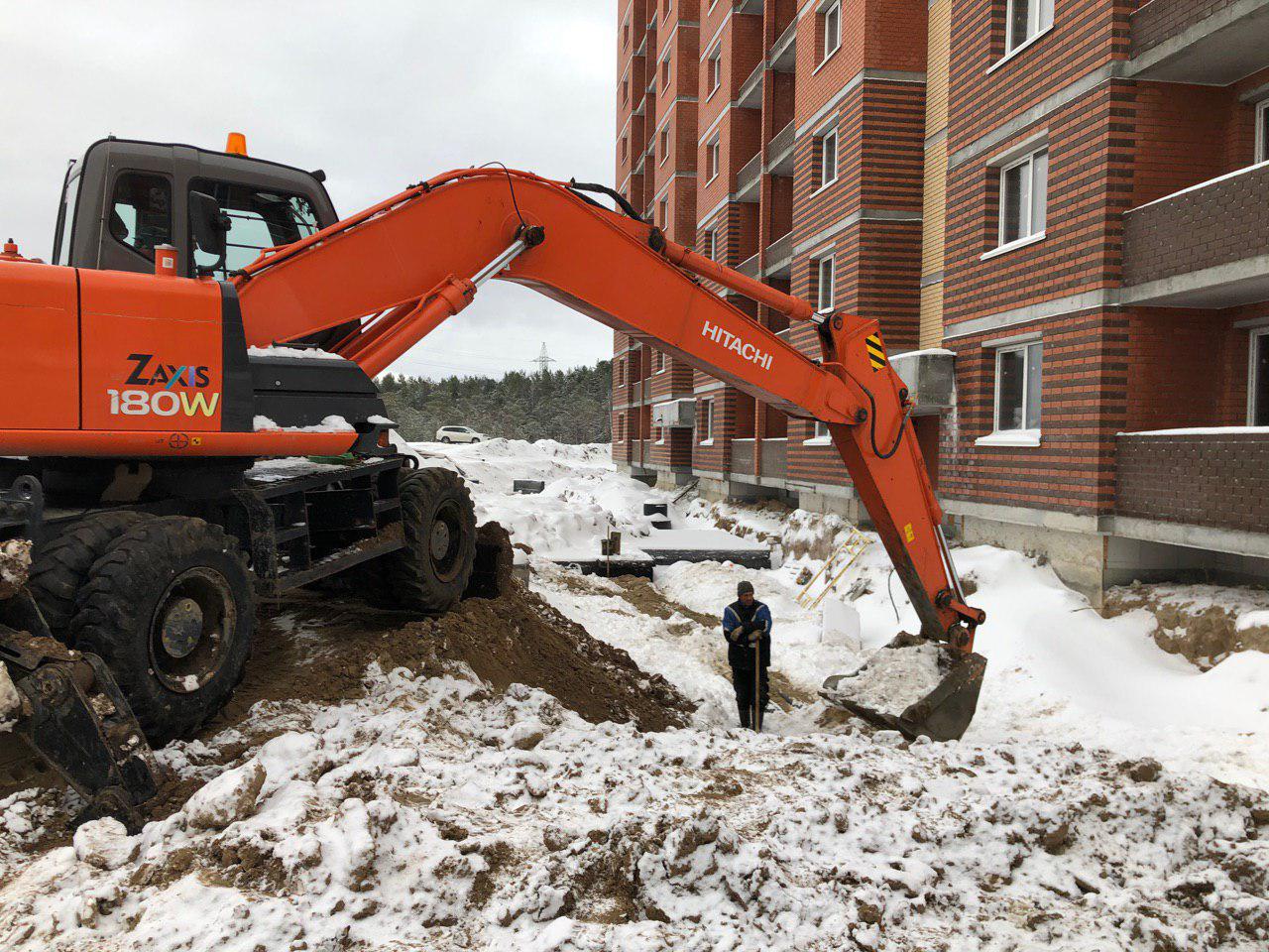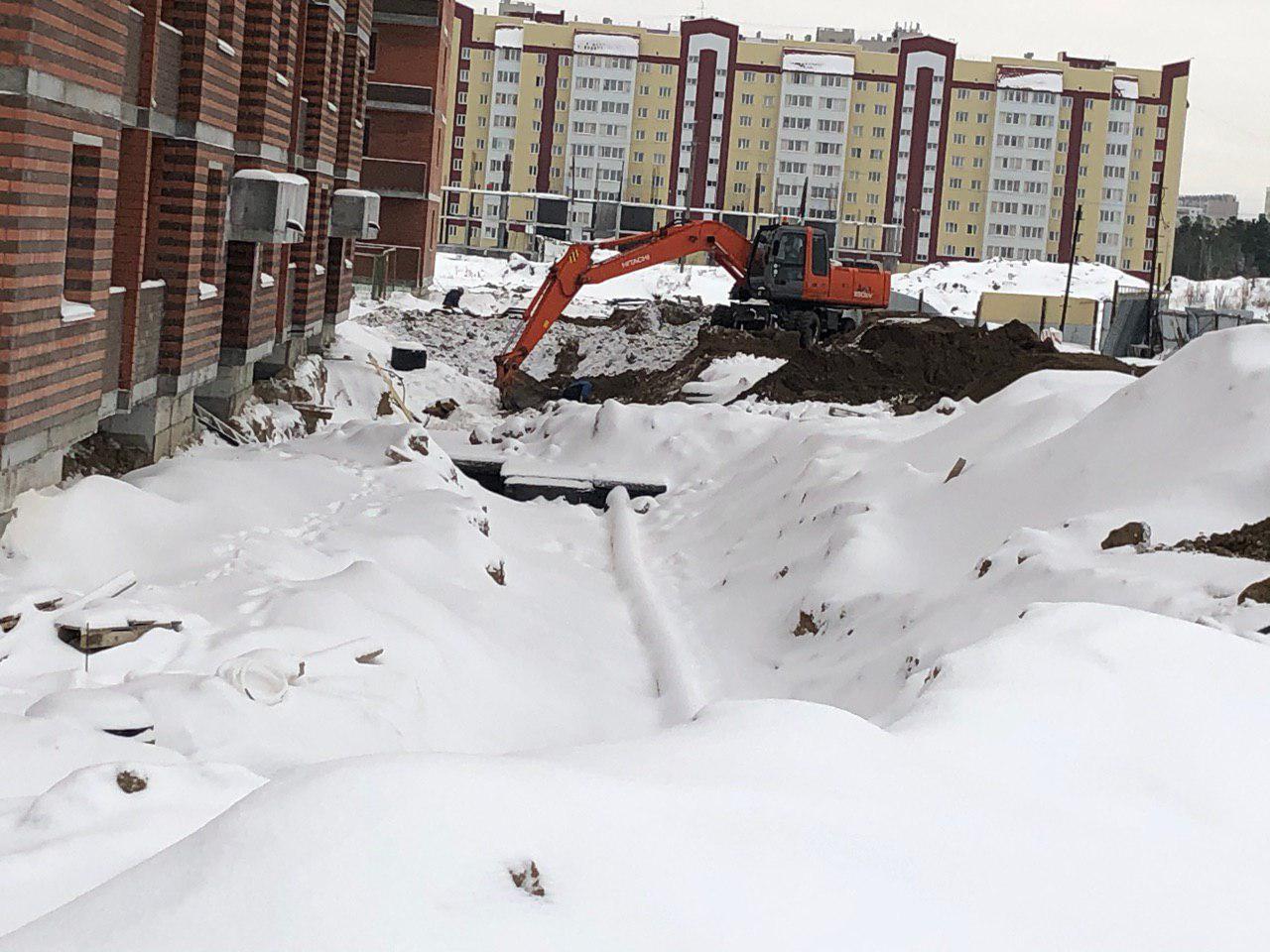 Ведутся земляные работы для укладки наружных и внутренних инженерных сетей (горячего и холодного водоснабжения). Проводятся работы по проводке электрических сетей внутри жилого дома. Работают экскаватор и бульдозер.