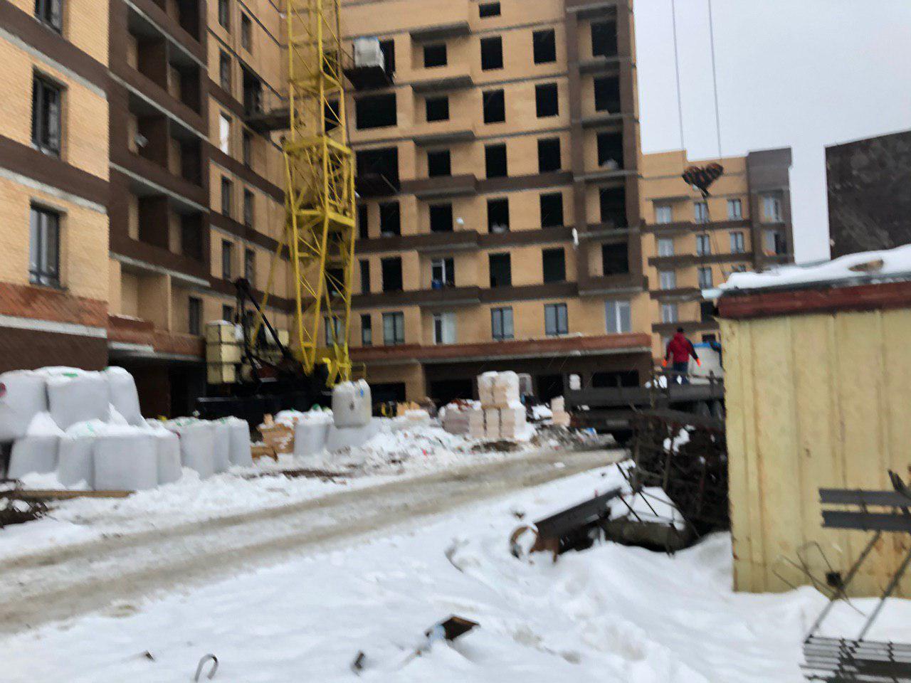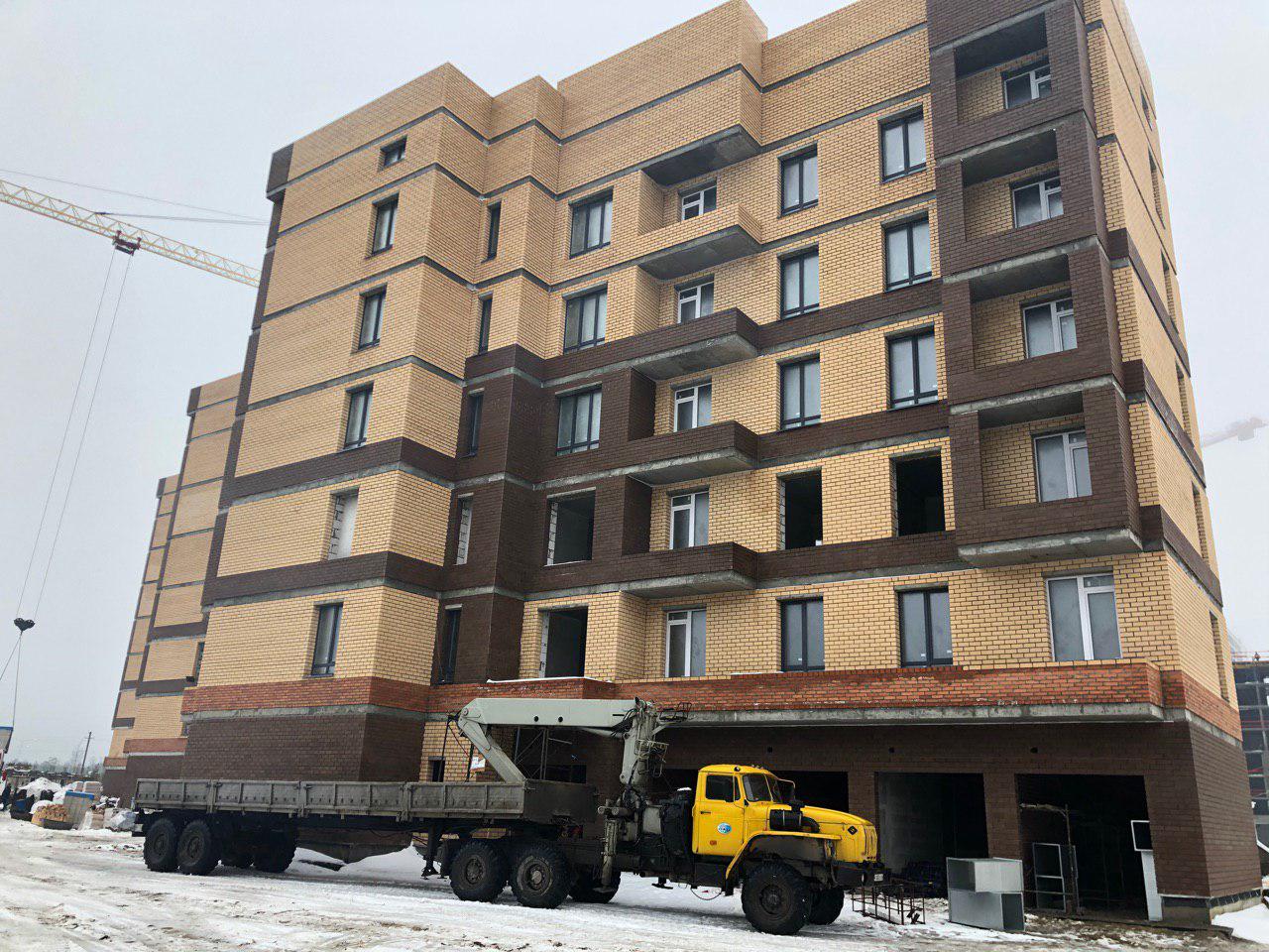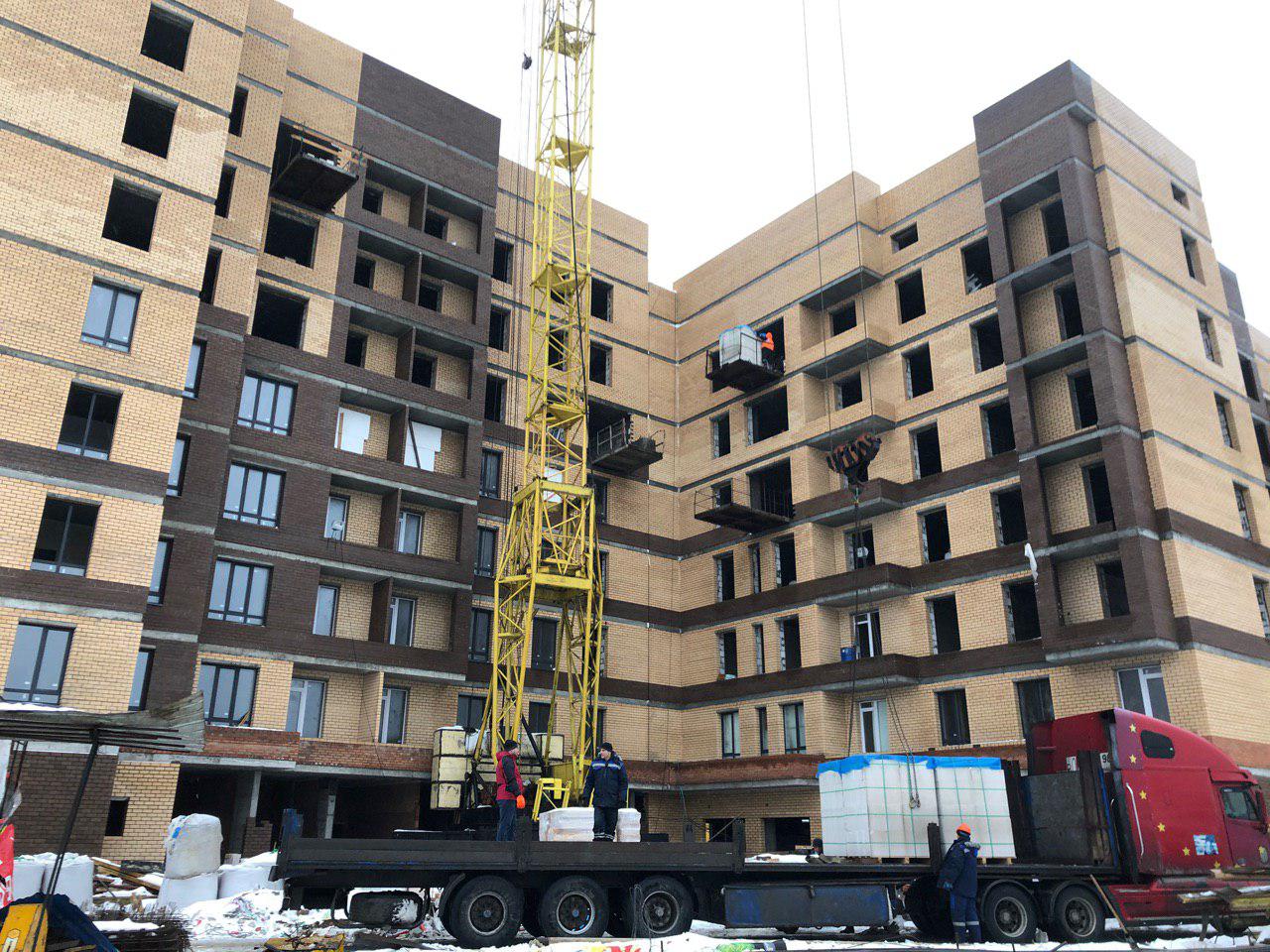 Работает кран, автокран, производится завоз и подъем строительного материала. Проводятся работы по остеклению оконных проемов.