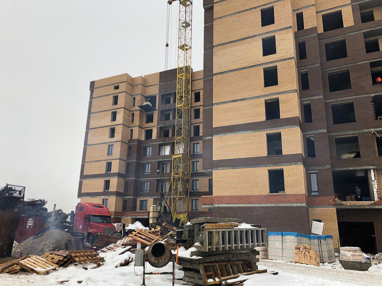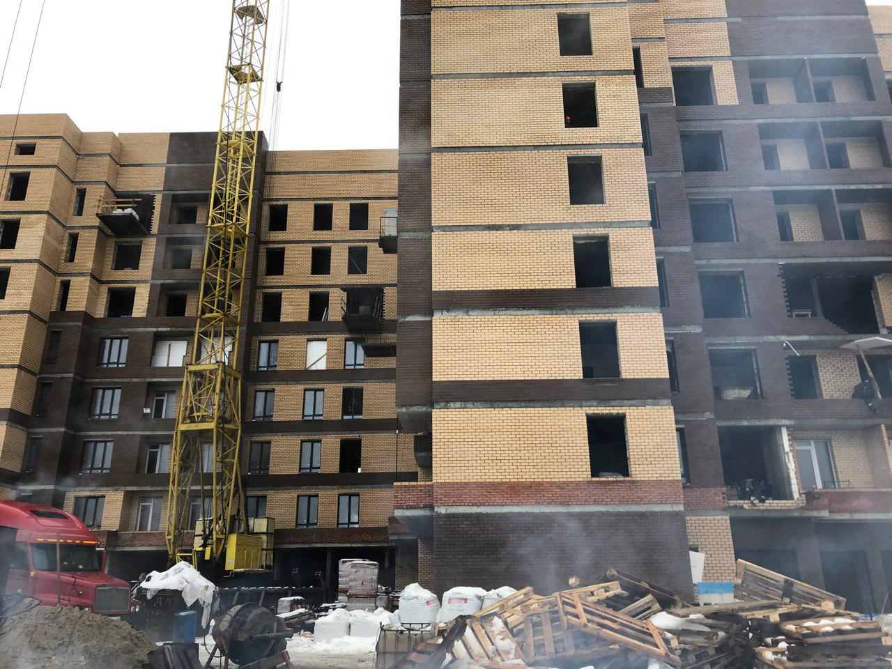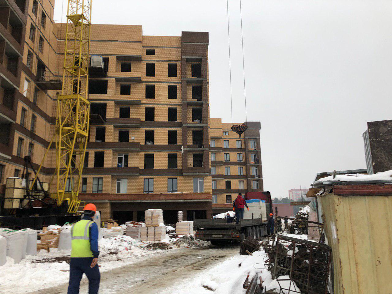 Работает кран, автокран, производится завоз и подъем строительного материала. Проводятся работы по остеклению оконных проемов.