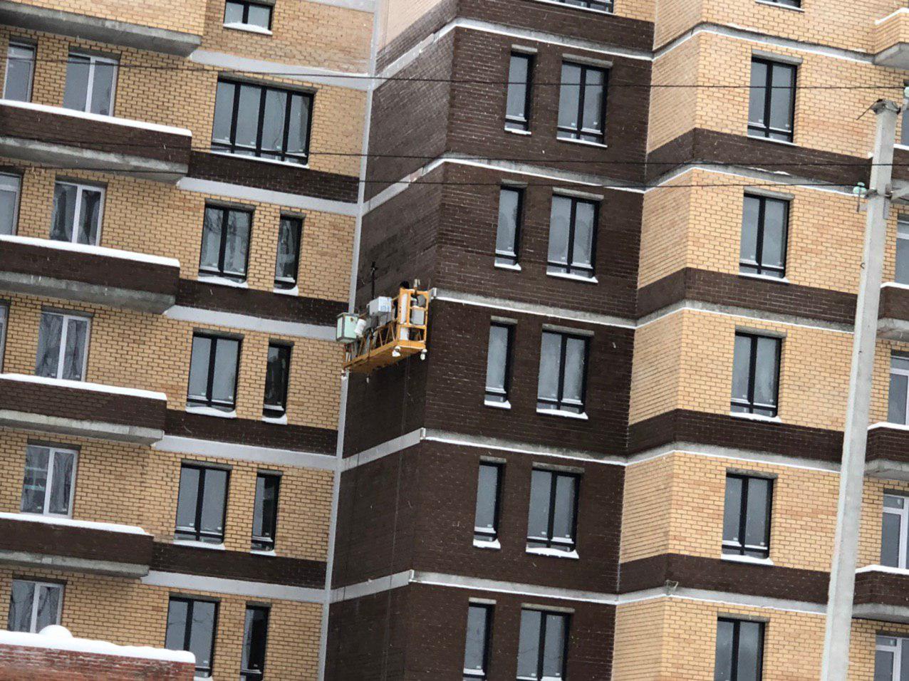 Работает кран, автокран, производится завоз и подъем строительного материала. Проводятся работы по остеклению оконных проемов.