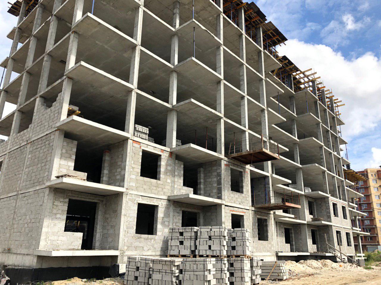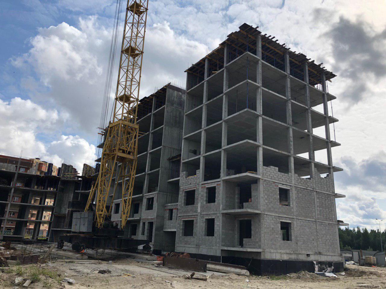 Проводится укладка ограждающих конструкций первого, второго, третьего этажа, работает автокран, завозится строительный материал.