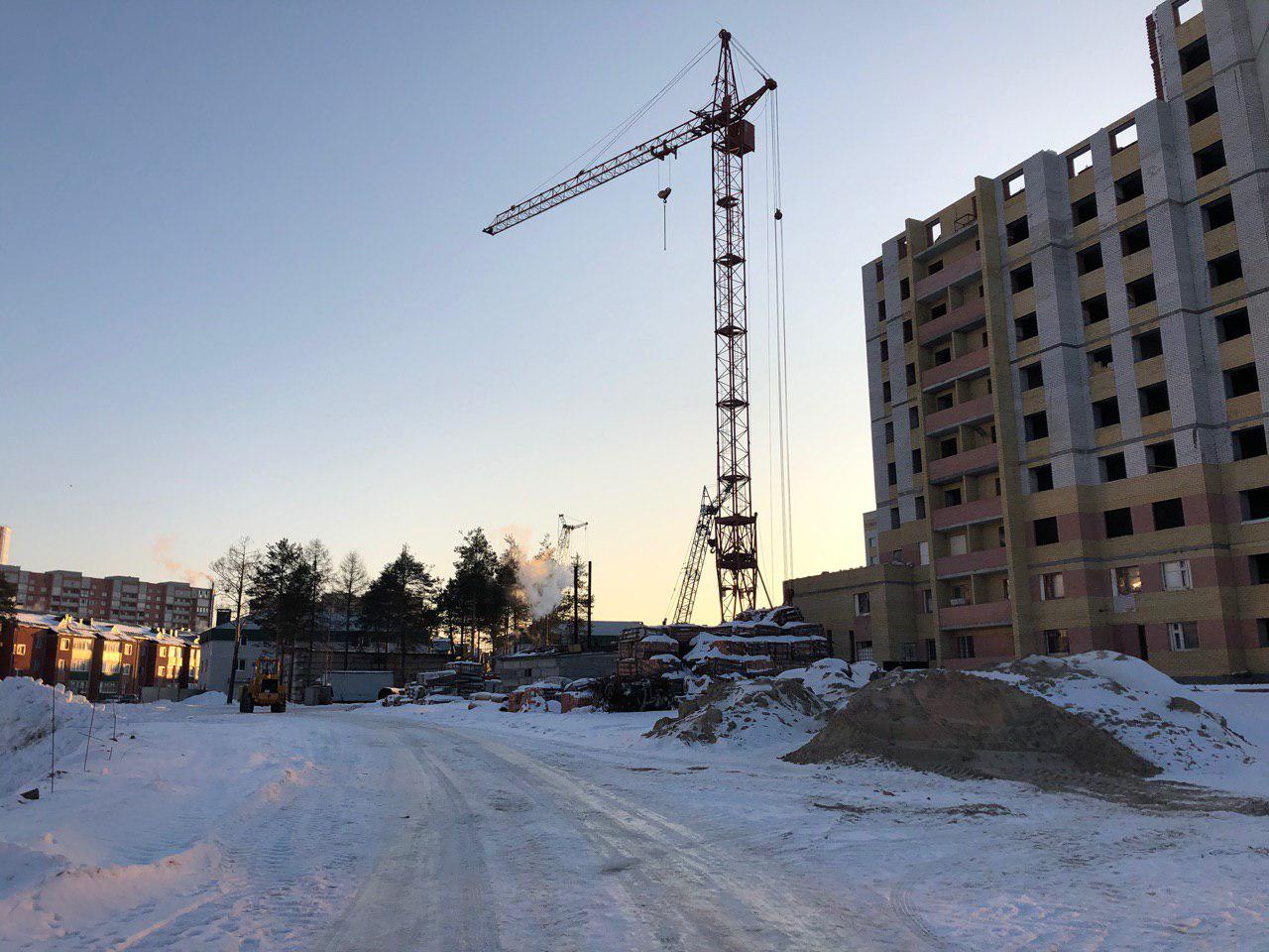 Ведется кладка ограждающих конструкций 10-го этажа 8 секции, а также 12 этажа 7 секции многоквартирного жилого дома. Работают краны, автотехника.