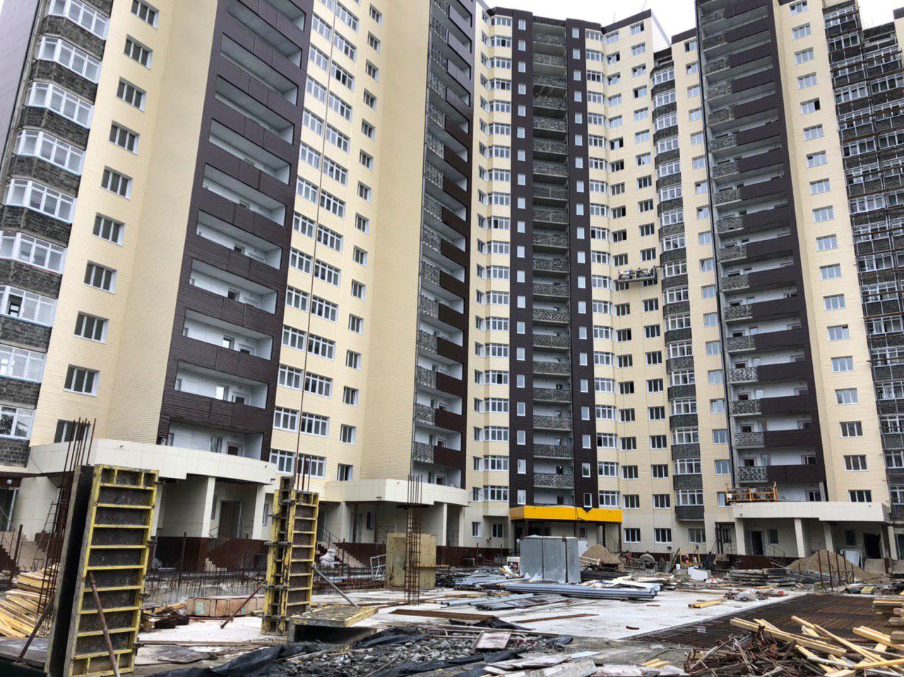 Рабочие в количестве 6-8 человек ведут отделку фасада, облицовку балконов общего пользования.