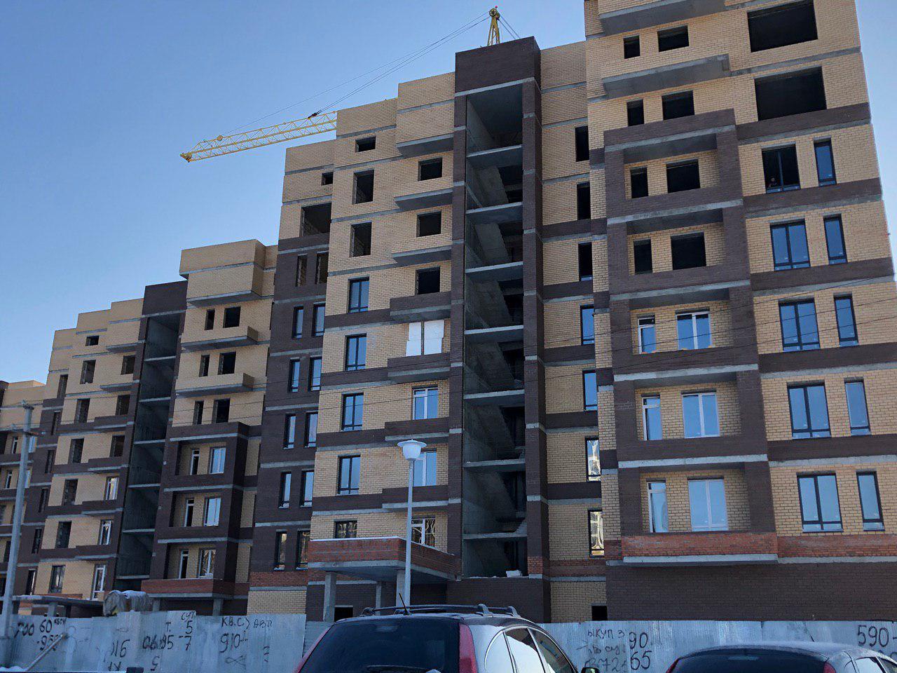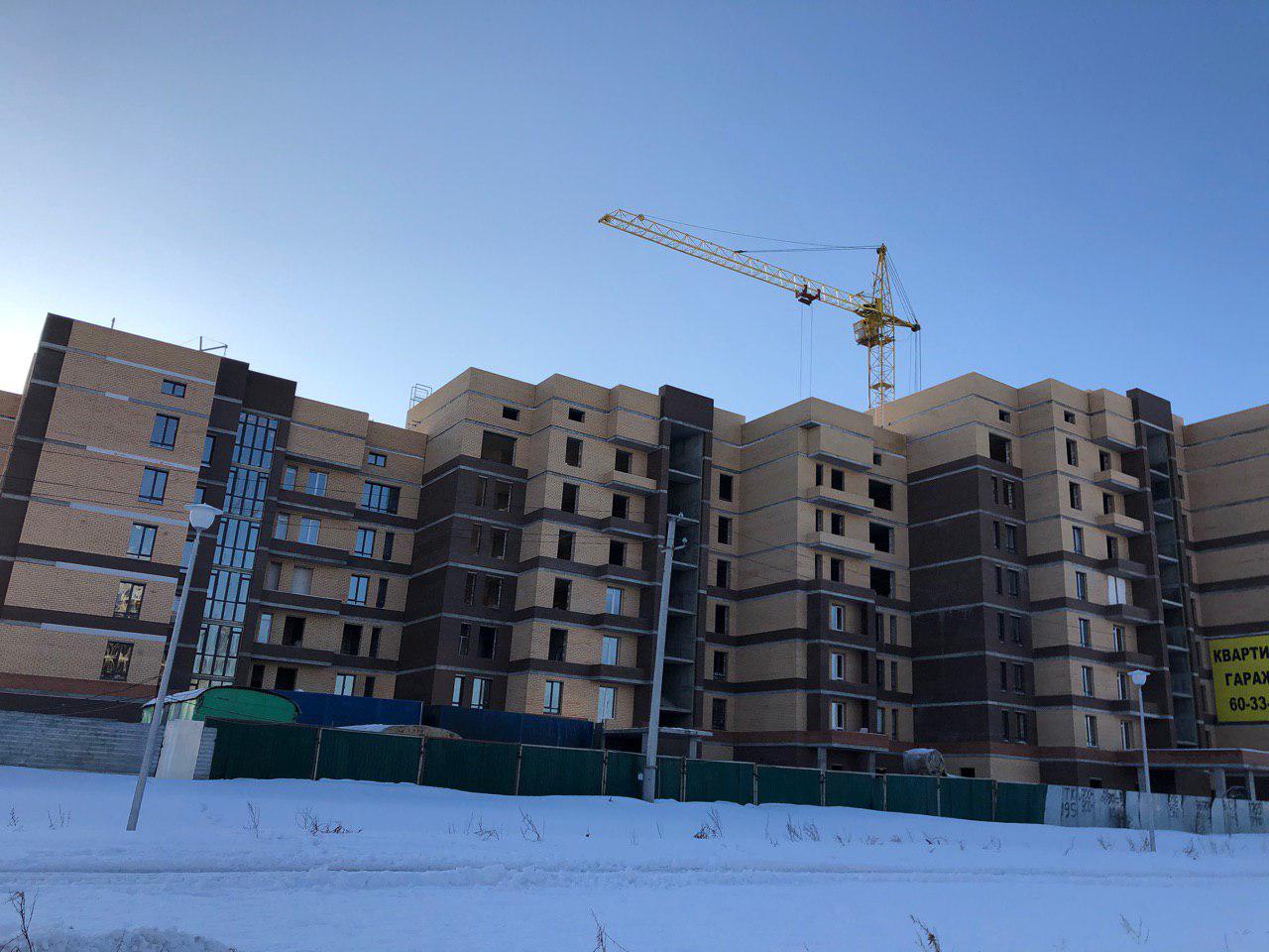 Работает кран, автокран, производится завоз и подъем строительного материала. Проводятся работы по остеклению оконных проемов.