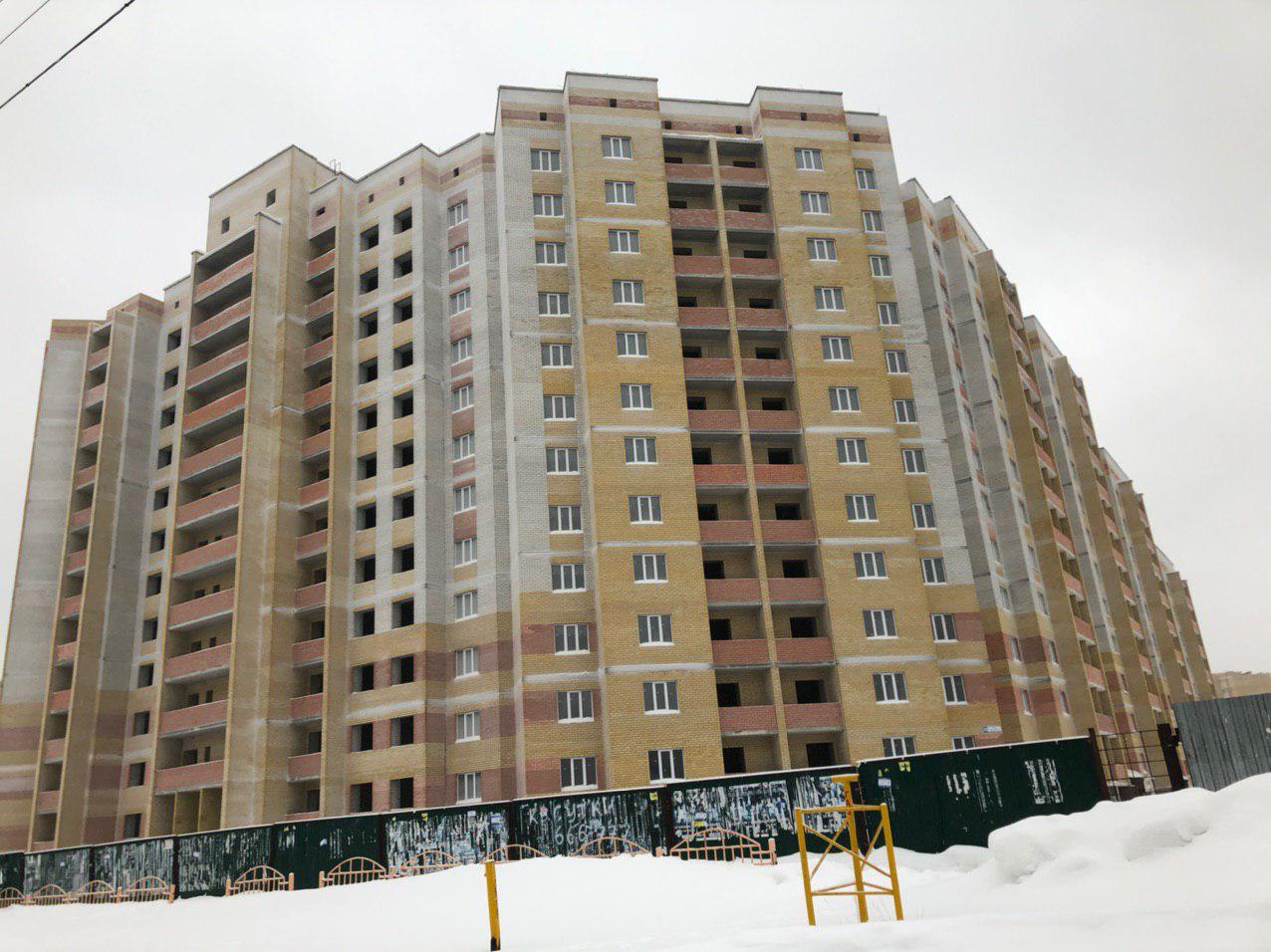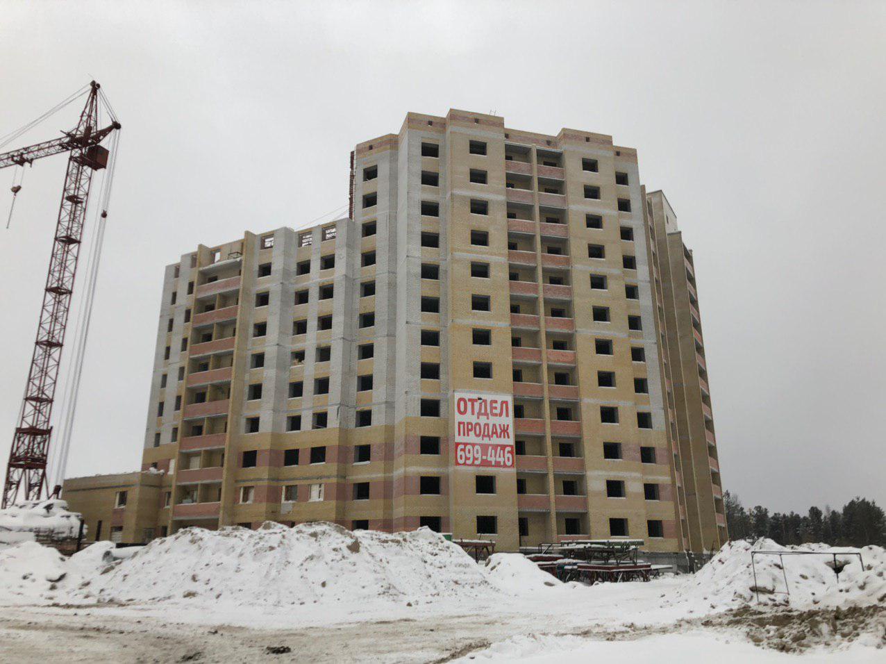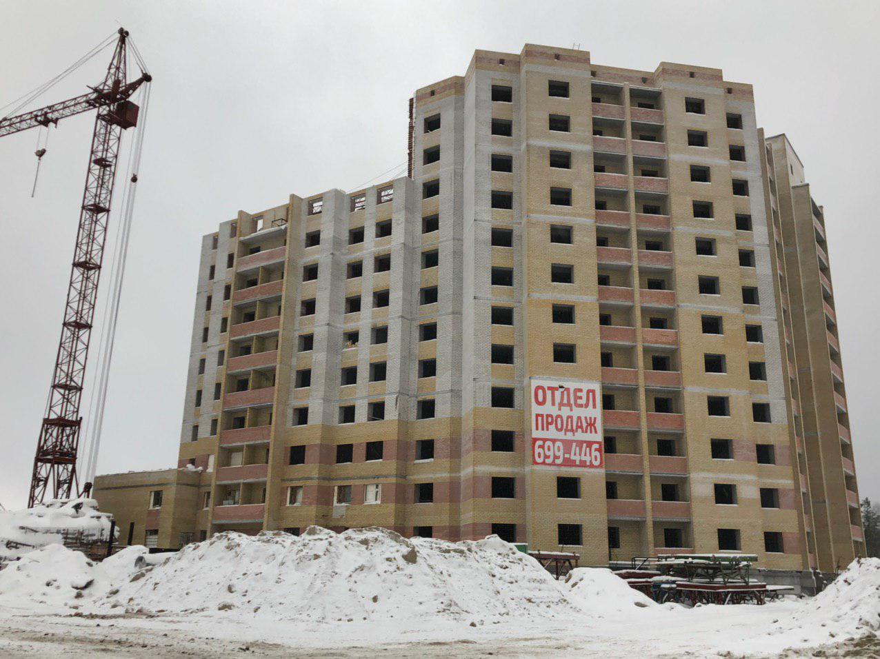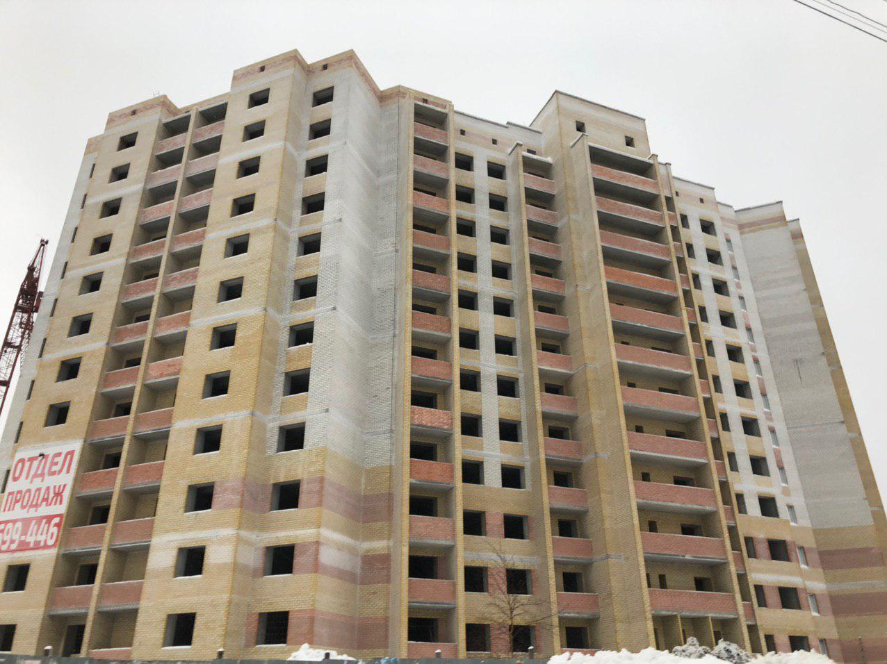 Ведется кладка ограждающих конструкций 10-го этажа 8 секции, а также 12 этажа 7 секции многоквартирного жилого дома. Работают краны, автотехника.