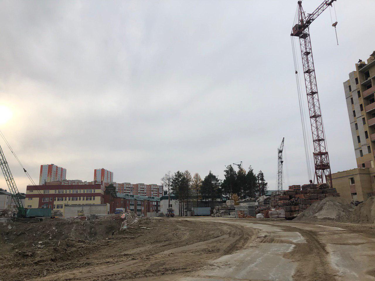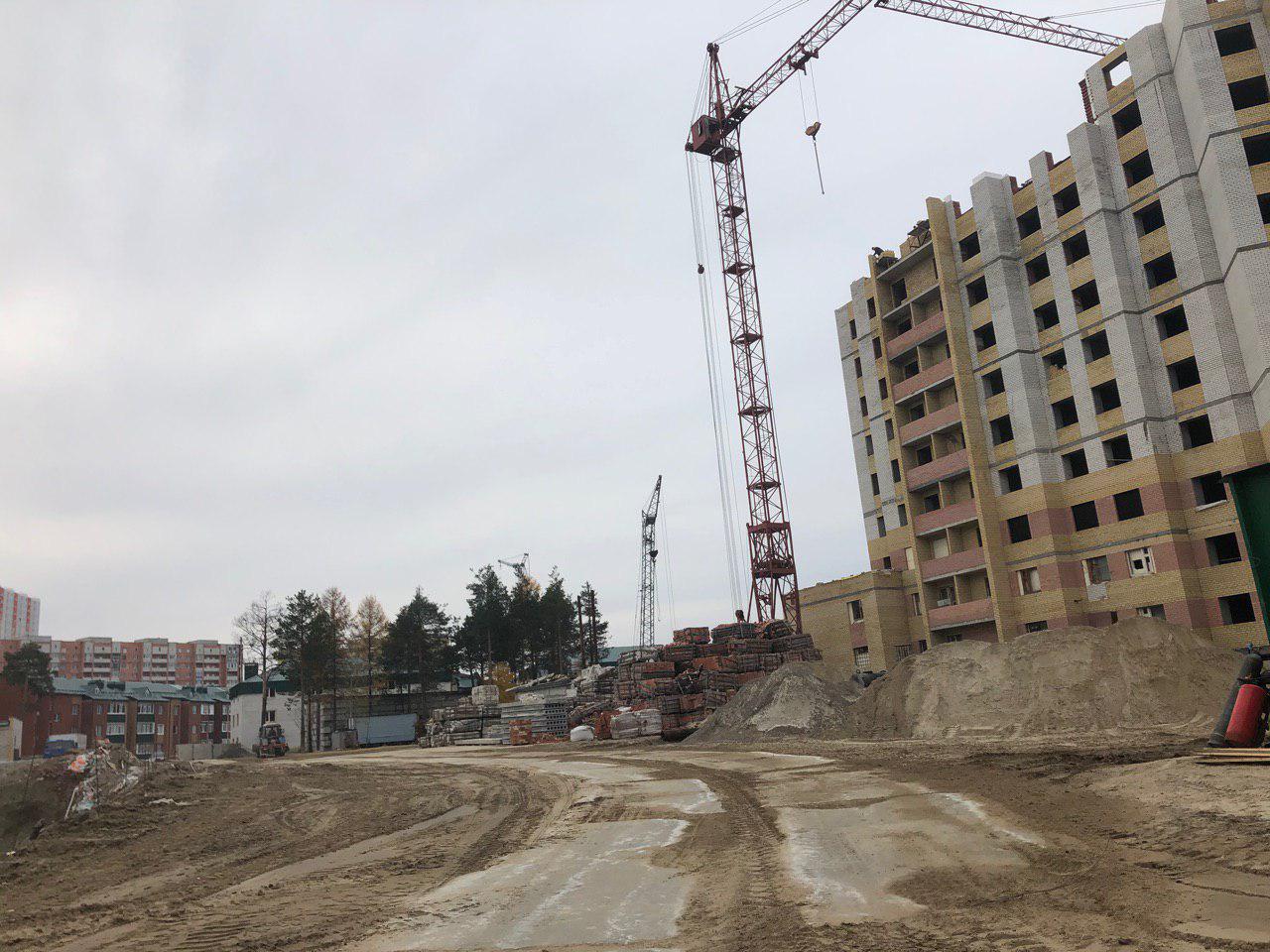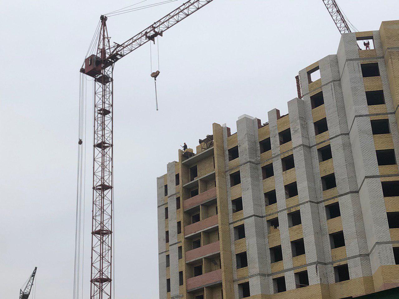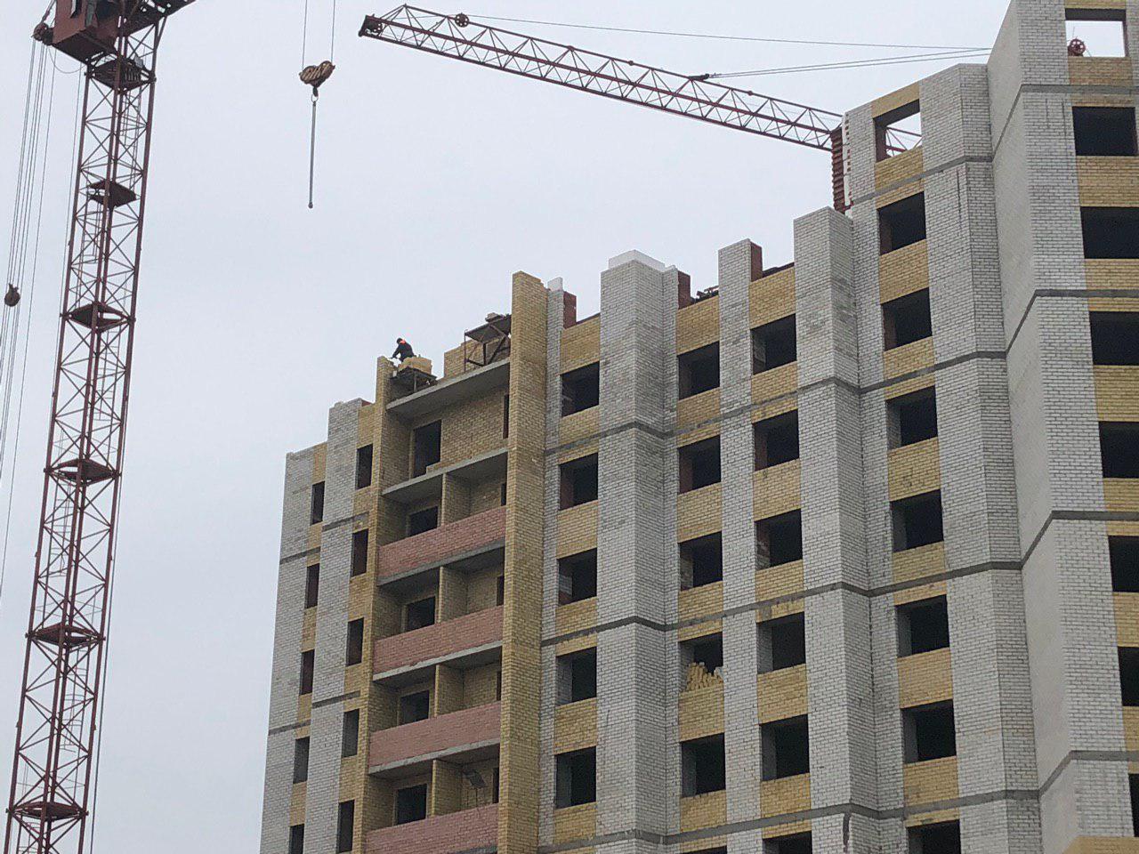 Ведется кладка ограждающих конструкций 9-го этажа секции 8 многоквартирного жилого дома и перегородок. Ведутся работы на кровле. Работают 2 кран, бульдозер, самосвал.