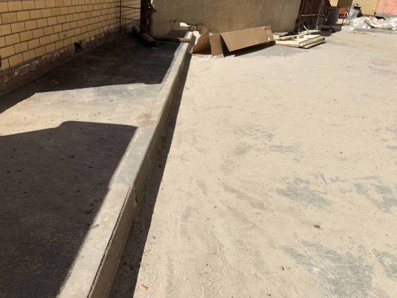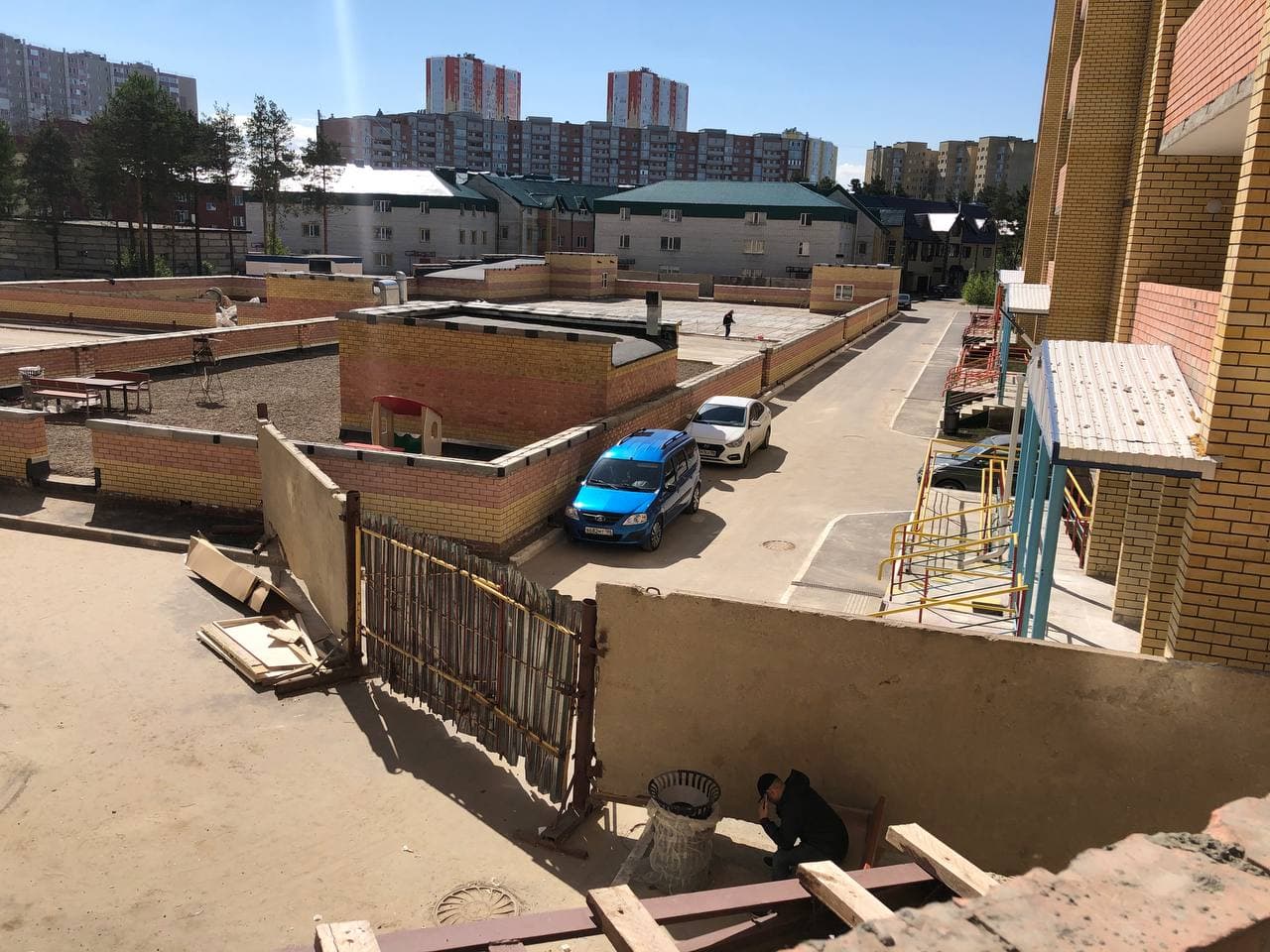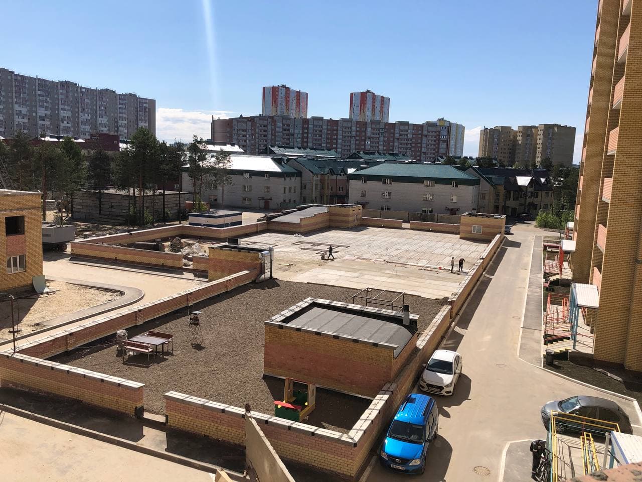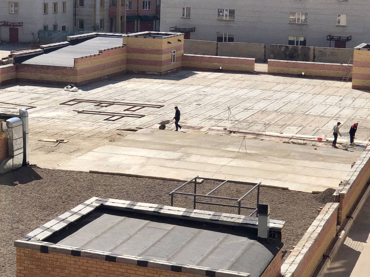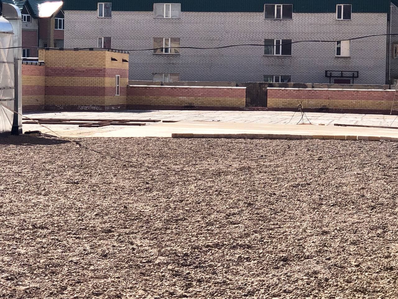 На придомовой территории идет установка МАФ, благоустройство территории на крыше паркинга, заливка бетонной стяжки.