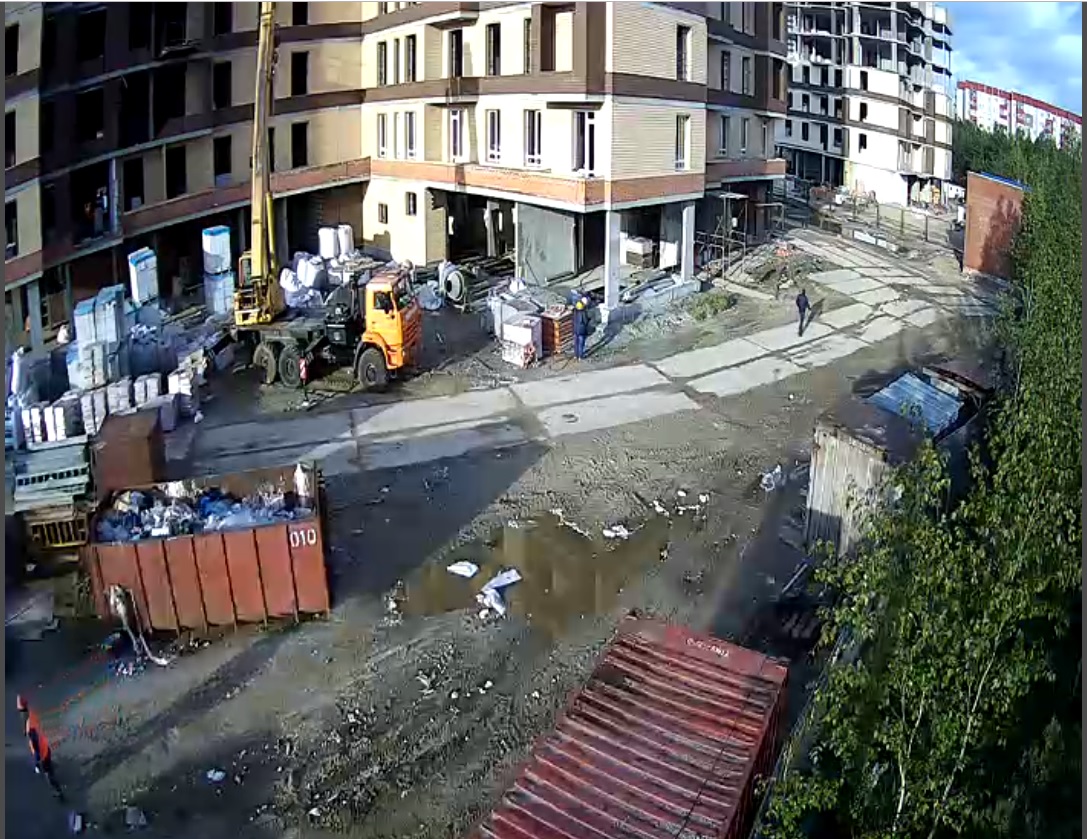 Работает кран, автокран, производится завоз и подъем строительного материала.