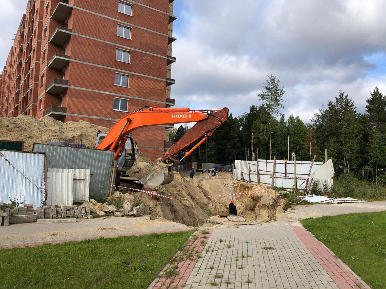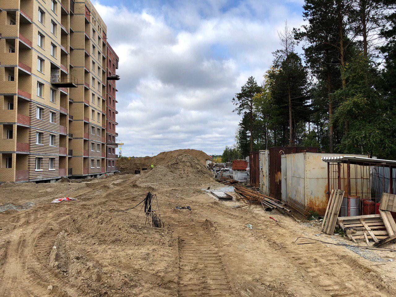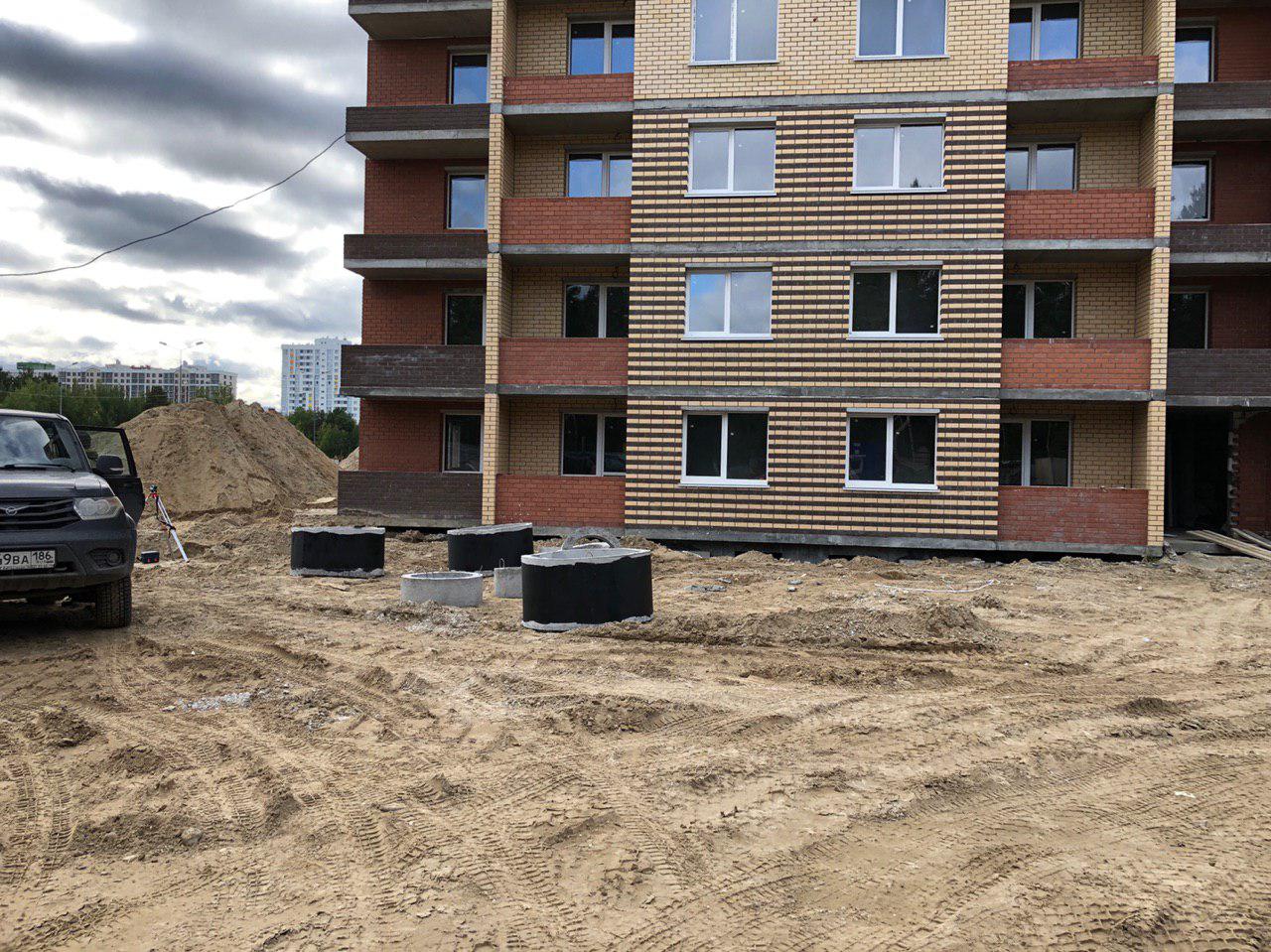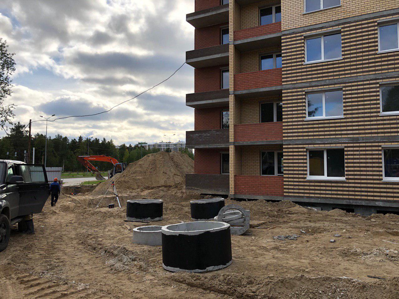В настоящий момент ведутся земляные работы для укладки наружных и внутренних инженерных сетей (горячего и холодного водоснабжения). Проводятся работы по проводке электрических сетей внутри жилого дома. Работают экскаватор и бульдозер. На площадке работает порядка 10 человек.