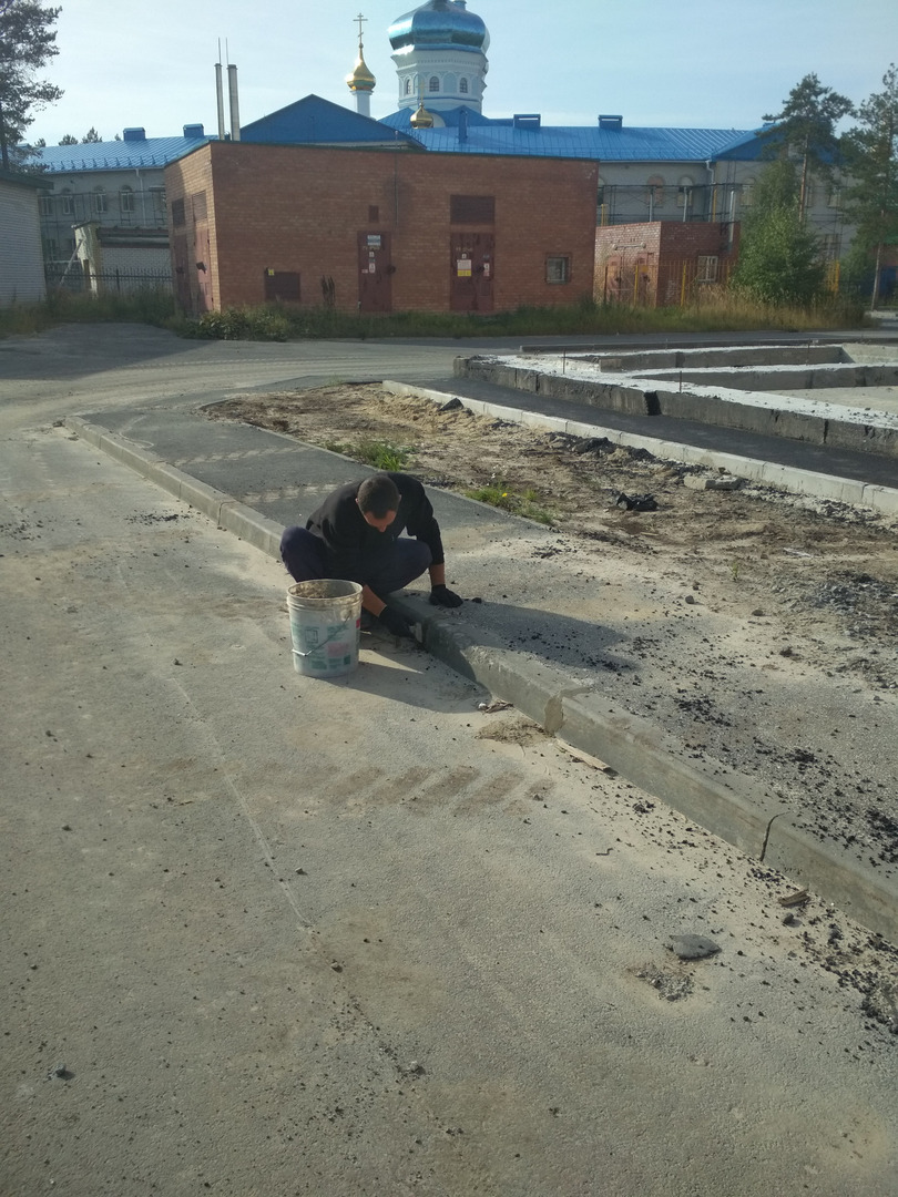 На внутренних проездах рабочий ведет работы по благоустройству бордюра.