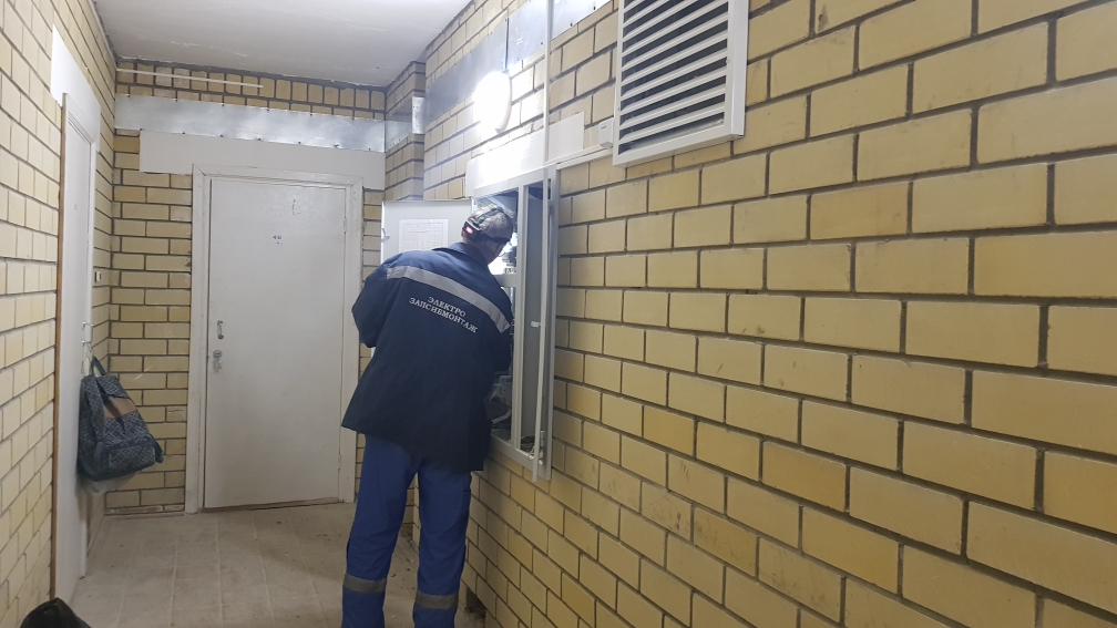 В первом подъезде ведется работа по наладке электрических счетчиков в местах общего пользования.