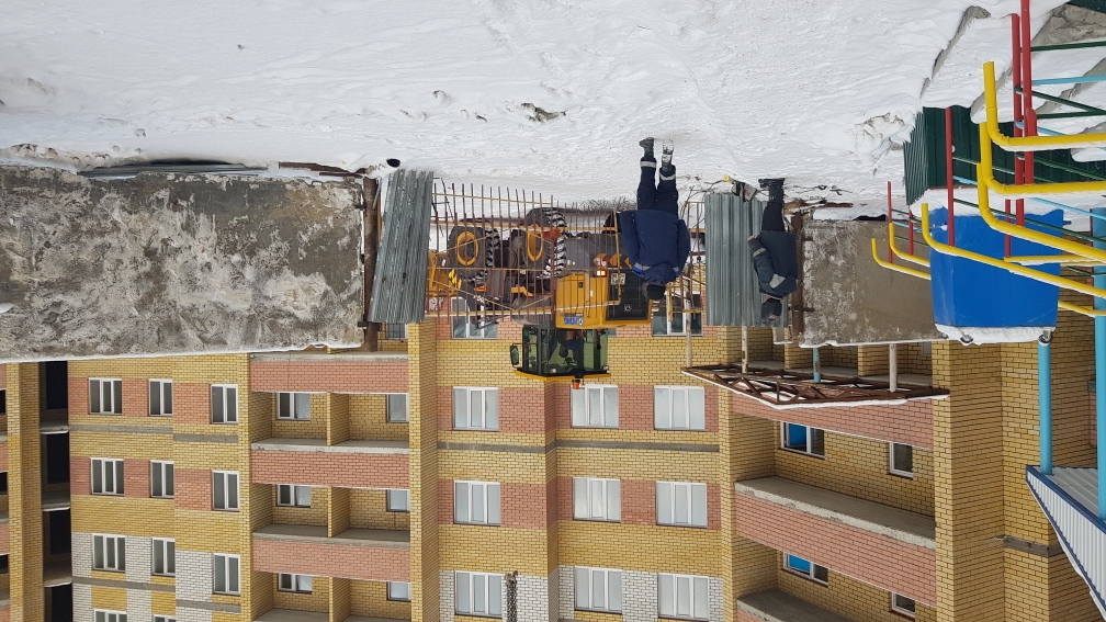 На строительной площадке первых четырех подъездов находятся ориентировочно 10-15 рабочих.