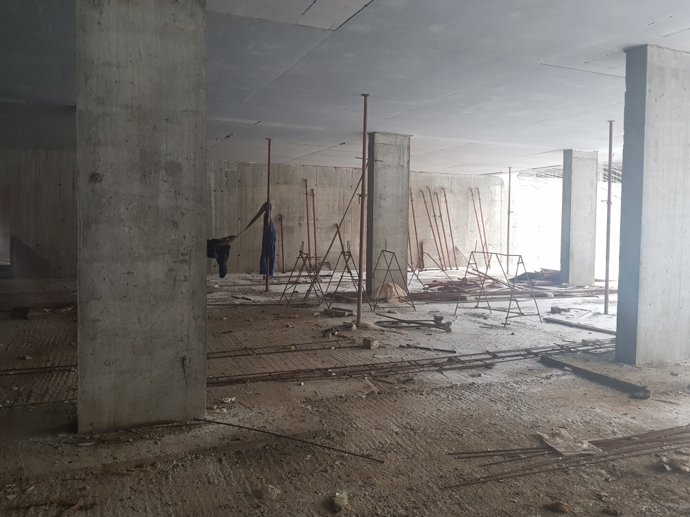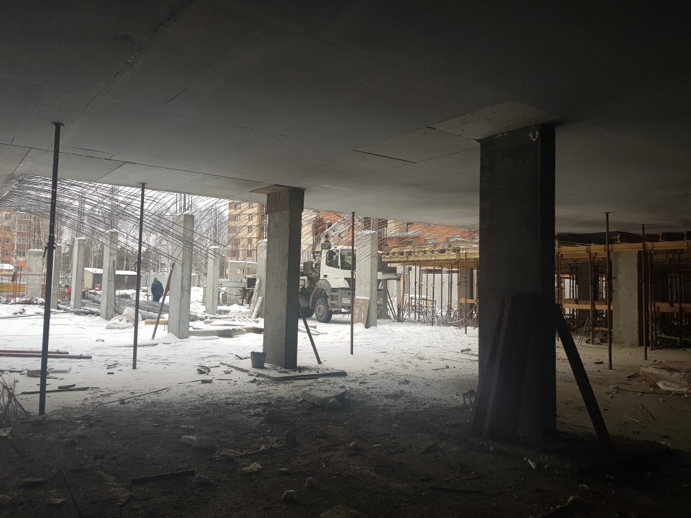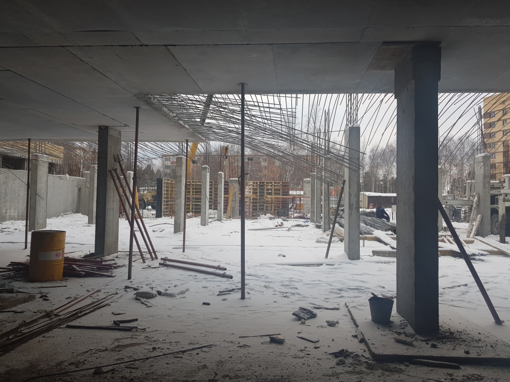 Ведутся работы по устройству монолитной плиты перекрытия паркинга, кладка внутренних стен. Подготовка и монтаж арматурных каркасов и опалубки стен помещений паркинга.