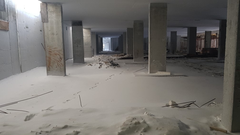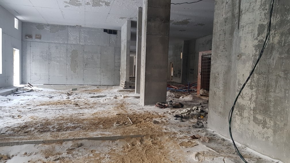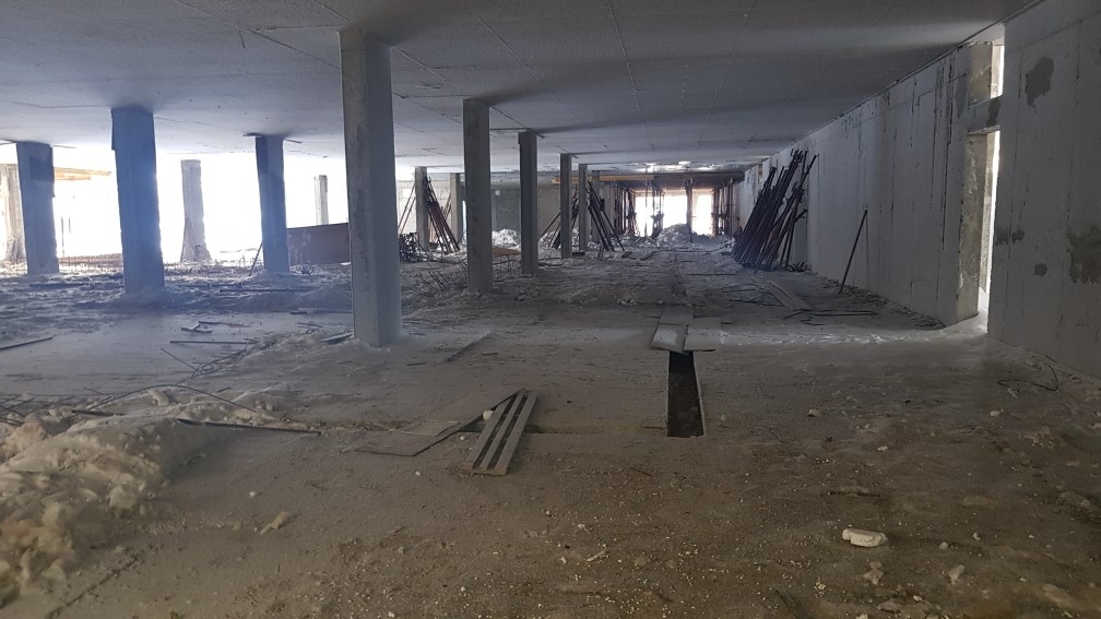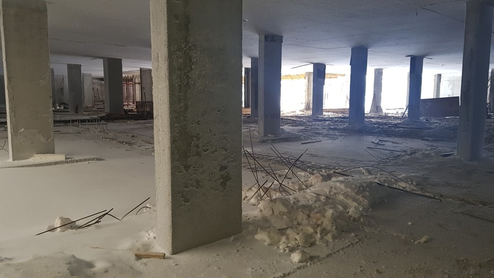 Ведутся работы по устройству монолитной плиты перекрытия паркинга, кладка внутренних стен. Подготовка и монтаж арматурных каркасов и опалубки стен помещений паркинга.