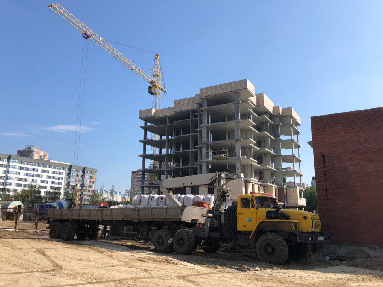 Проведена работа по подъему строительных материалов на каждый этаж. Производится завоз строительных материалов. Работает кран.