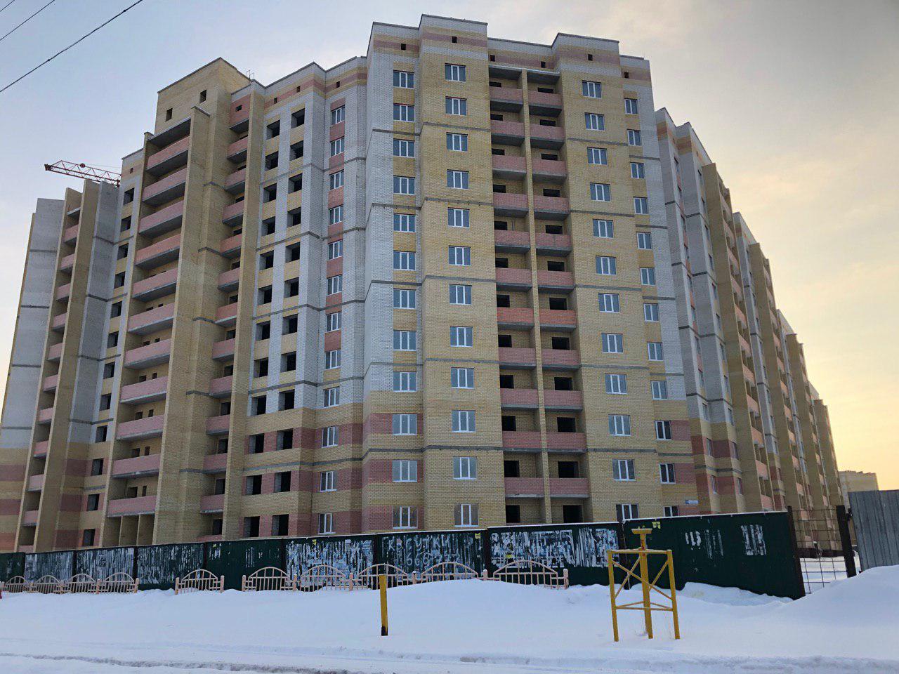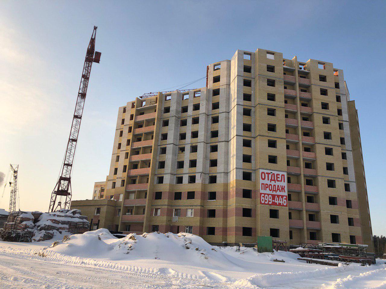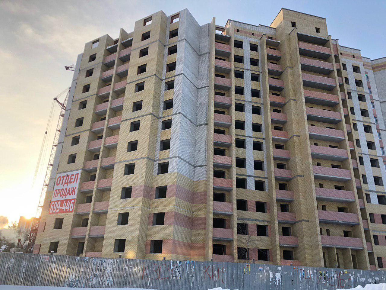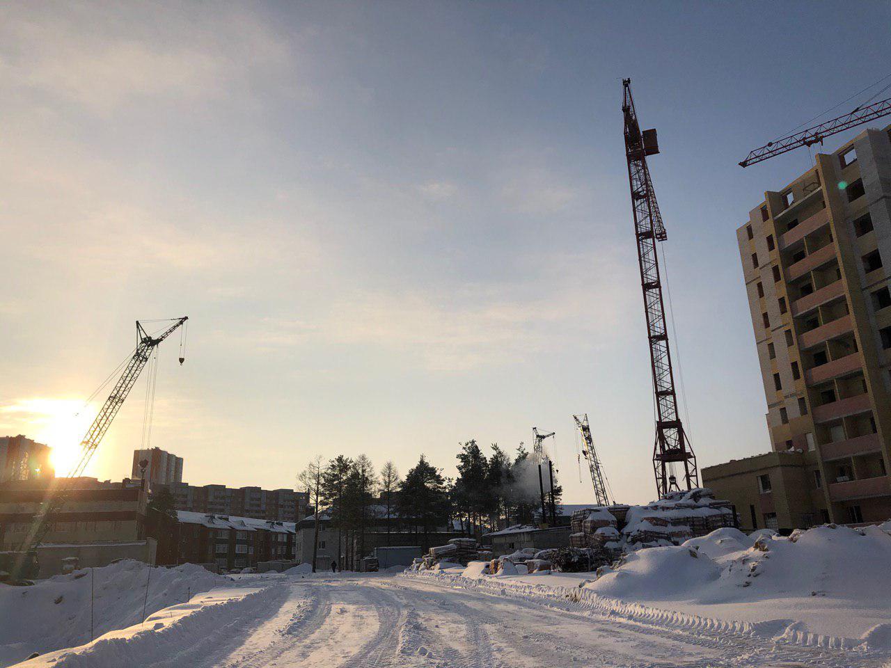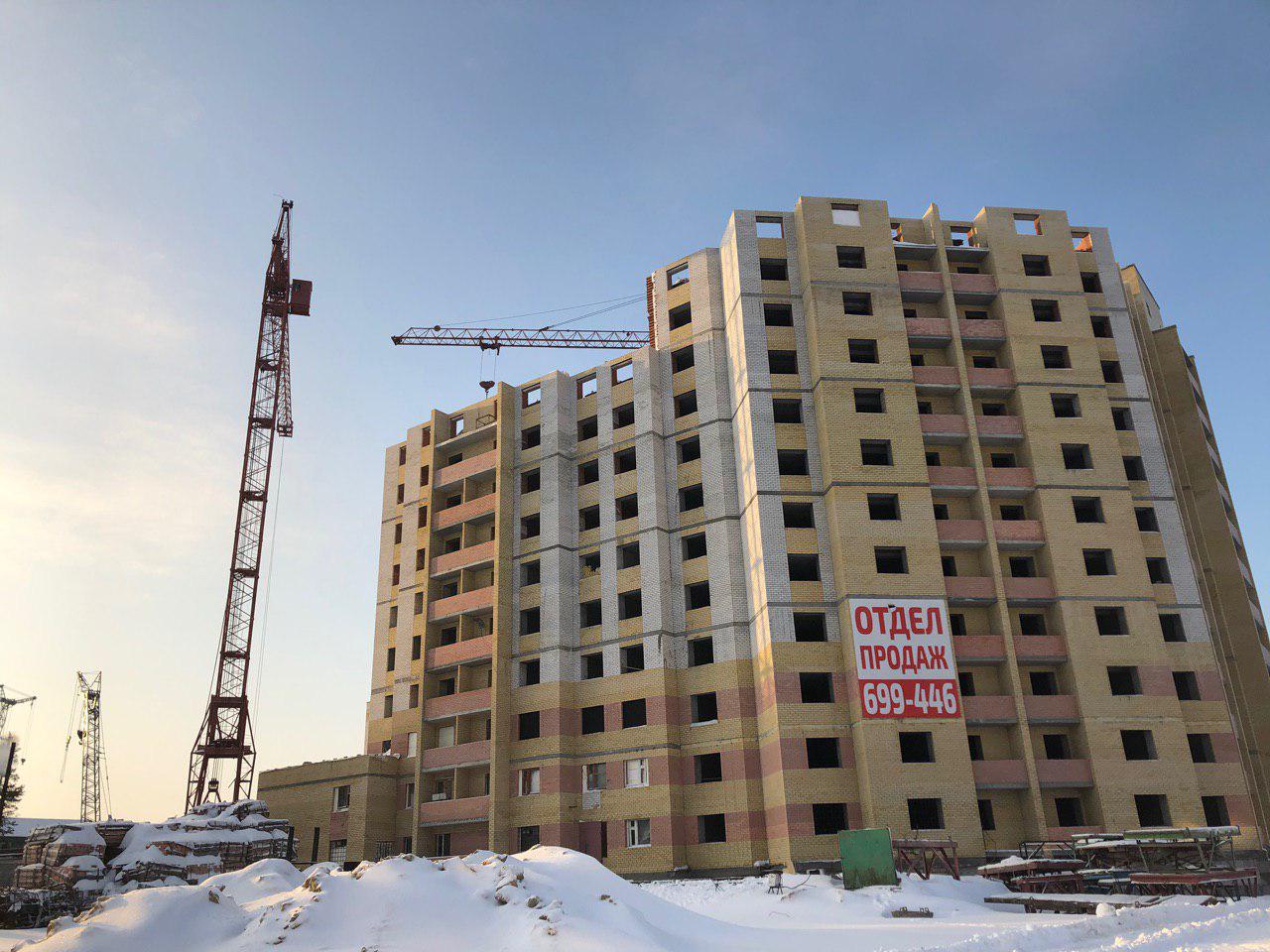 Ведется кладка ограждающих конструкций 10-го этажа 8 секции, а также 12 этажа 7 секции многоквартирного жилого дома. Работают краны, автотехника.