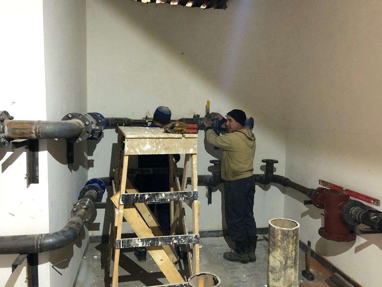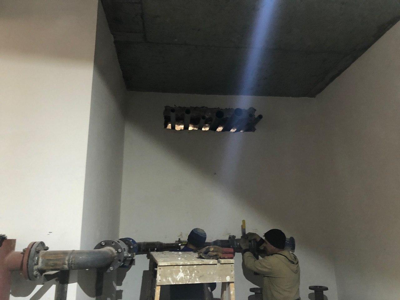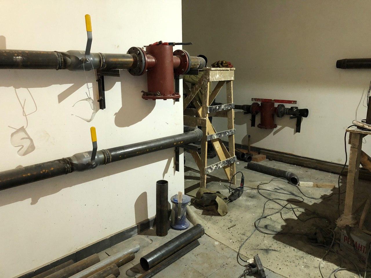 Ведутся работы по прокладке труб теплоснабжения внутри помещений.
