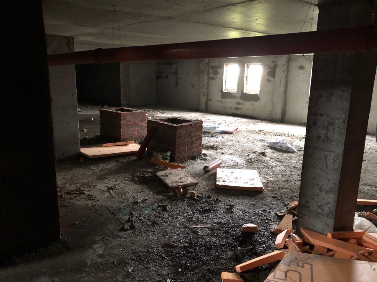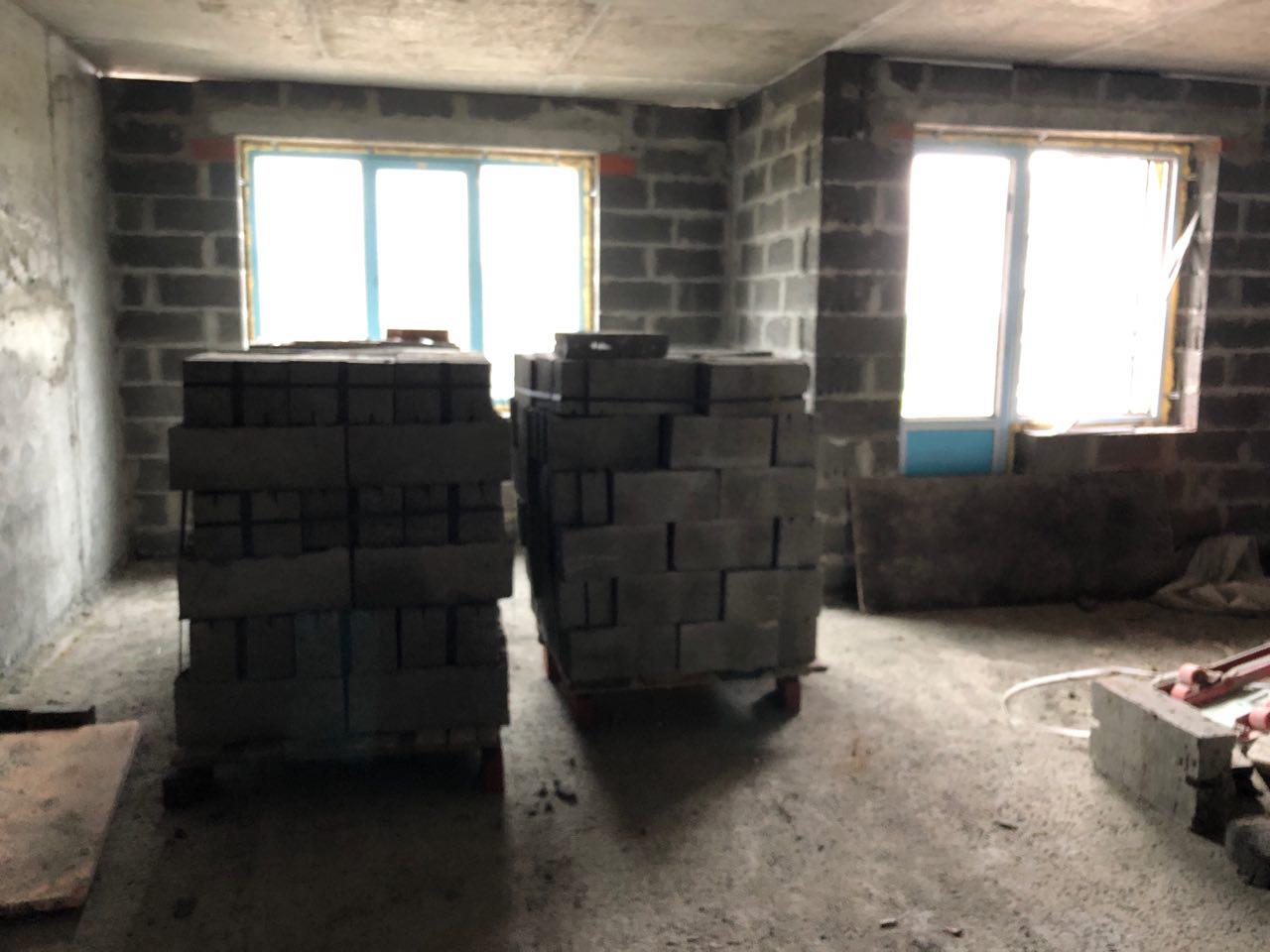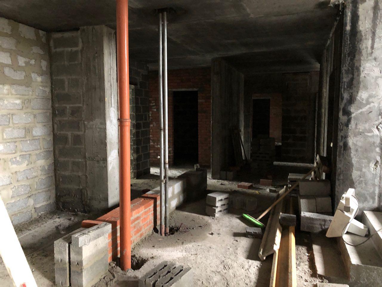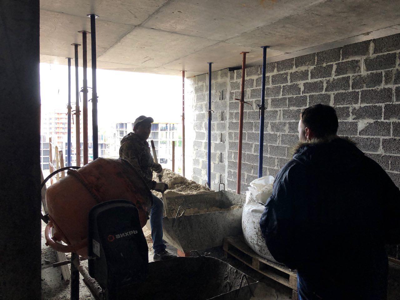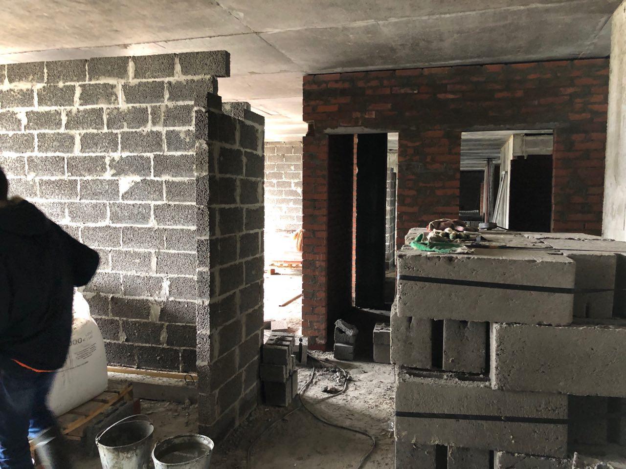 4 человека производят кладку перегородок на 7 и 8 этажах в 5 подъезде.