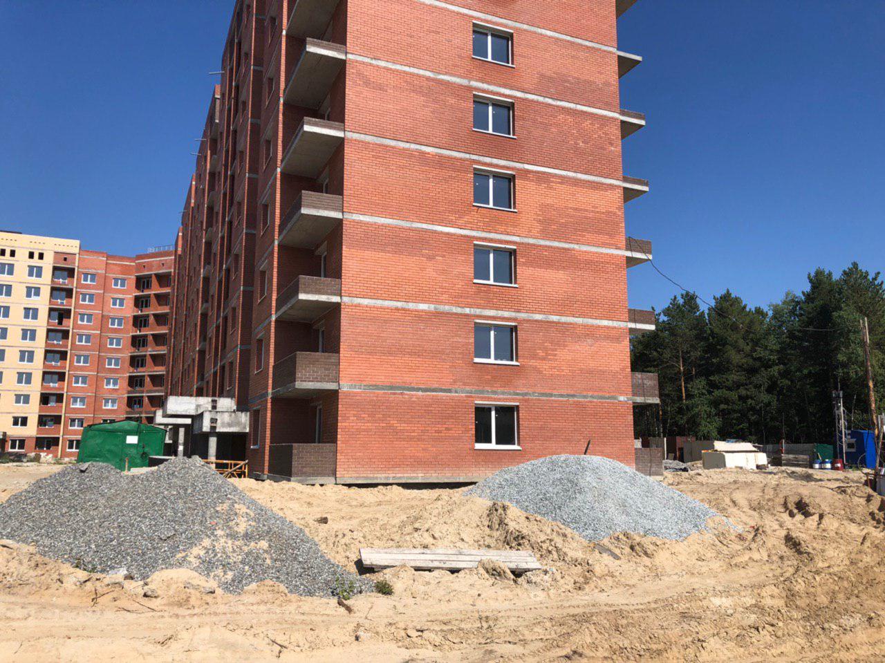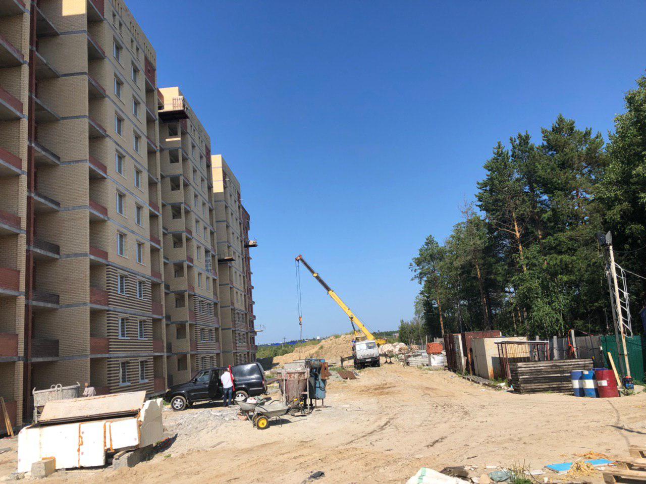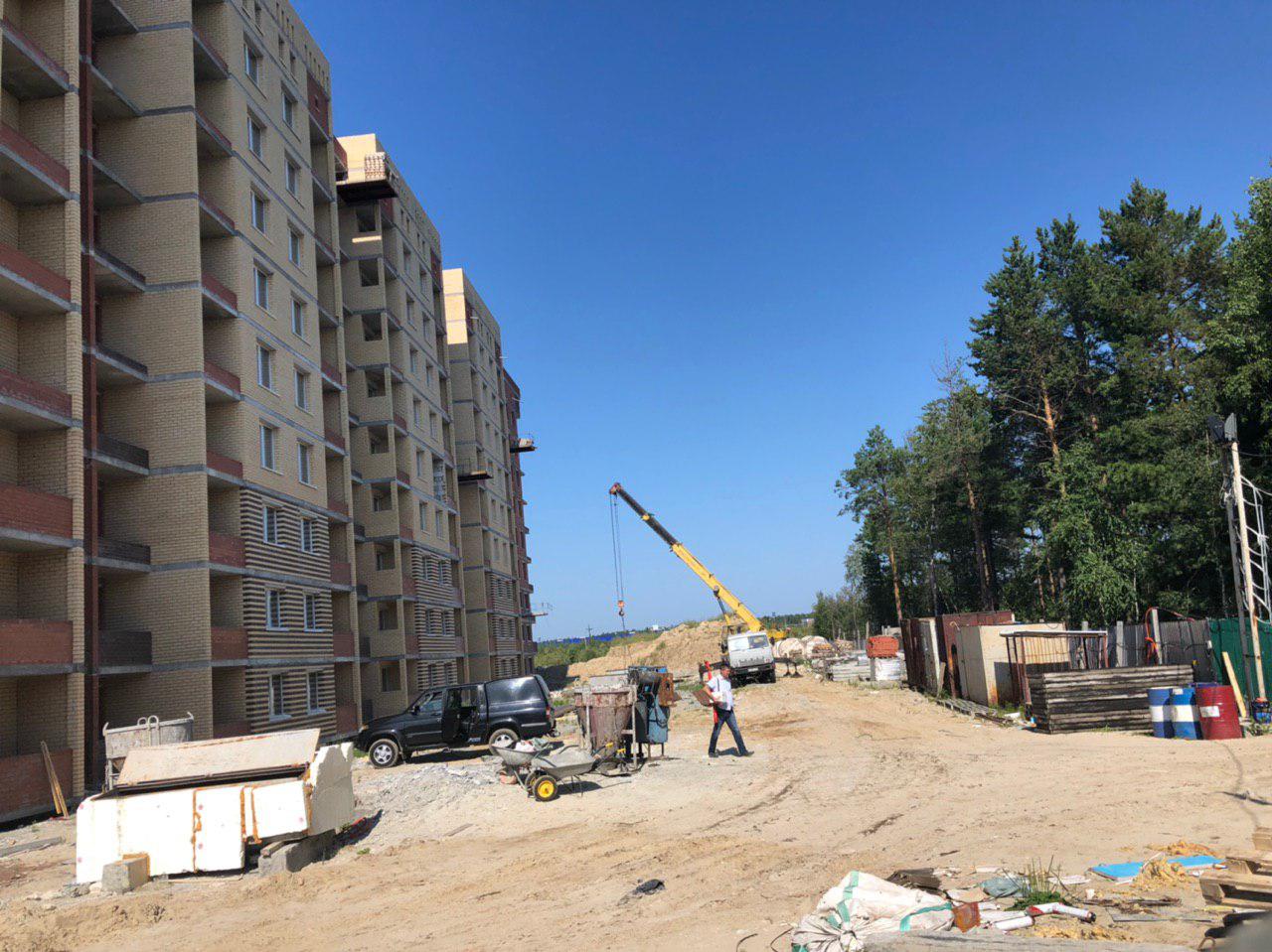 Со стороны внешнего фасада работает автокран, ведутся внутренние работы.