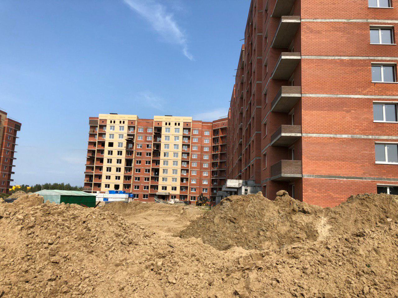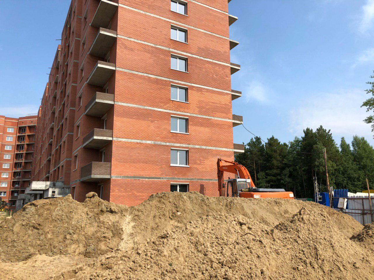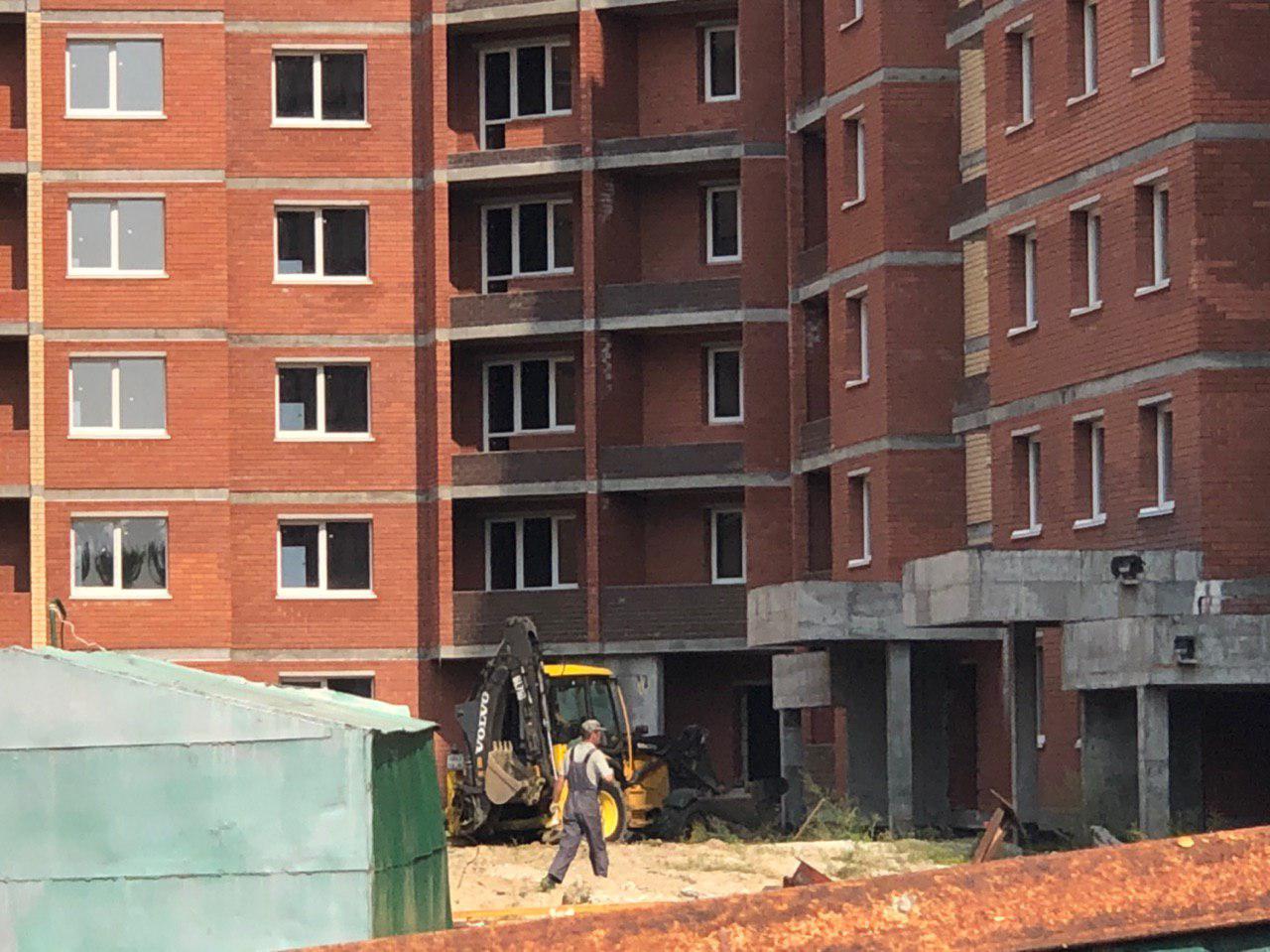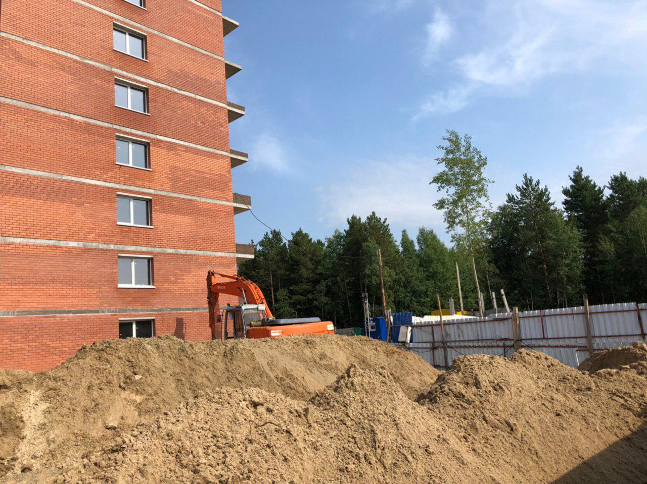 Ведутся земляные работы, работает кран, погрузчик.