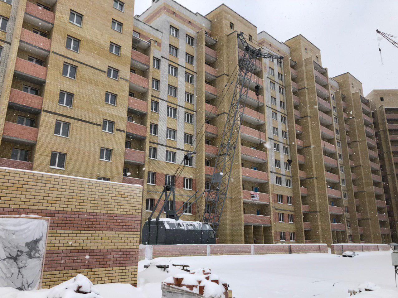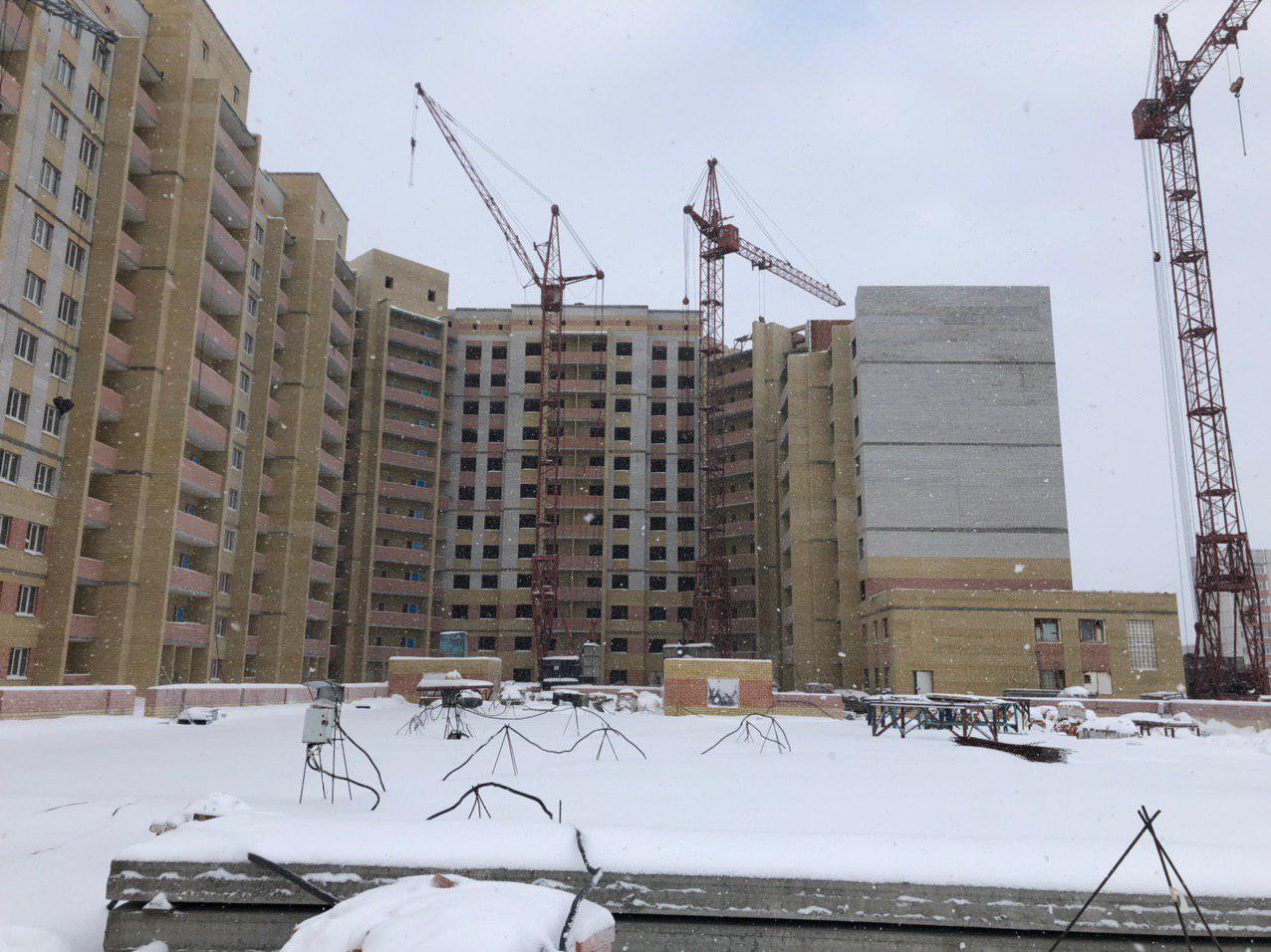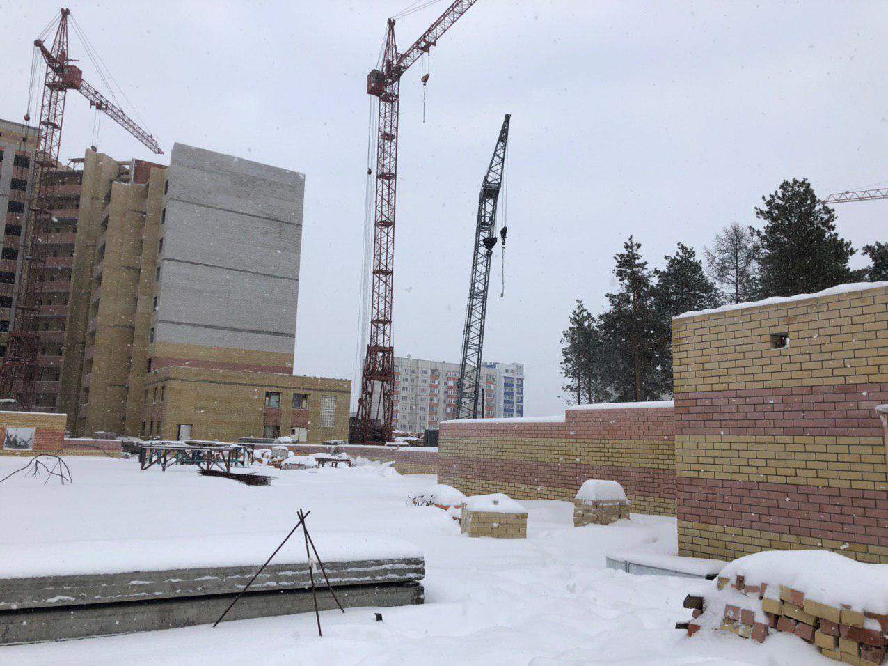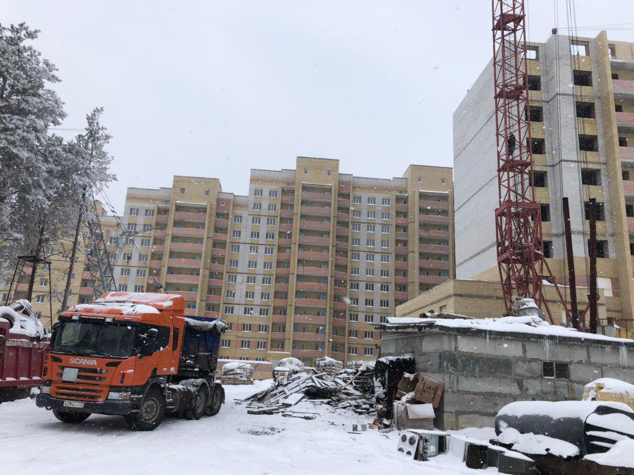 Ведется кладка ограждающих конструкций 10-го этажа 8 секции, а также 12 этажа 7 секции многоквартирного жилого дома. Работают краны, автотехника.