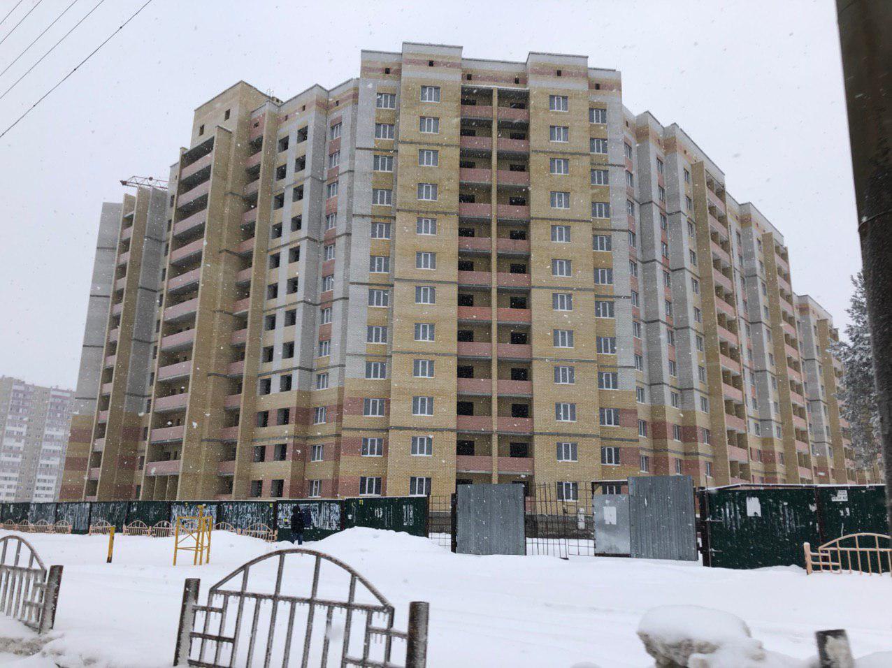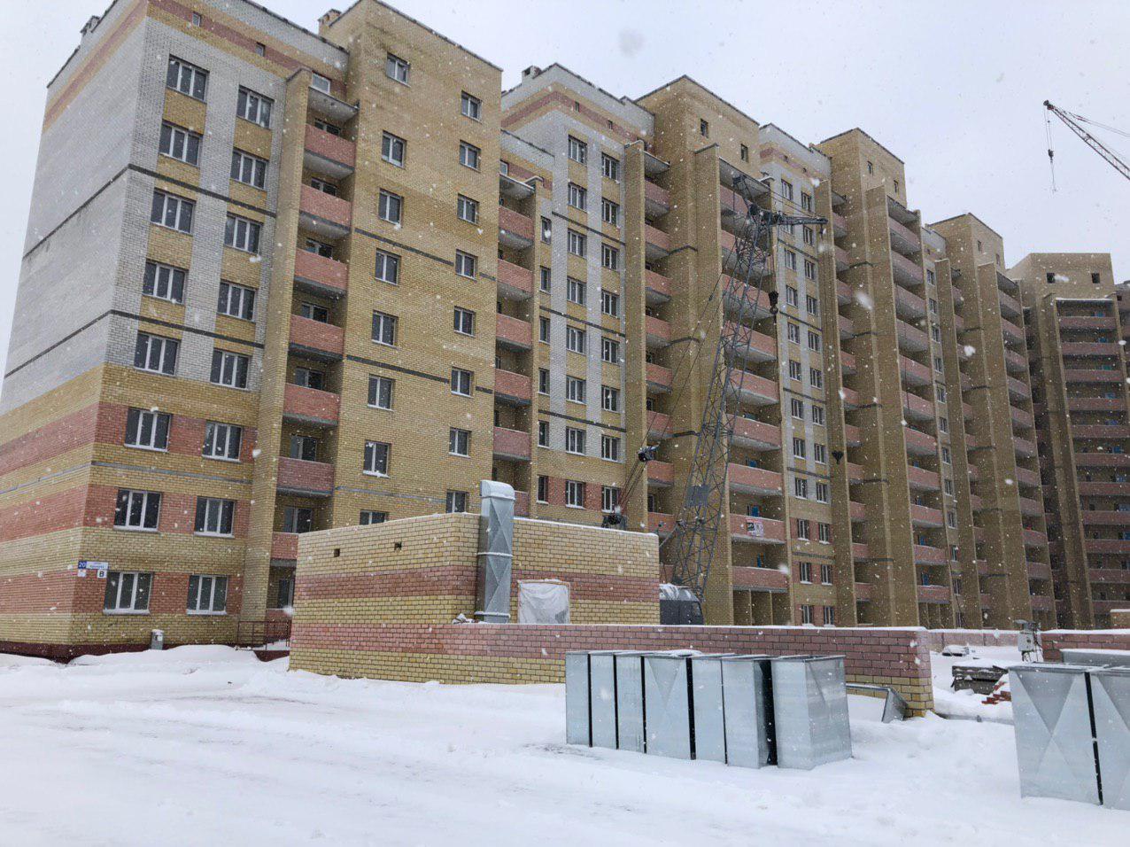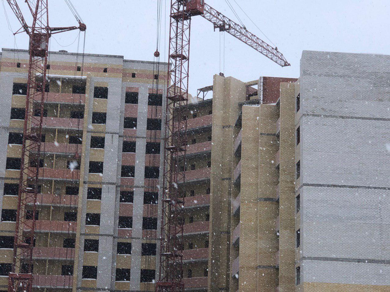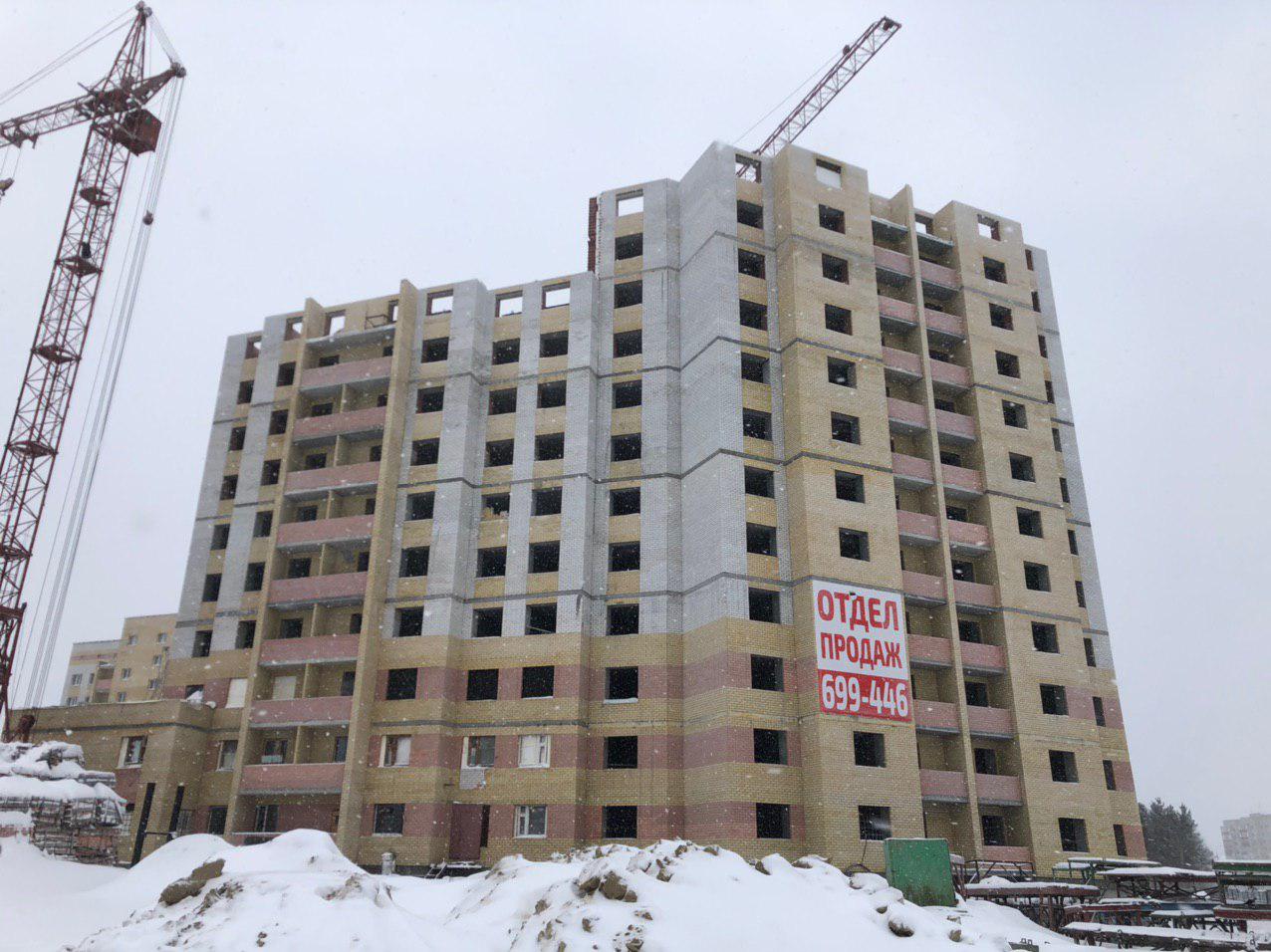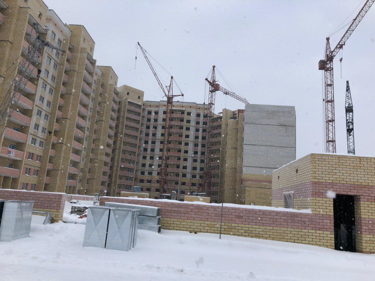 Ведется кладка ограждающих конструкций 10-го этажа 8 секции, а также 12 этажа 7 секции многоквартирного жилого дома. Работают краны, автотехника.