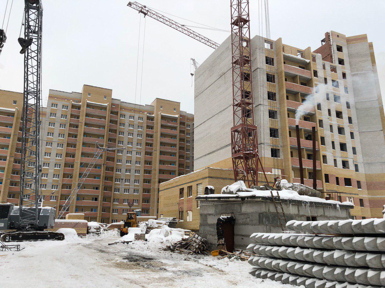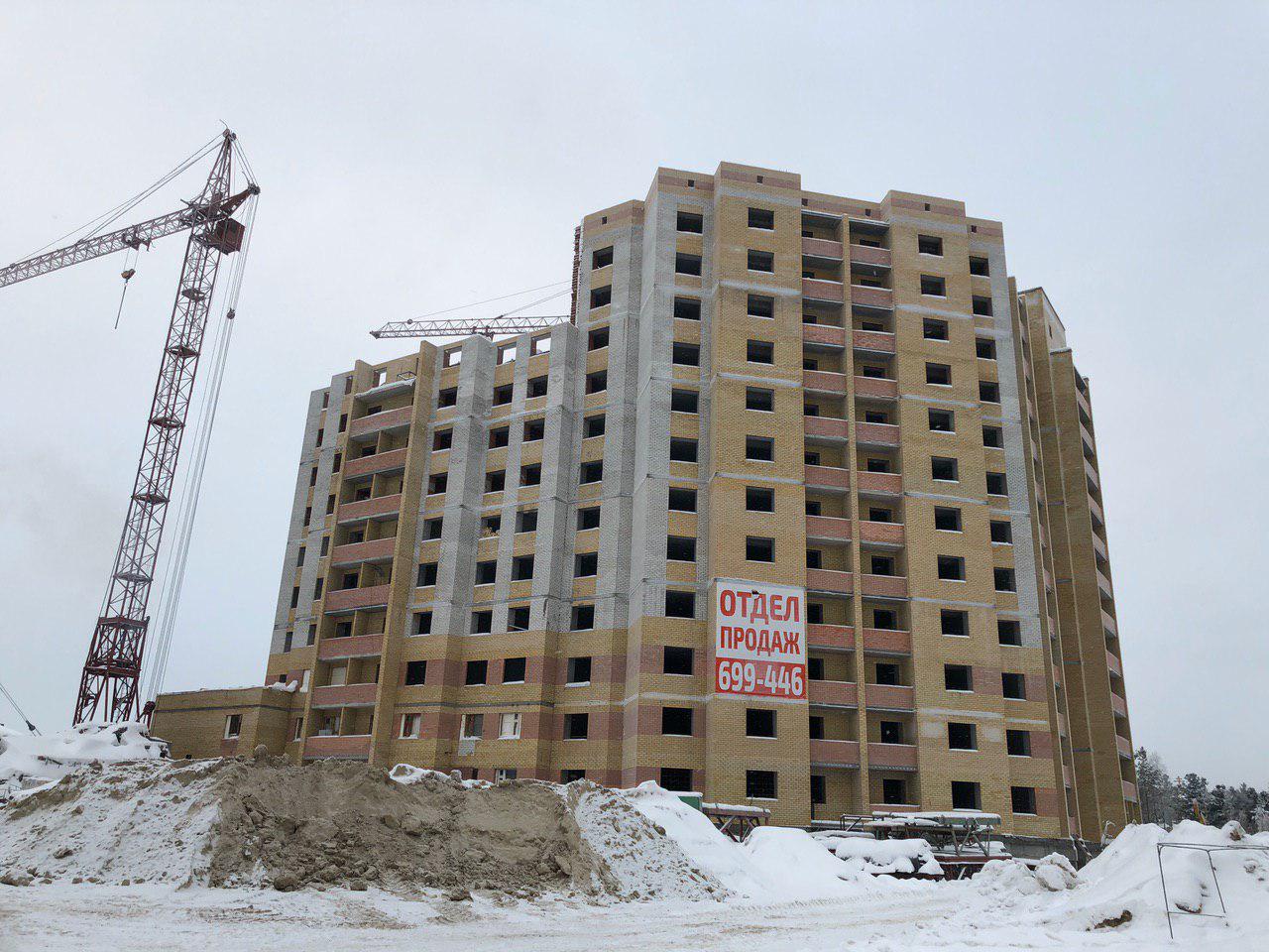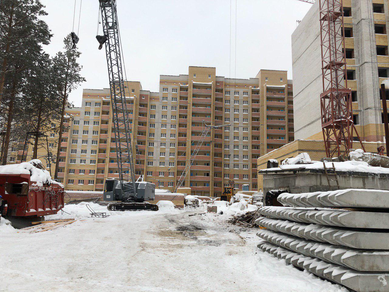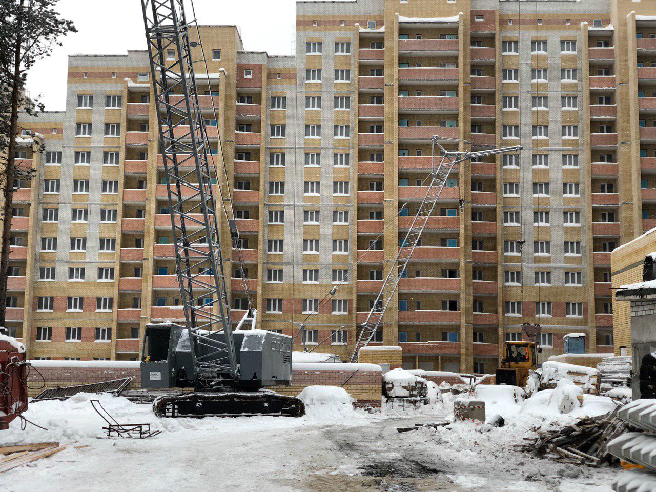 Ведется кладка ограждающих конструкций 10-го этажа 8 секции, а также 12 этажа 7 секции многоквартирного жилого дома. Работают краны, автотехника.